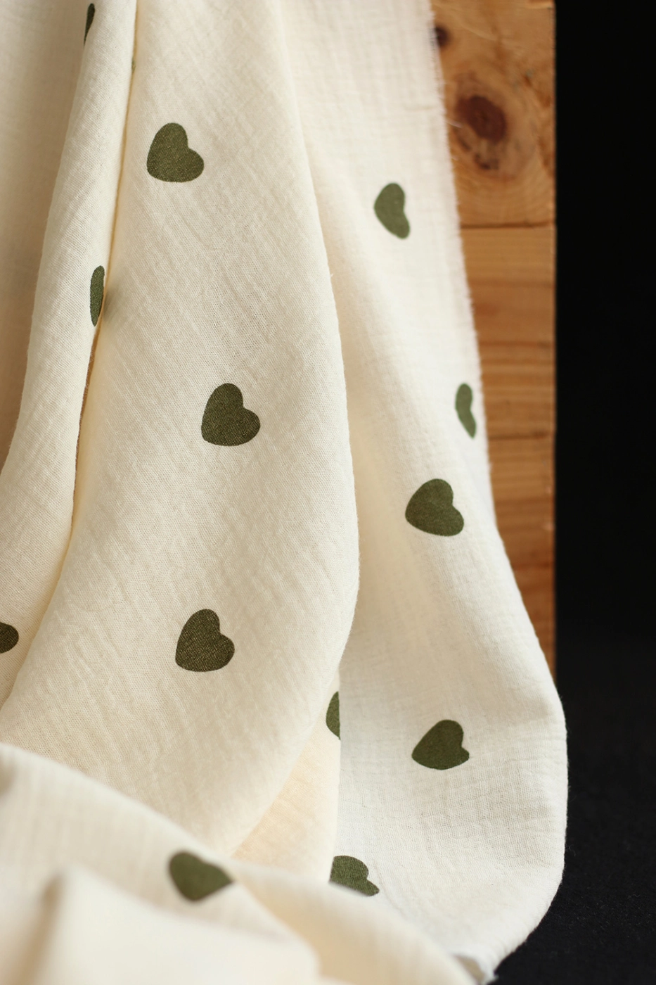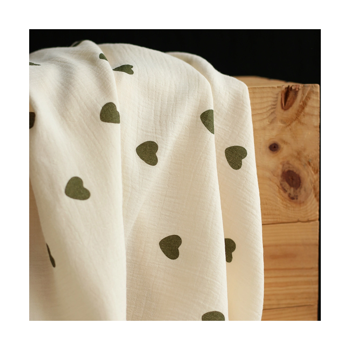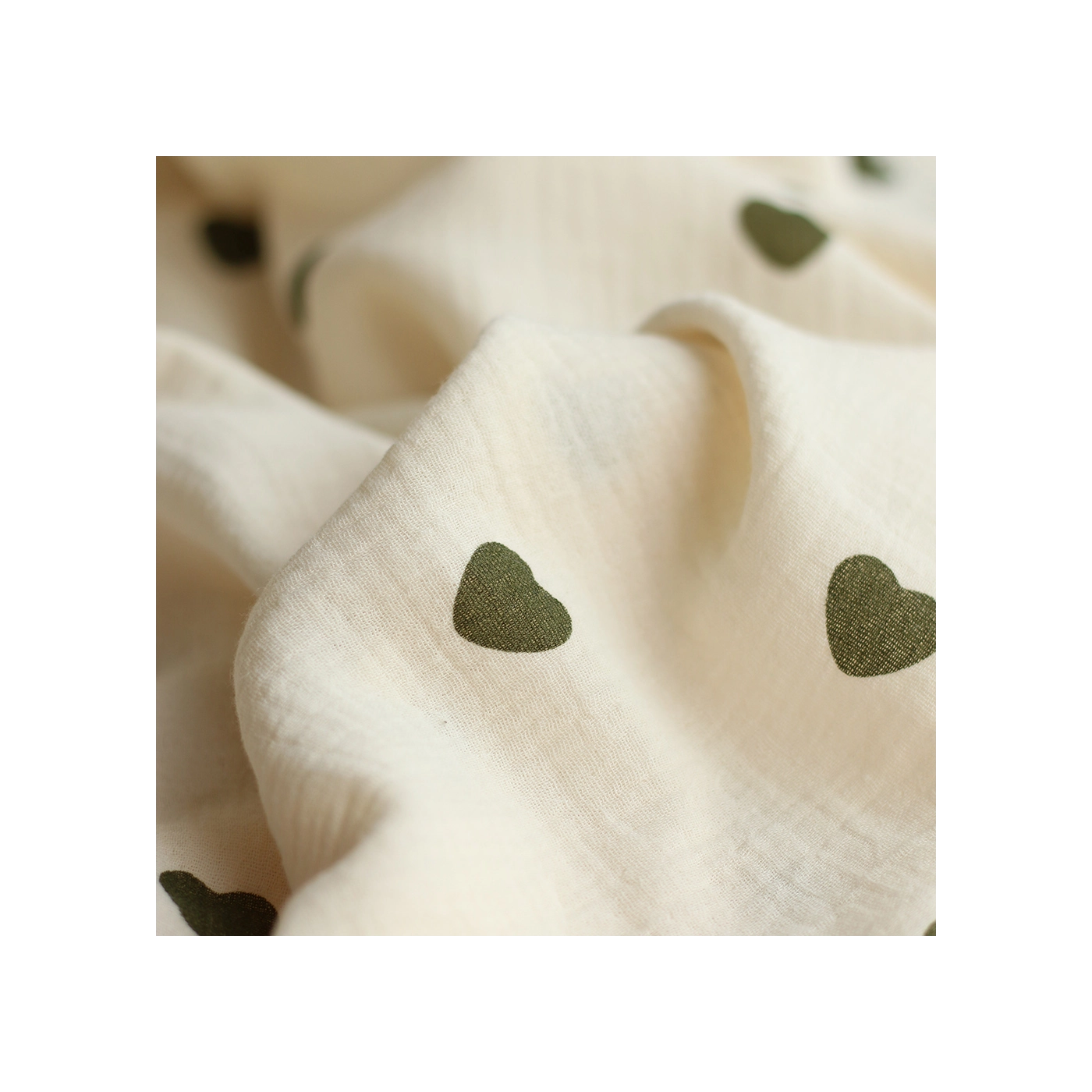 Coupon de 18 cm de Manou - Double gaze de coton BIO exclusif écru à motif coeurs vert olive