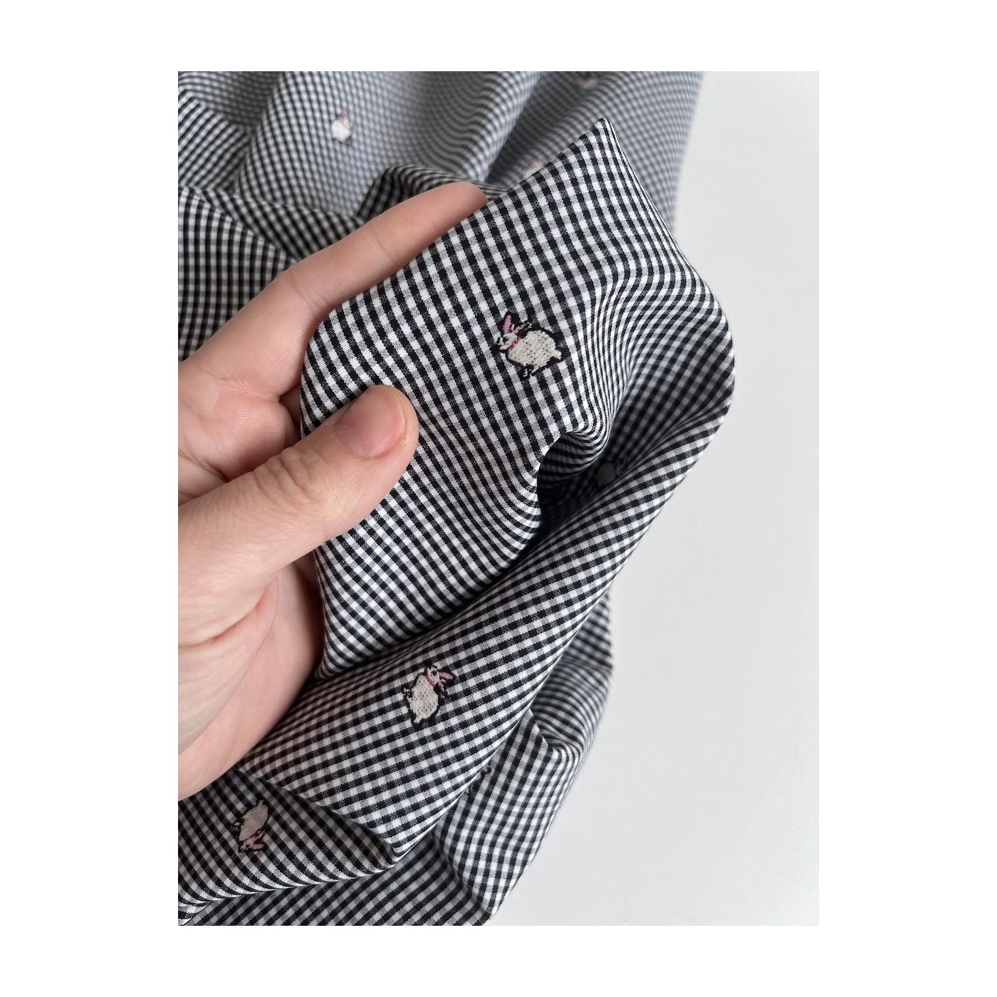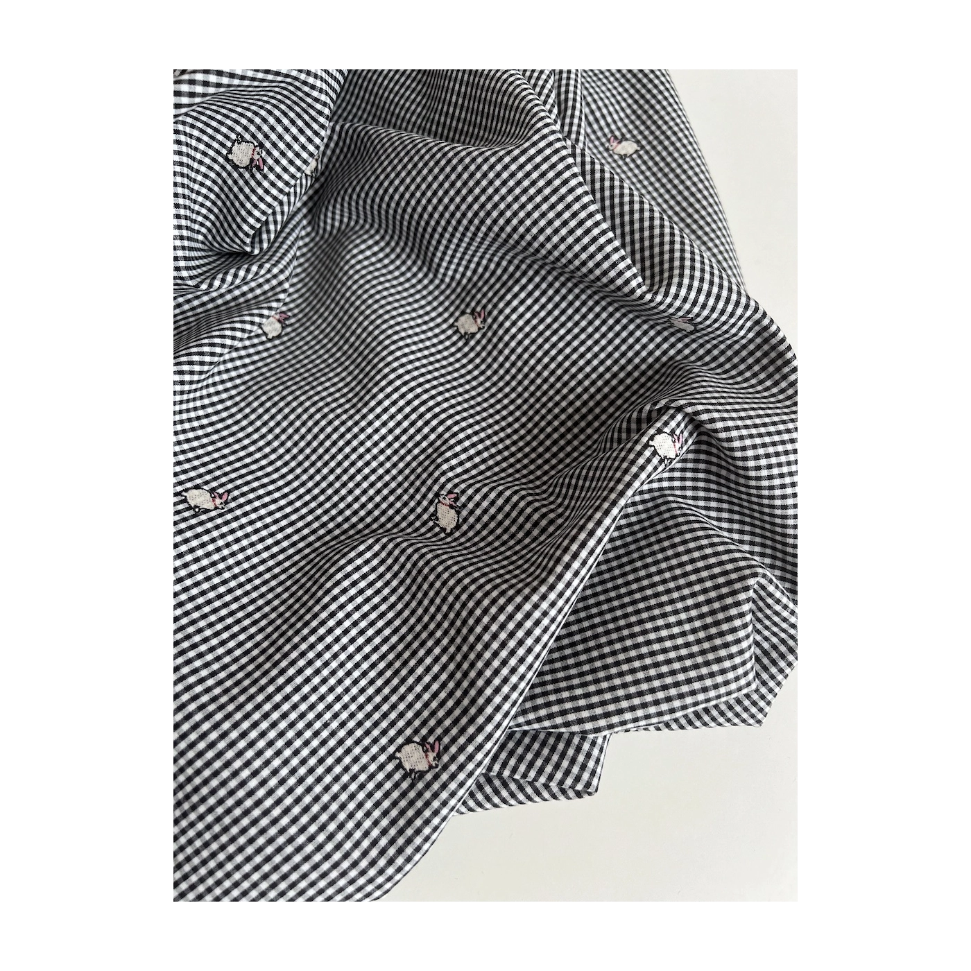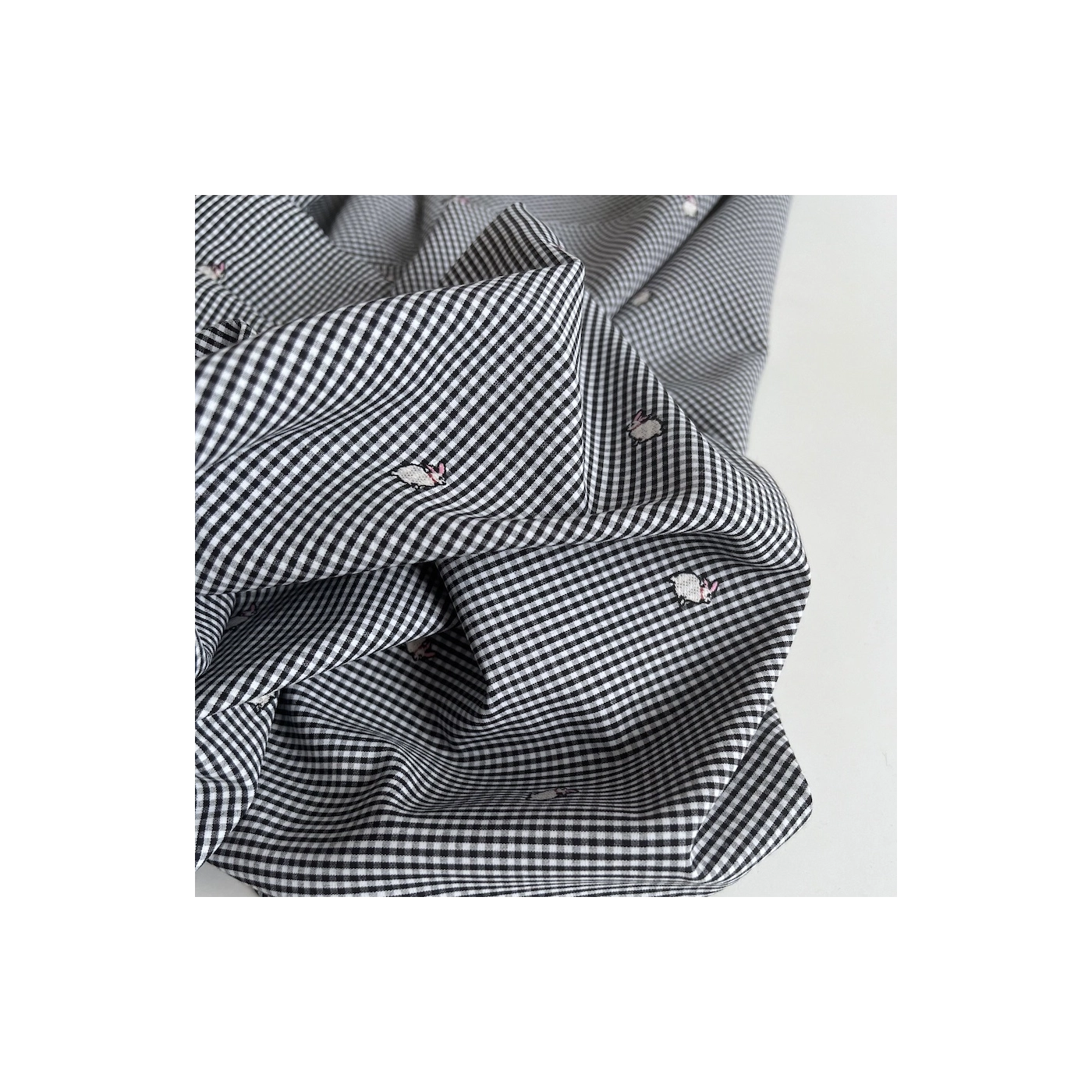 Popeline coton vichy 2mm noir et blanc broderies petits lapins environ 14mm