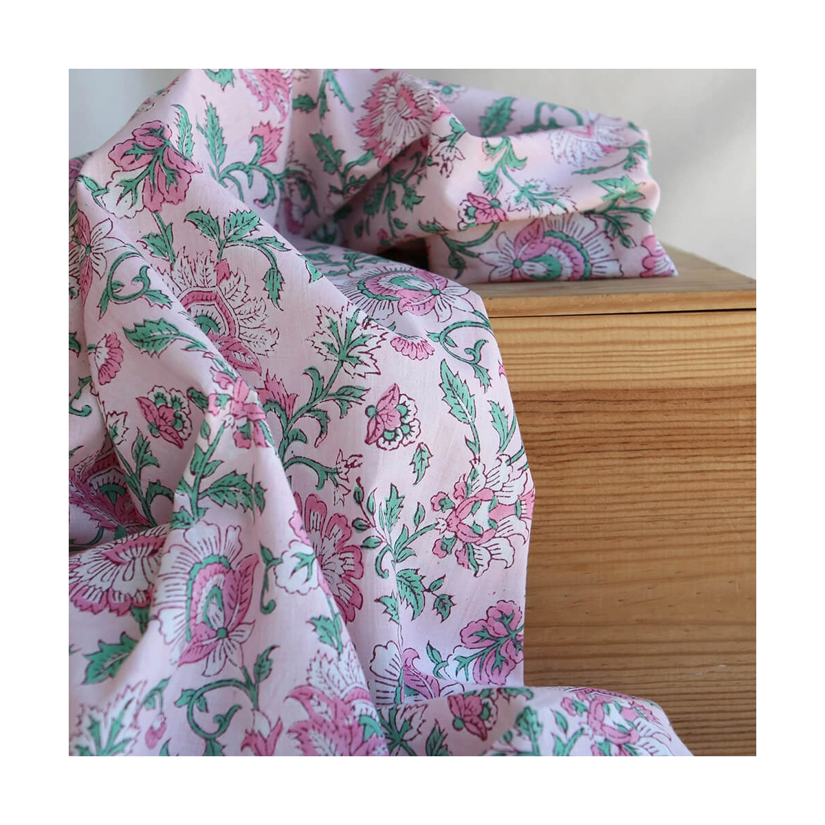 Le block print est un artisanat ancestral indien : le dessin est gravé sur un tampon en bois, chaque couleur nécessitant une étape d'impression distincte.