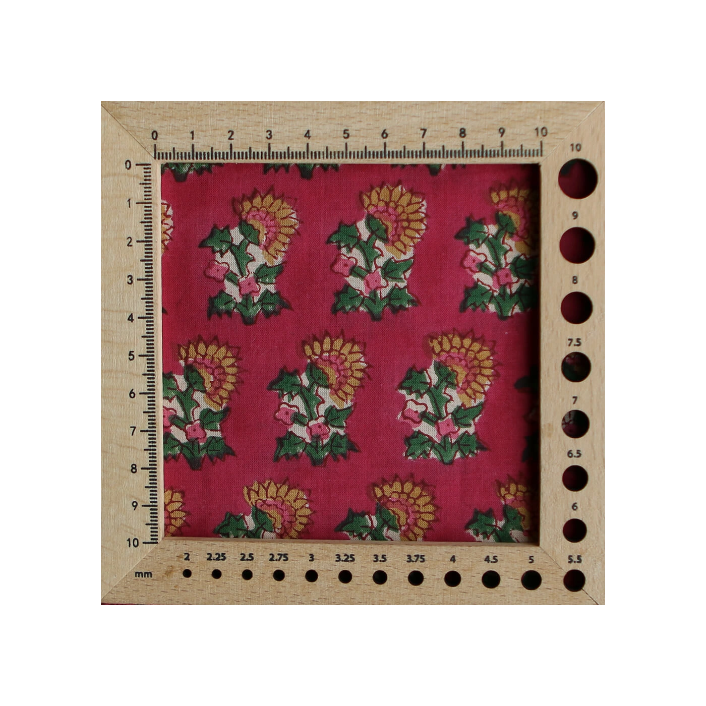 Les couleurs et les motifs apparaissent petit à petit en trempant le tampon en bois dans l'encre textile, puis en le frappant sur le tissu, répétant ce geste autant de fois que nécessaire pour remplir le coupon.