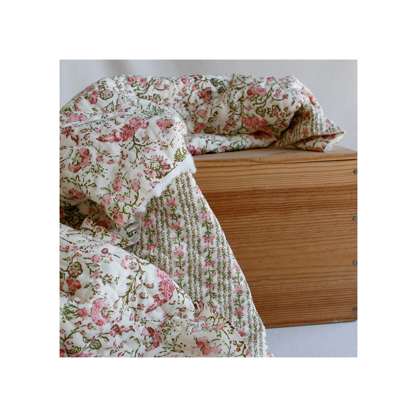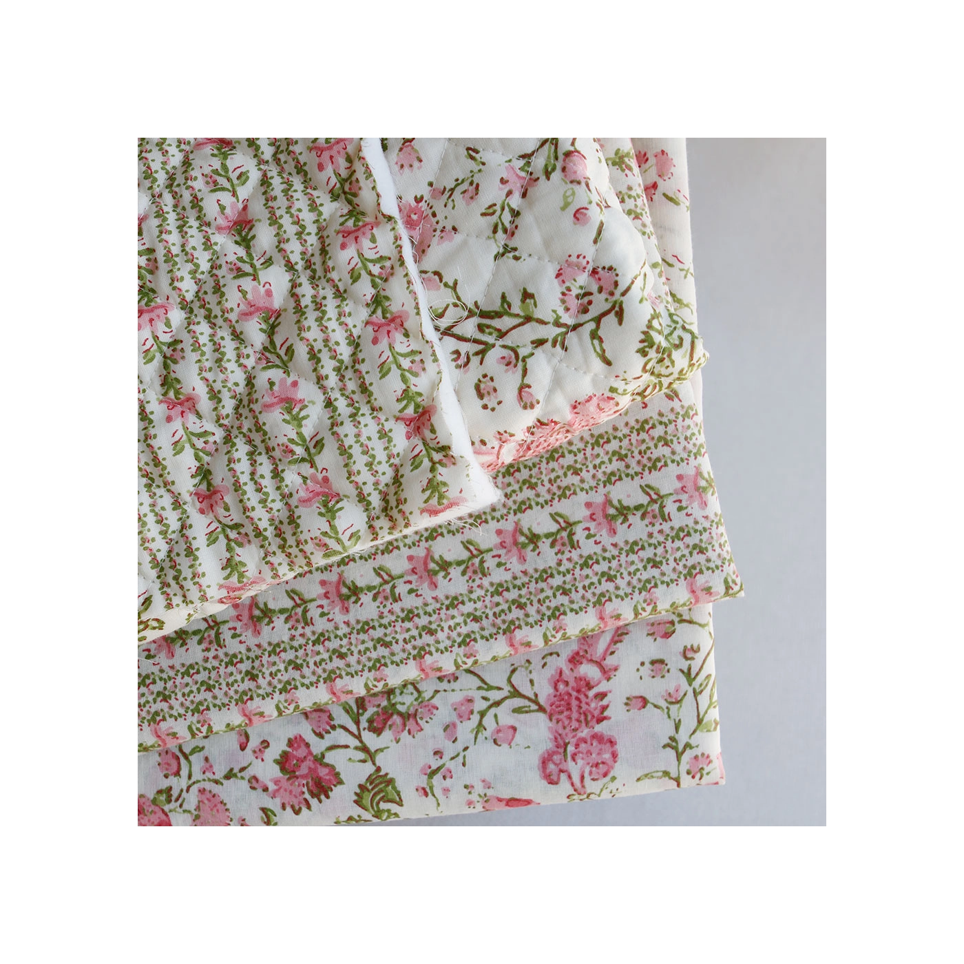 Nous avons décliné cette collection avec nos partenaires en Inde, afin de vous proposer pour le même motif le tissu en coton, et la version double face matelassée.
