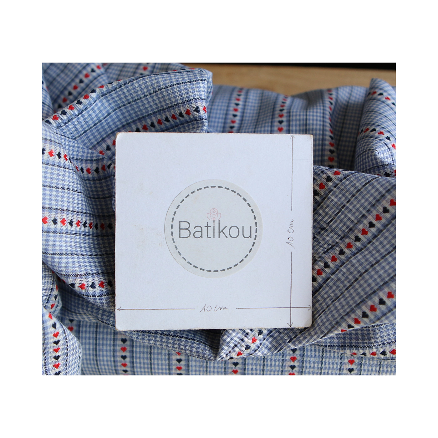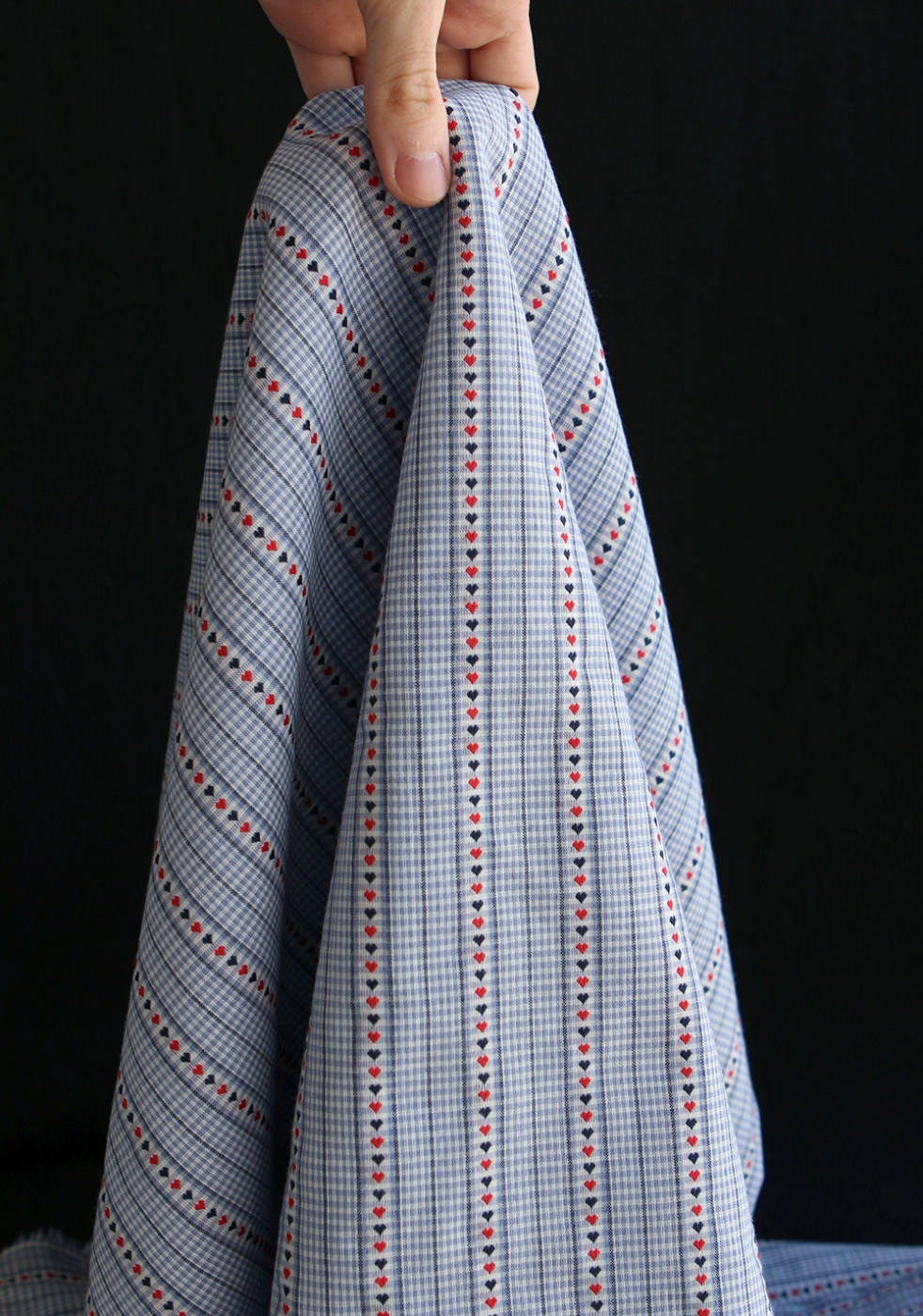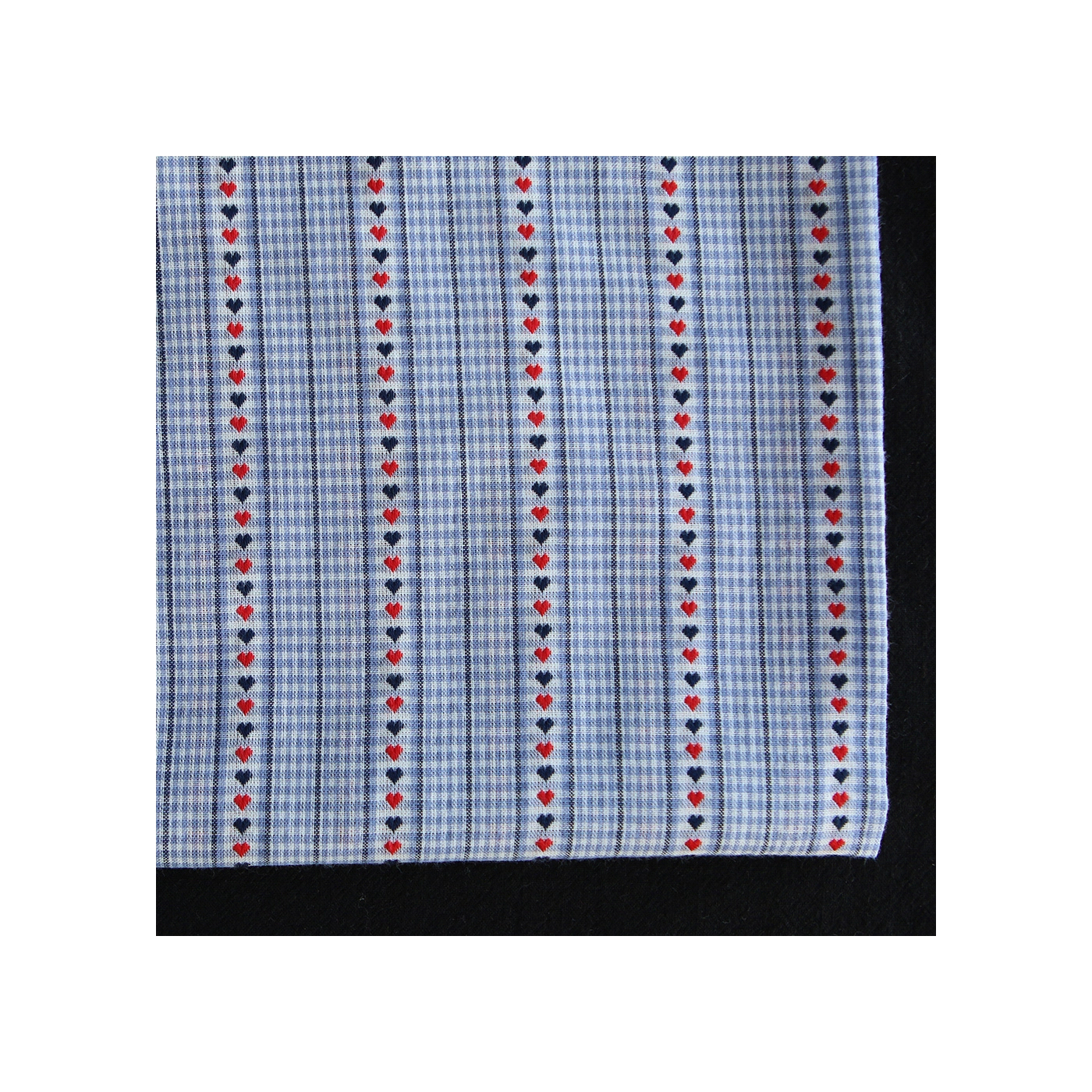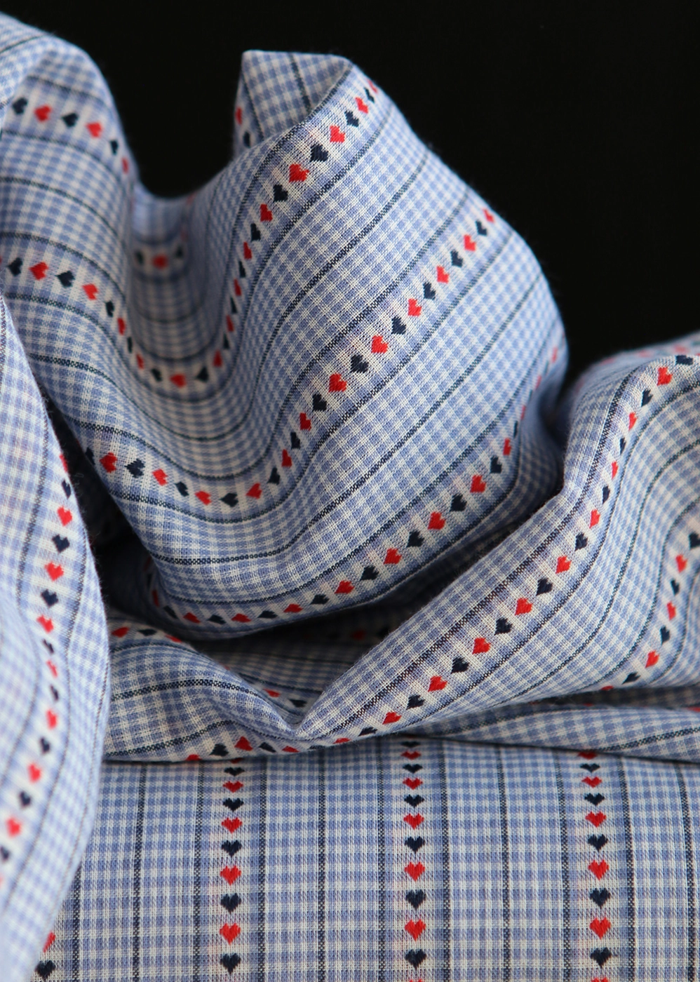 Coloris: mini vichy bleu avec des rayures de petits coeurs tissés
