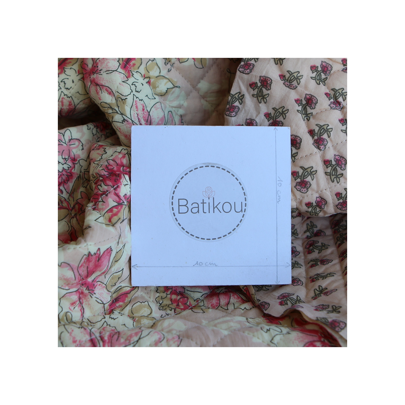 - A noter que le processus artisanal (impression à la main, au tampon en bois) de ce tissu fait que chaque pièce est unique et que l'impression ET le matelassage ne sont pas aussi parfaits qu'un processus industriel.