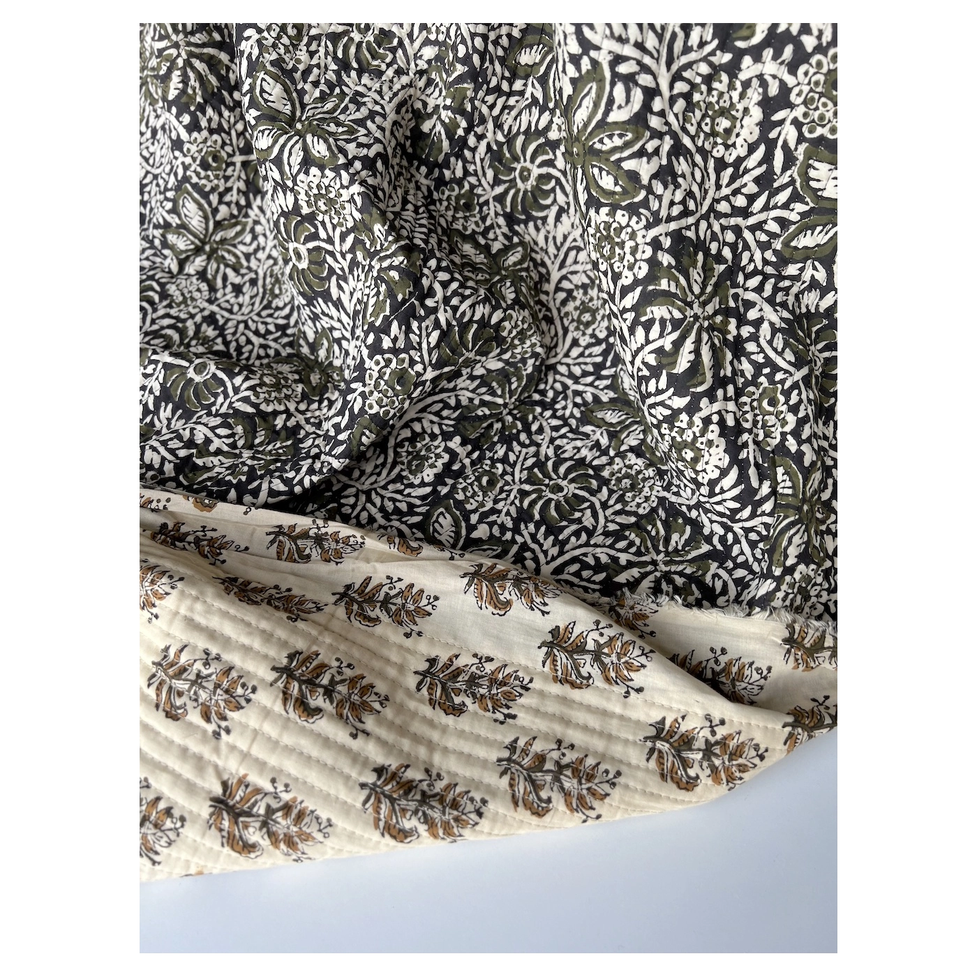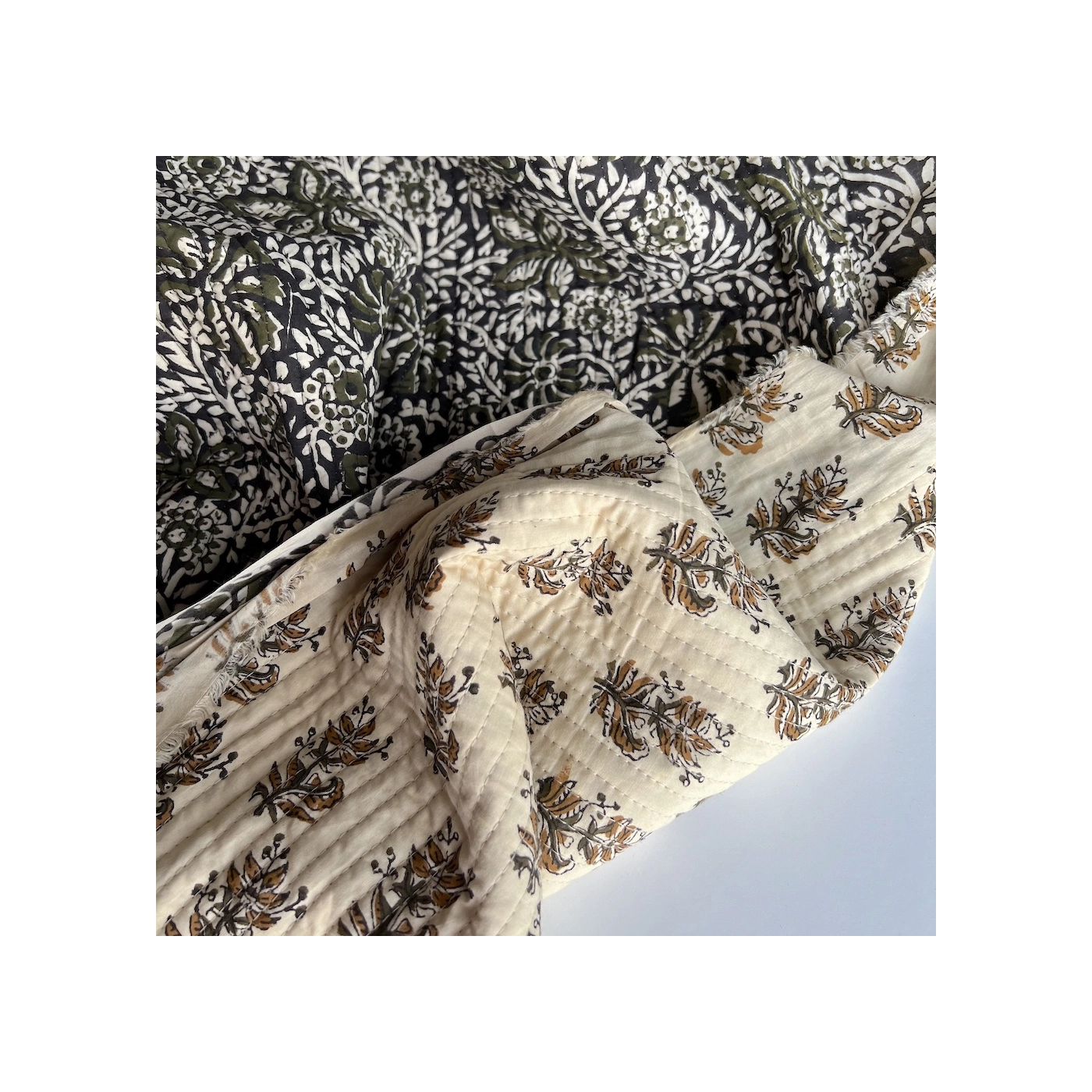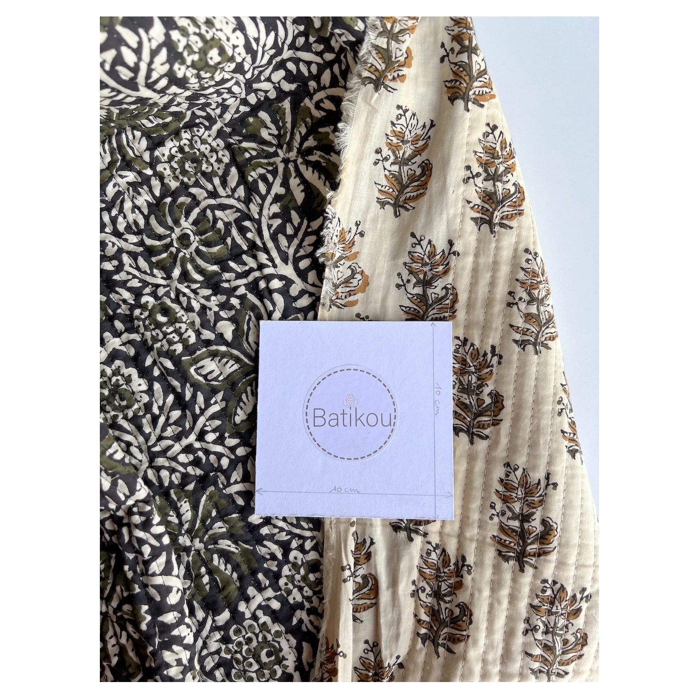 Nous avons décliné cette collection avec nos partenaires en Inde, afin de vous proposer pour le même motif le tissu en coton, et la version double face matelassée.