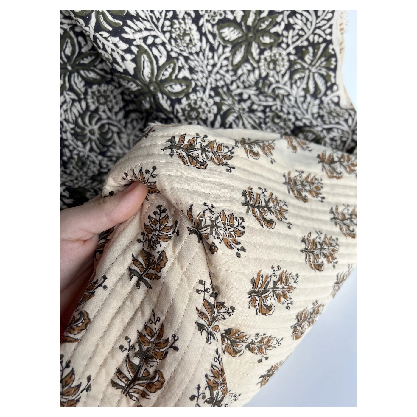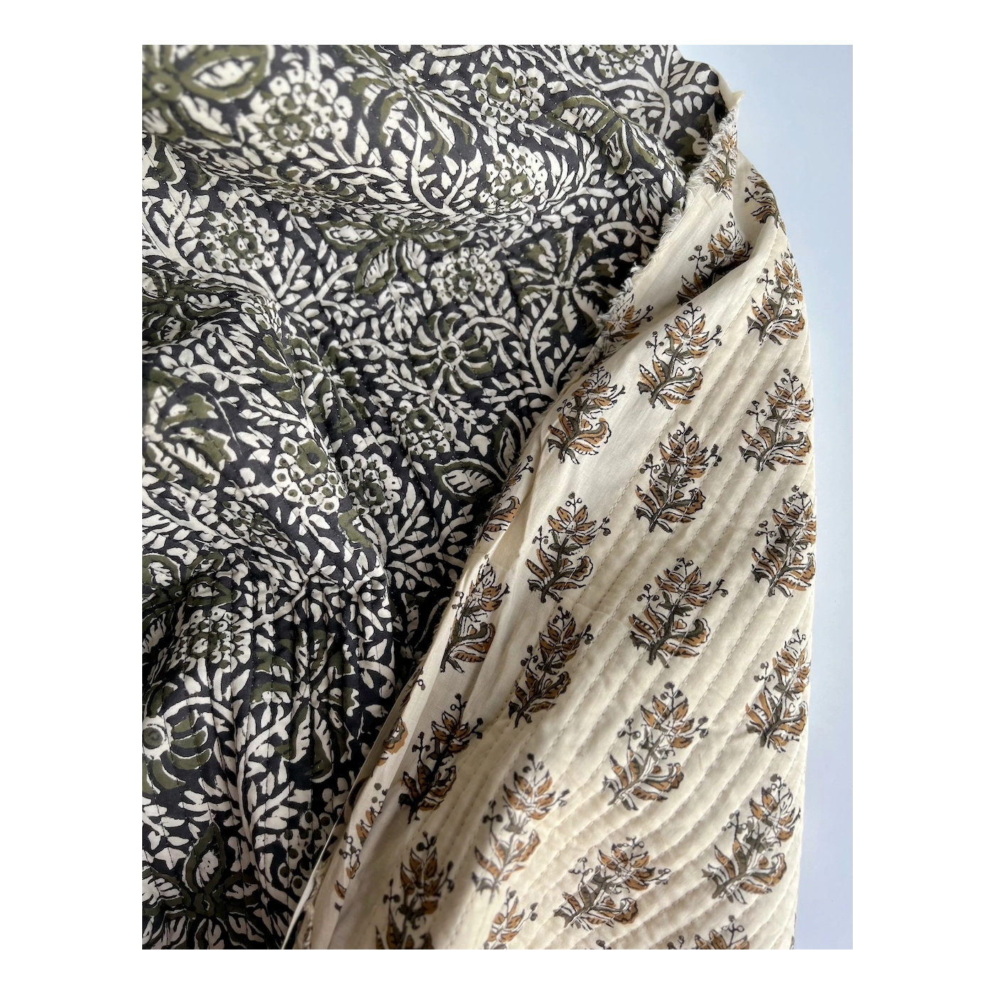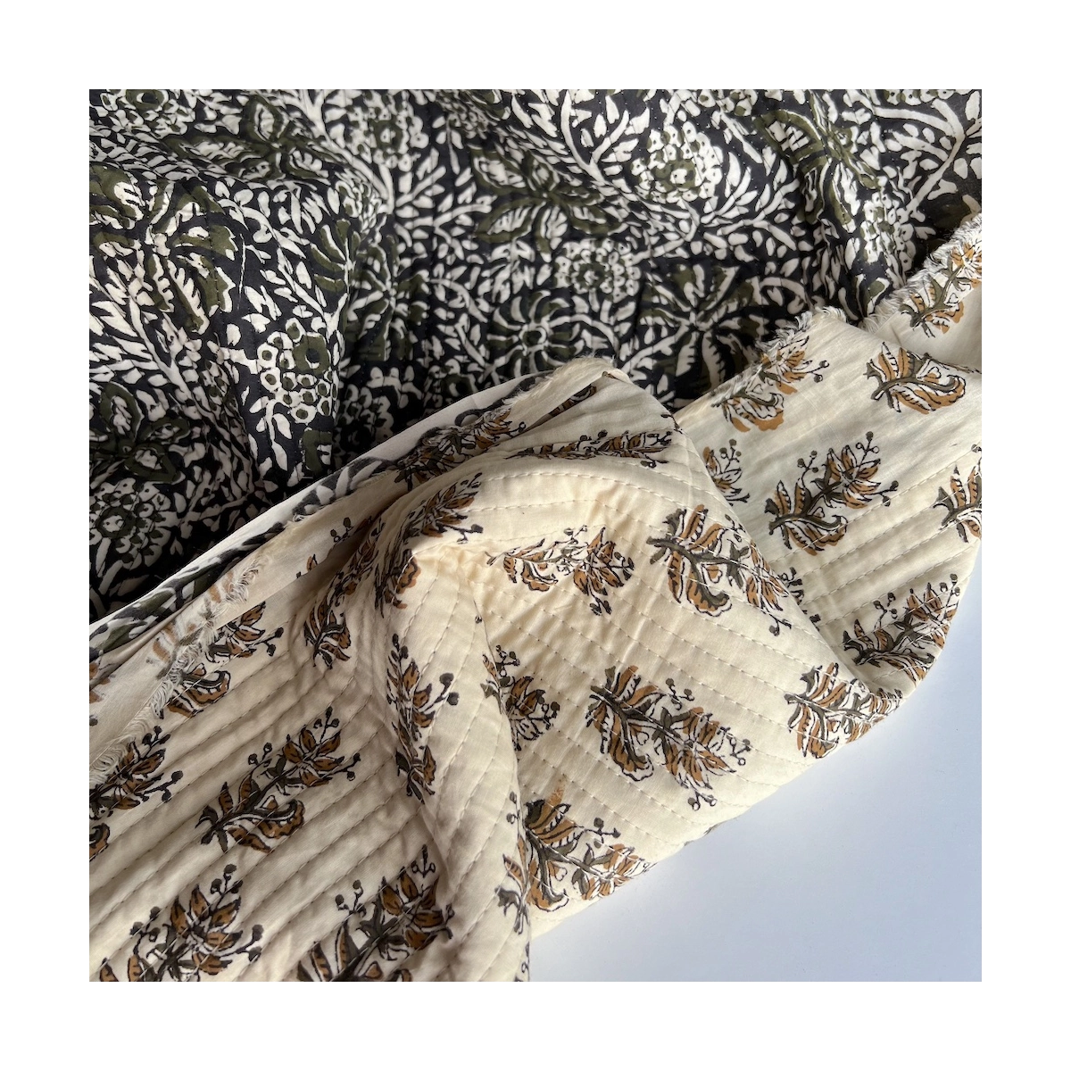 Nous avons décliné cette collection avec nos partenaires en Inde, afin de vous proposer pour le même motif le tissu en coton, et la version double face matelassée.