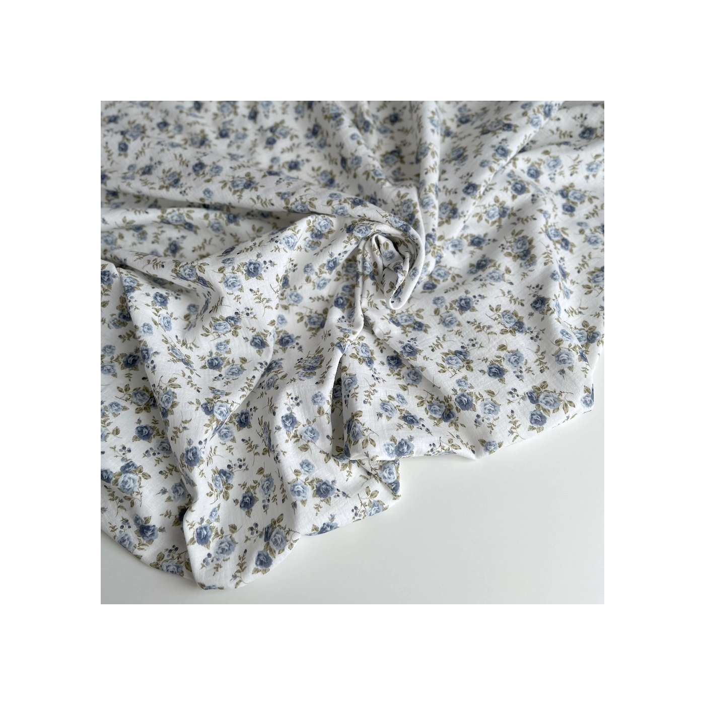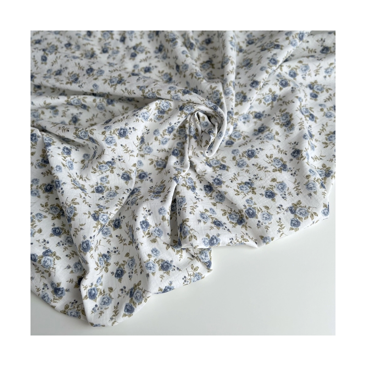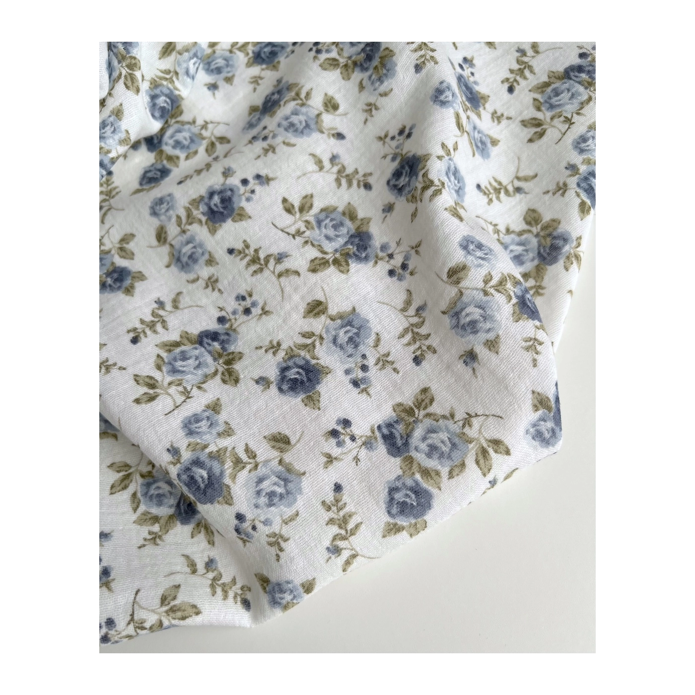 Coloris: fond blanc à motif roses fanées coloris bleu / vert
