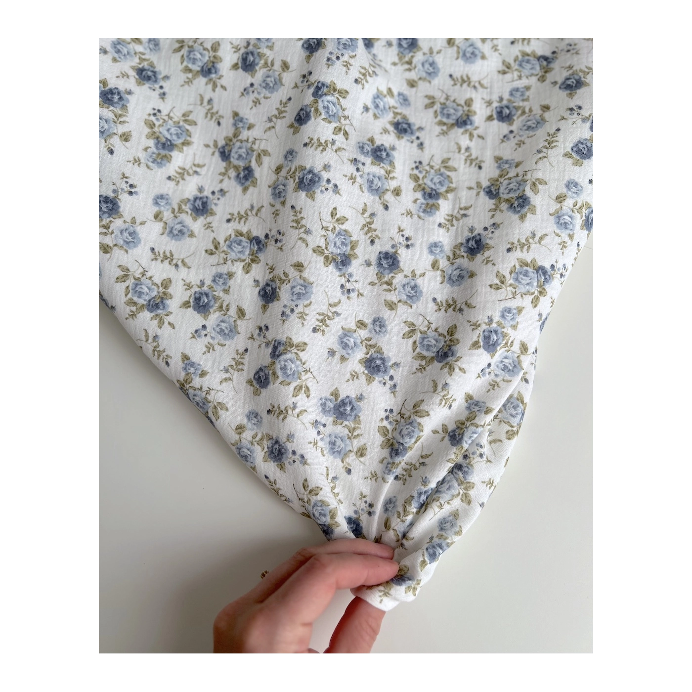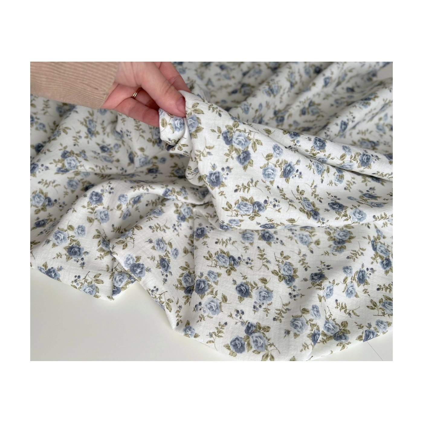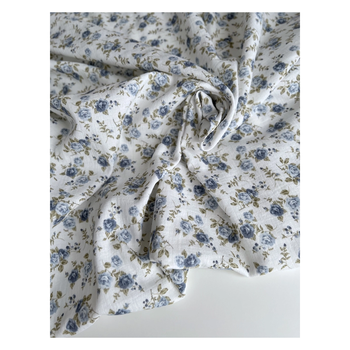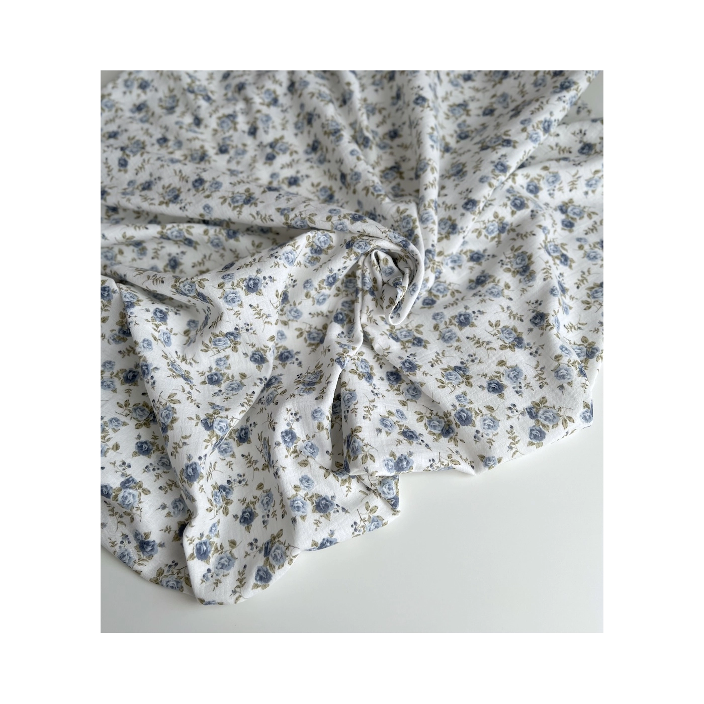 Coloris: fond blanc à motif roses fanées coloris bleu / vert