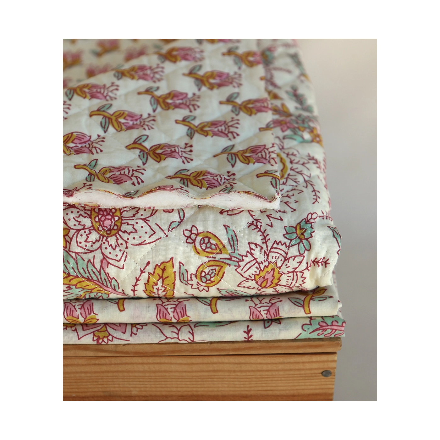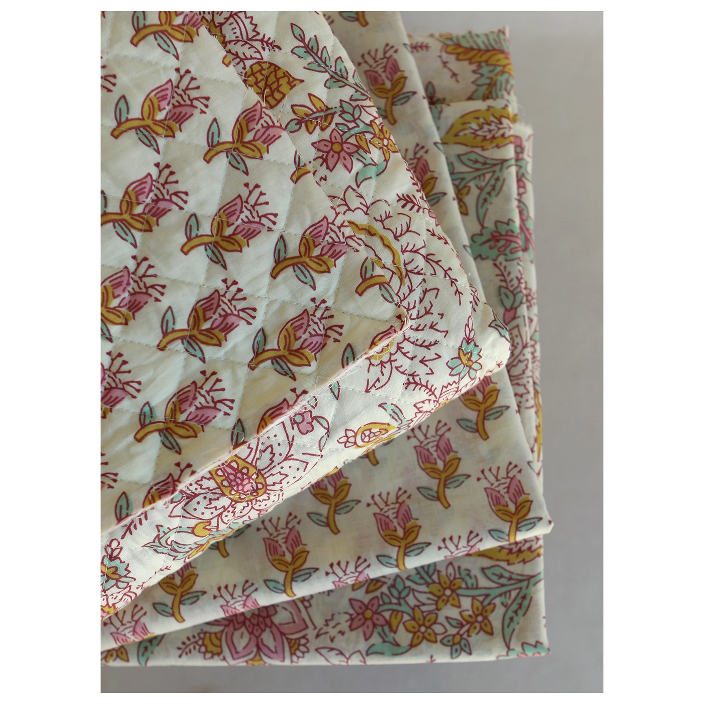 A noter que le processus artisanal (impression à la main, au tampon en bois) de ce tissu fait que chaque pièce est unique et que l'impression n'est pas aussi parfaite qu'un processus industriel.