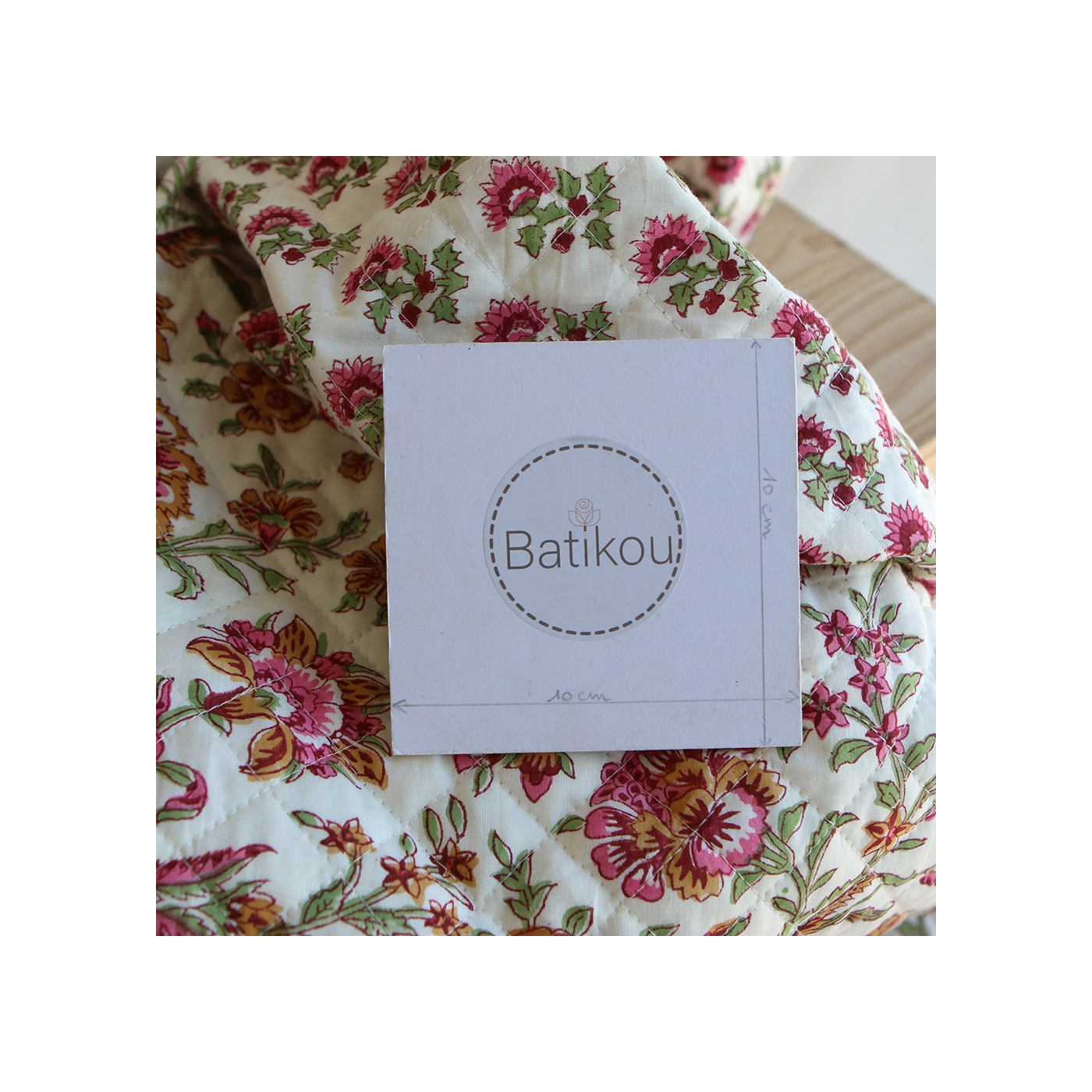 - A noter que le processus artisanal (impression à la main, au tampon en bois) de ce tissu fait que chaque pièce est unique et que l'impression ET le matelassage ne sont pas aussi parfaits qu'un processus industriel.