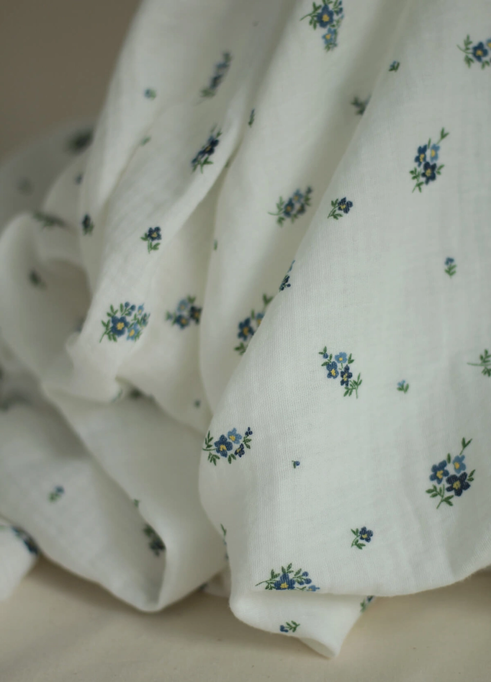 Coloris: blanc lait à motif exclusif Laure, fleurs bleu myosotis