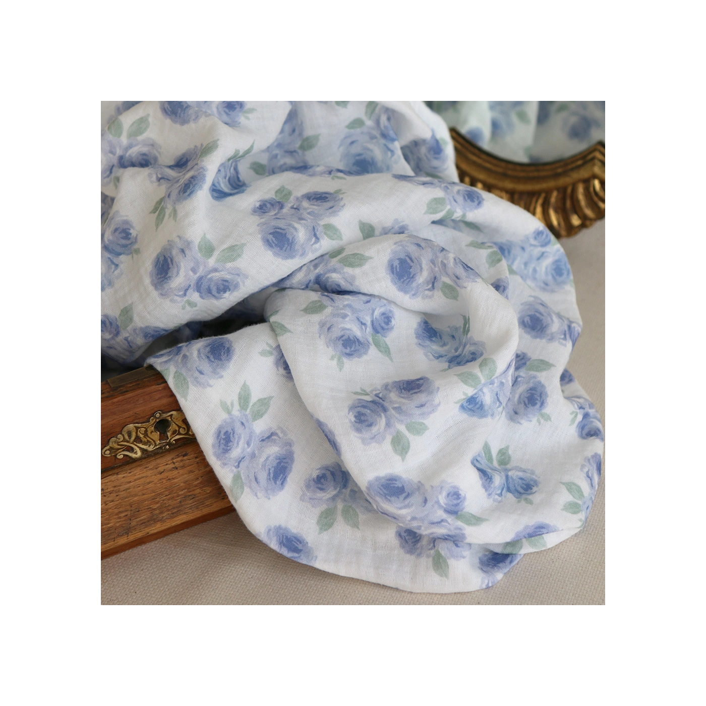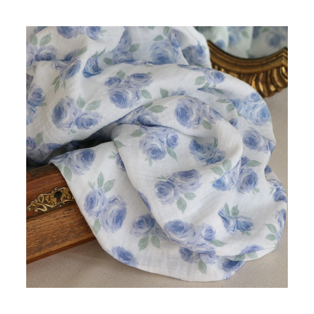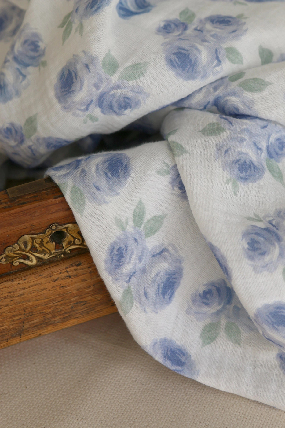 Coupon de 43 cm de Assia - Double gaze de coton motif exclusif fond blanc cassé aquarelle bleu