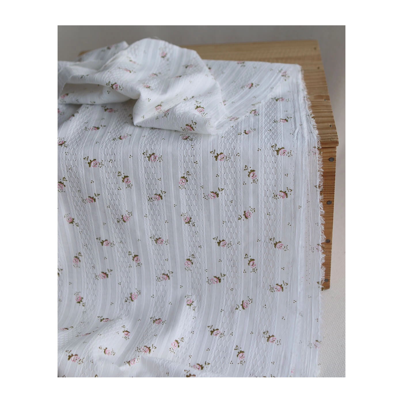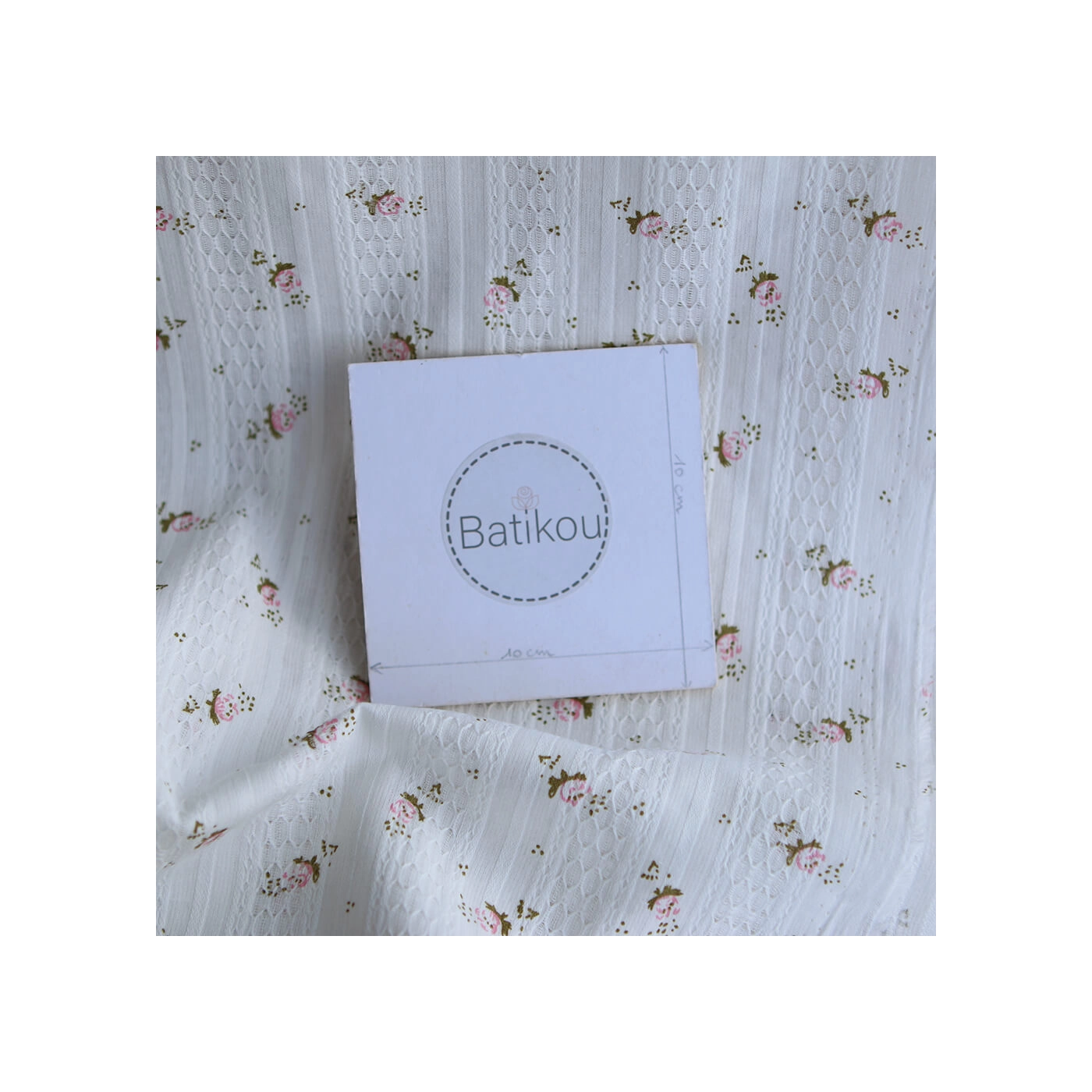 Ce tissu est un coton jacquard de 96 gr/m2. Son tissage lui apporte un relief subtil et une texture plus travaillée qu’un coton lisse classique, tout en conservant de la souplesse et un tombé agréable. On retrouve sur ce modèle un fond blanc lumineux, parcouru de petites fleurs dans des tons rose et de feuillages vert sauge. Avec sa largeur de 140 cm, il convient à de nombreux projets couture, aussi bien pour l’habillement que pour des accessoires délicats.