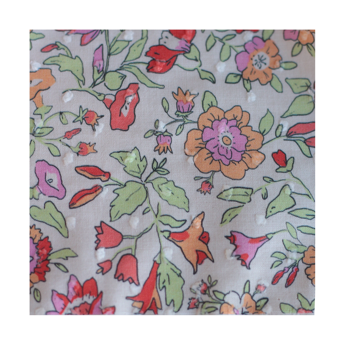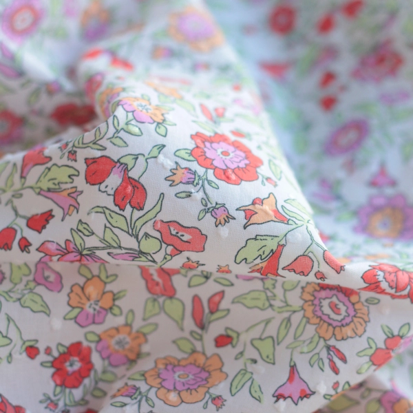 Léona - Plumetis de coton parme imprimé fleuri rouge orangé