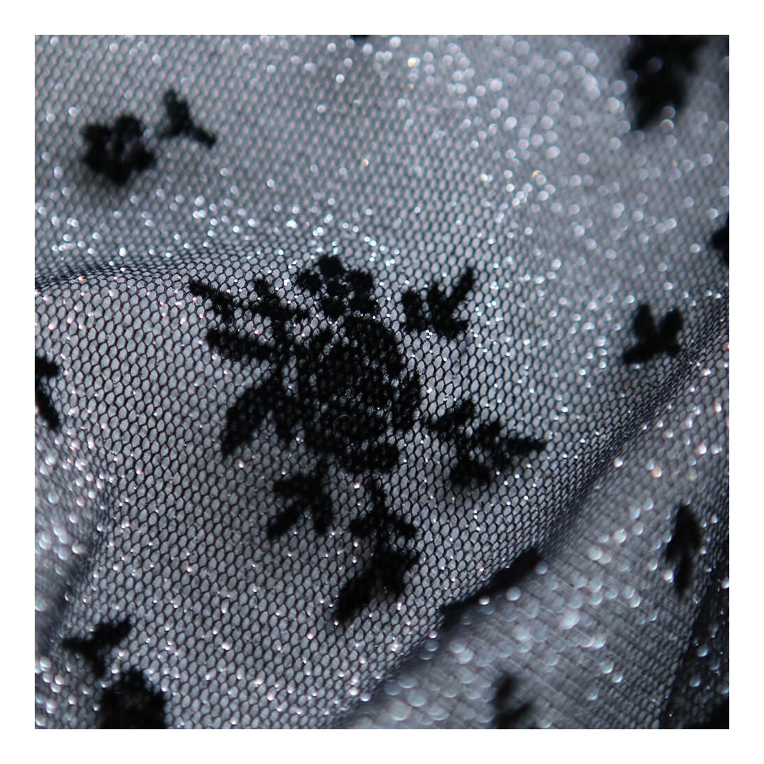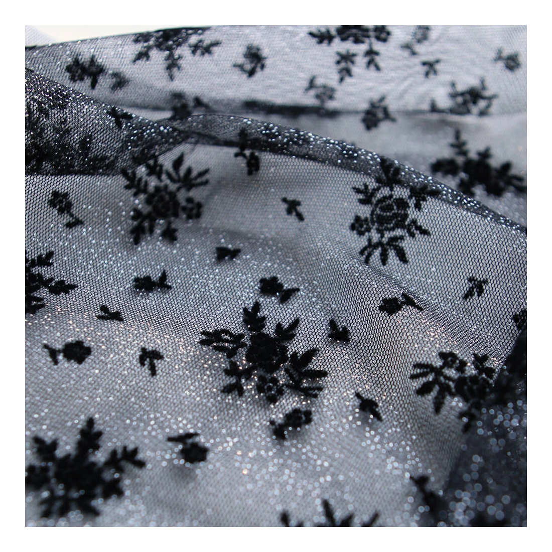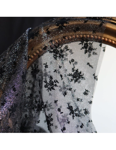 Tulle souple Made in France noir / argenté floqué fleurs velours noir