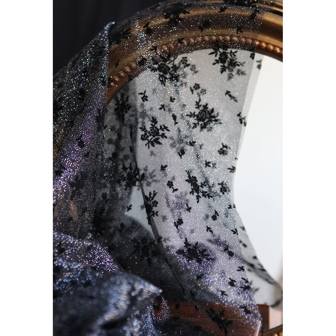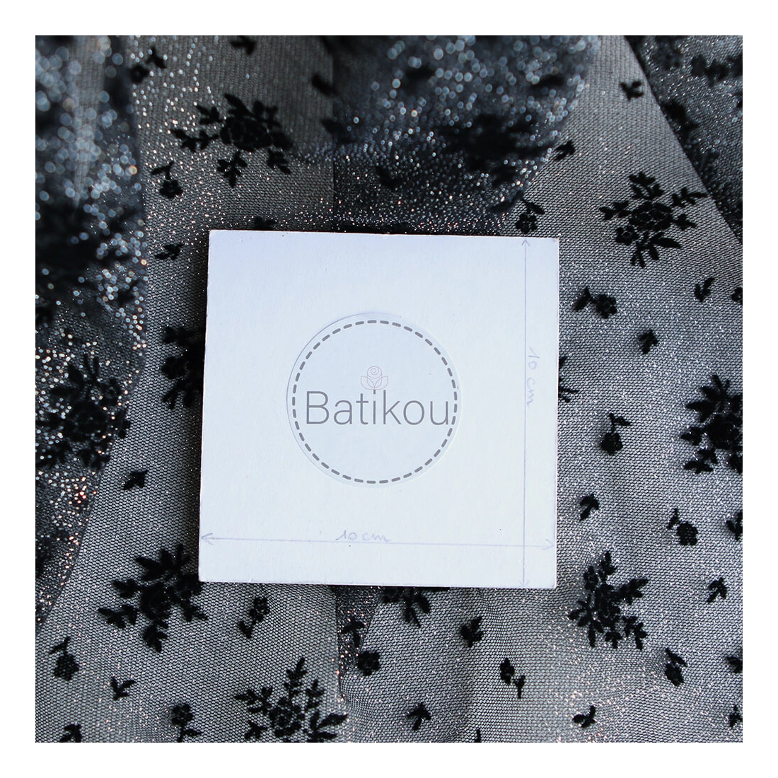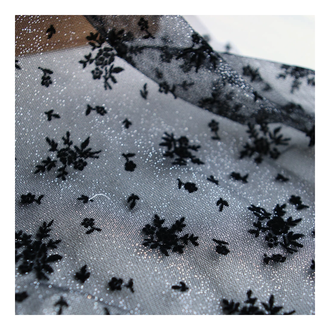 Coloris: noir, paillettes argentées, floqué de fleurs en velours noir