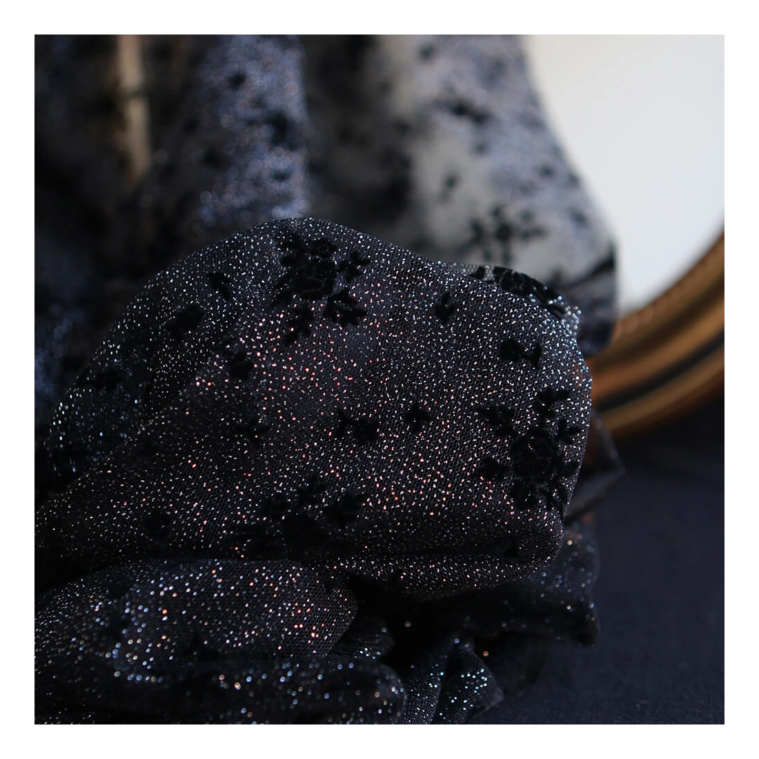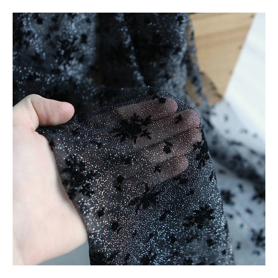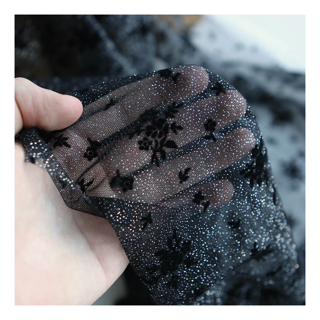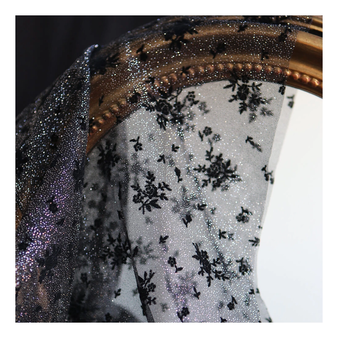 Coloris: noir, paillettes argentées, floqué de fleurs en velours noir