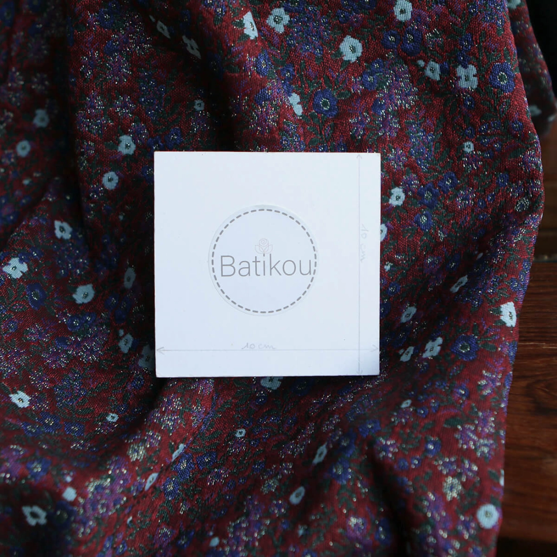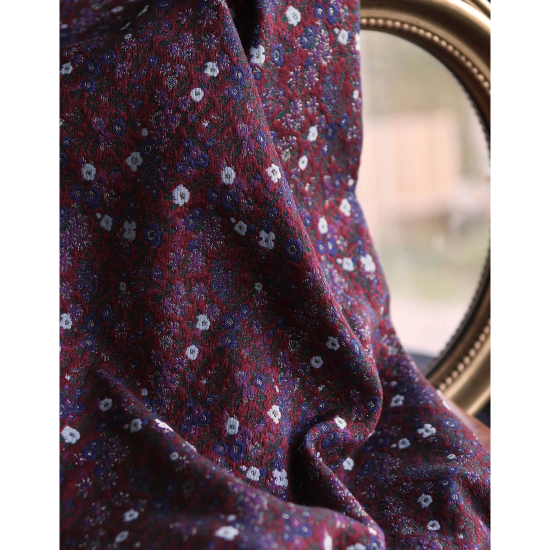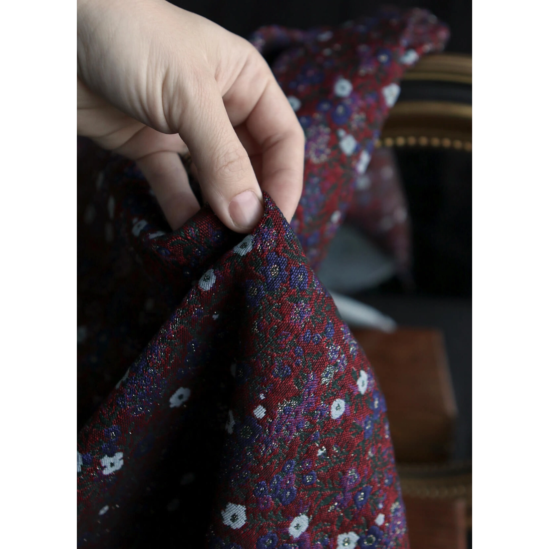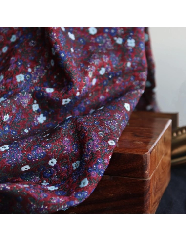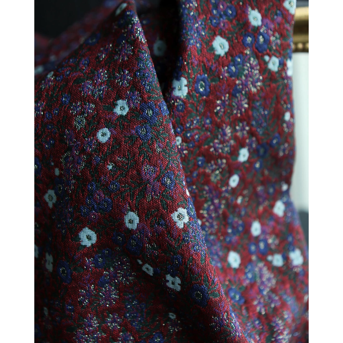 Azalée - Tissu jacquard fond rouge / fleuri bleu et doré made in France