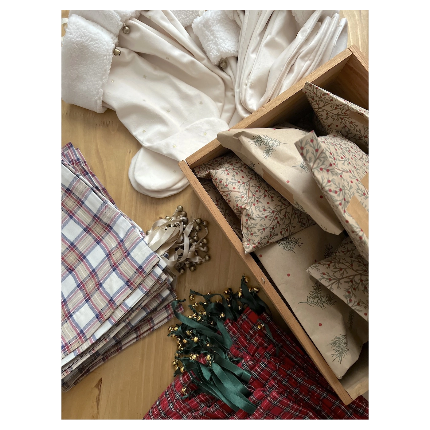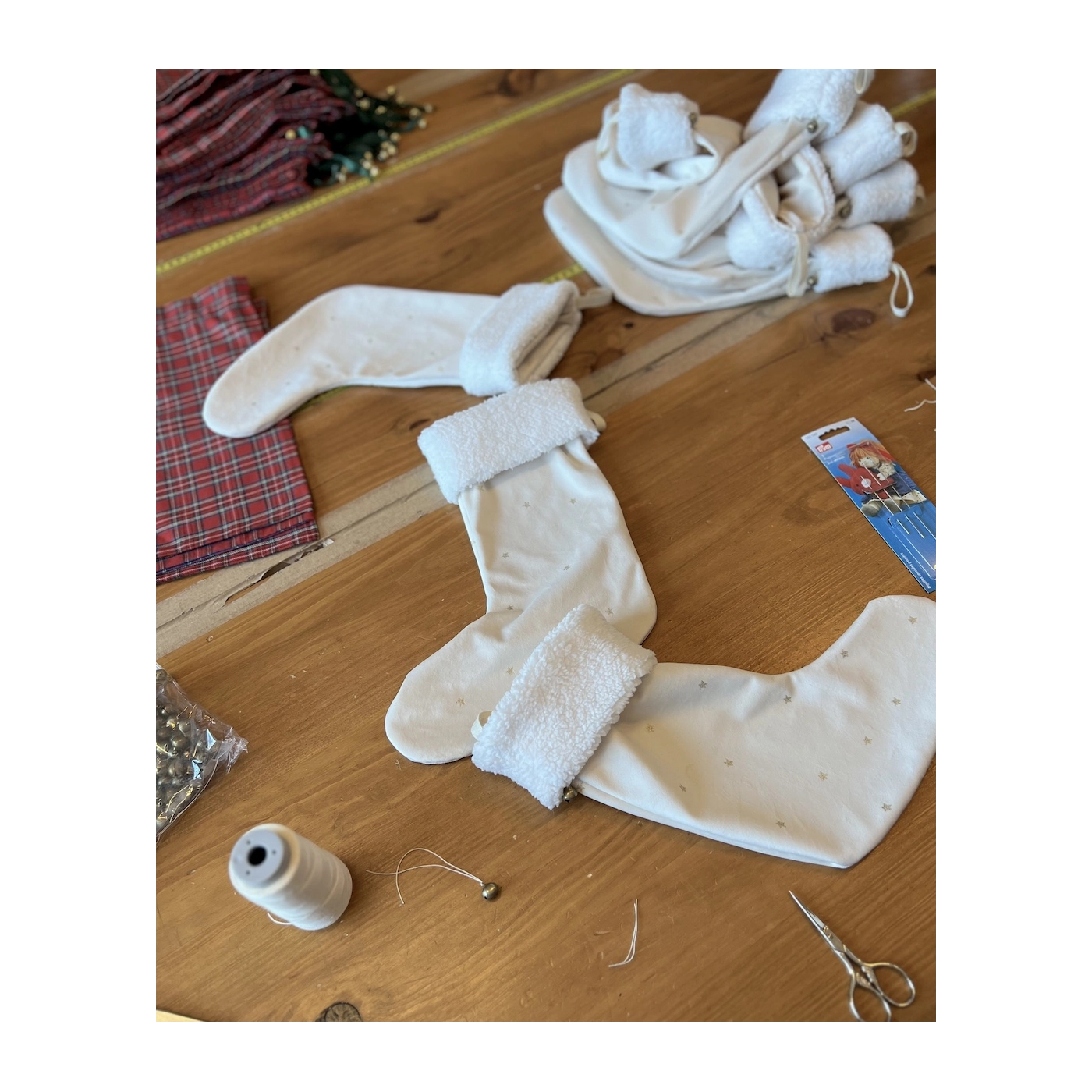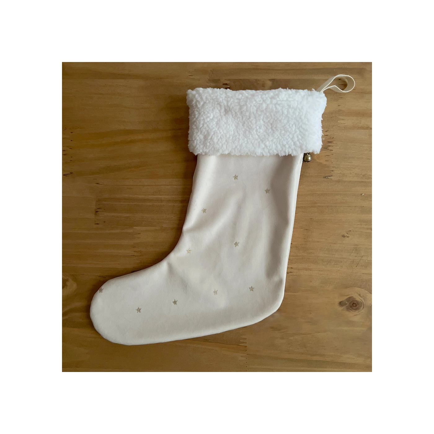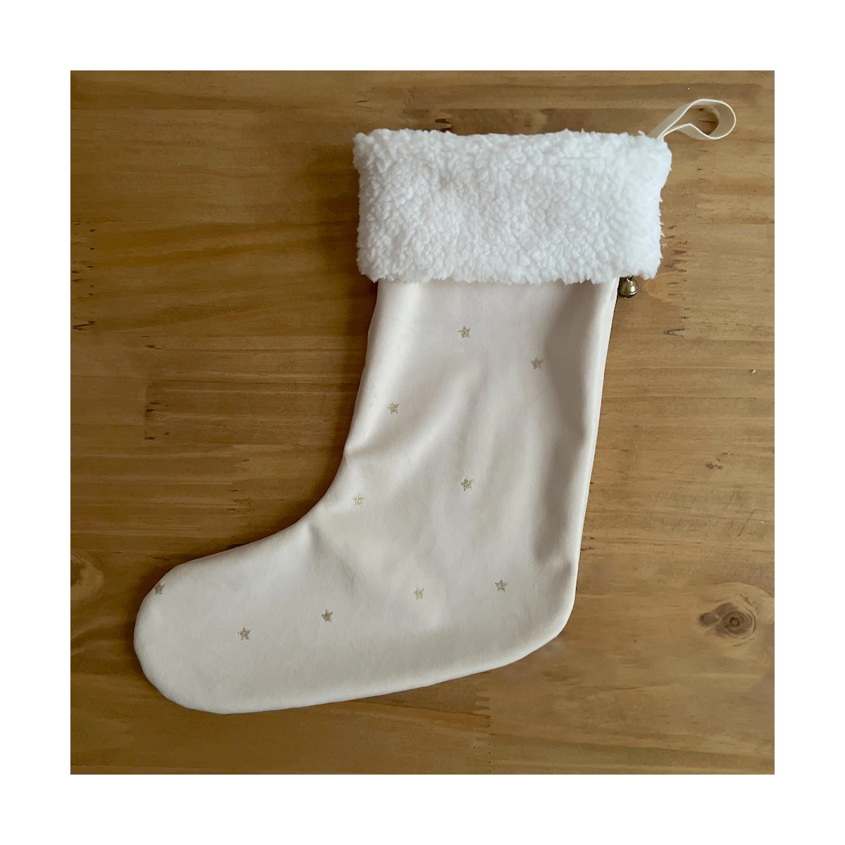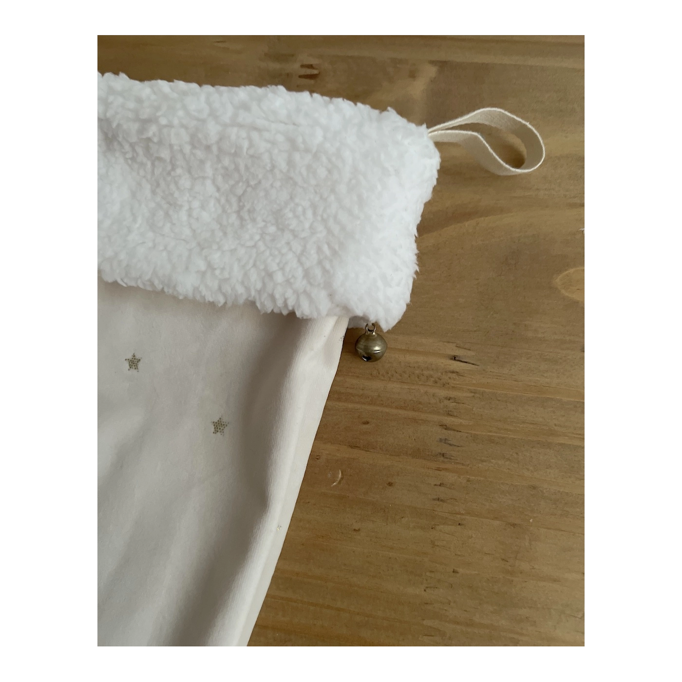 Tissu velours ras écru avec de petites étoiles parsemées, moumoute blanche et finition petit grelot métallique.