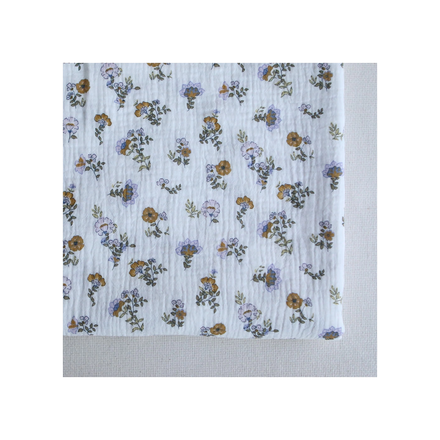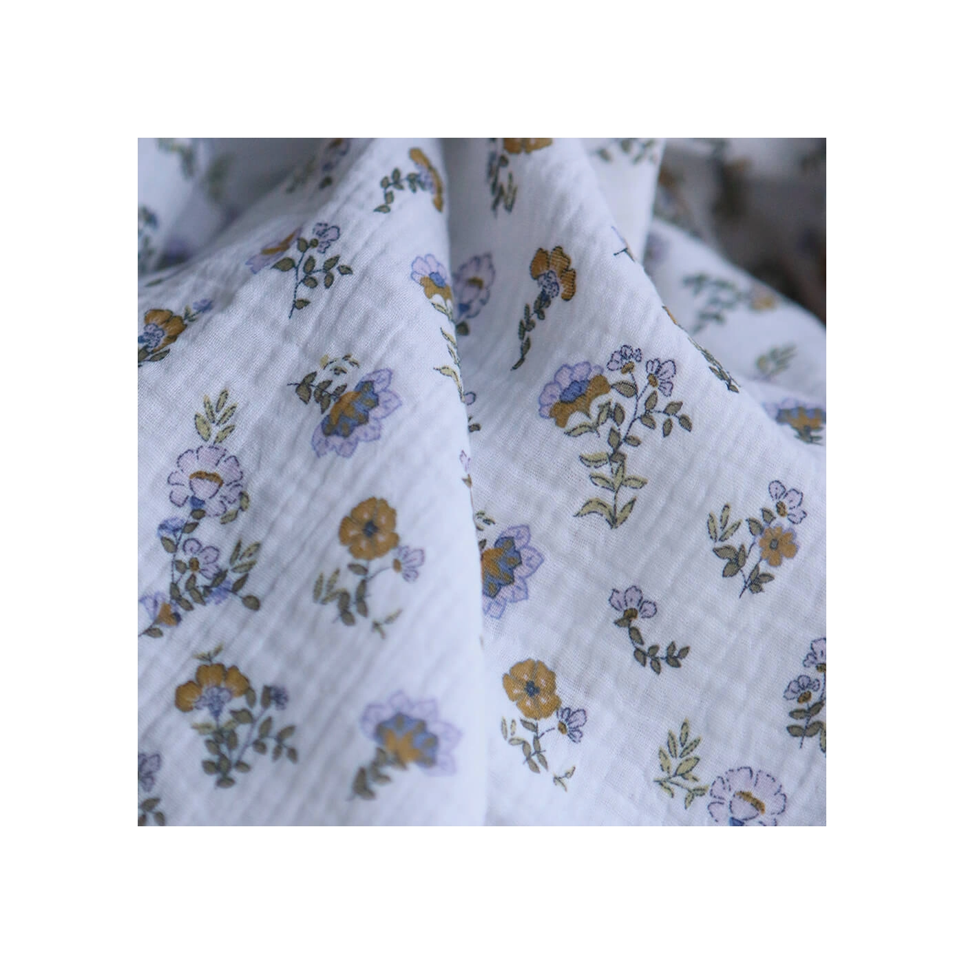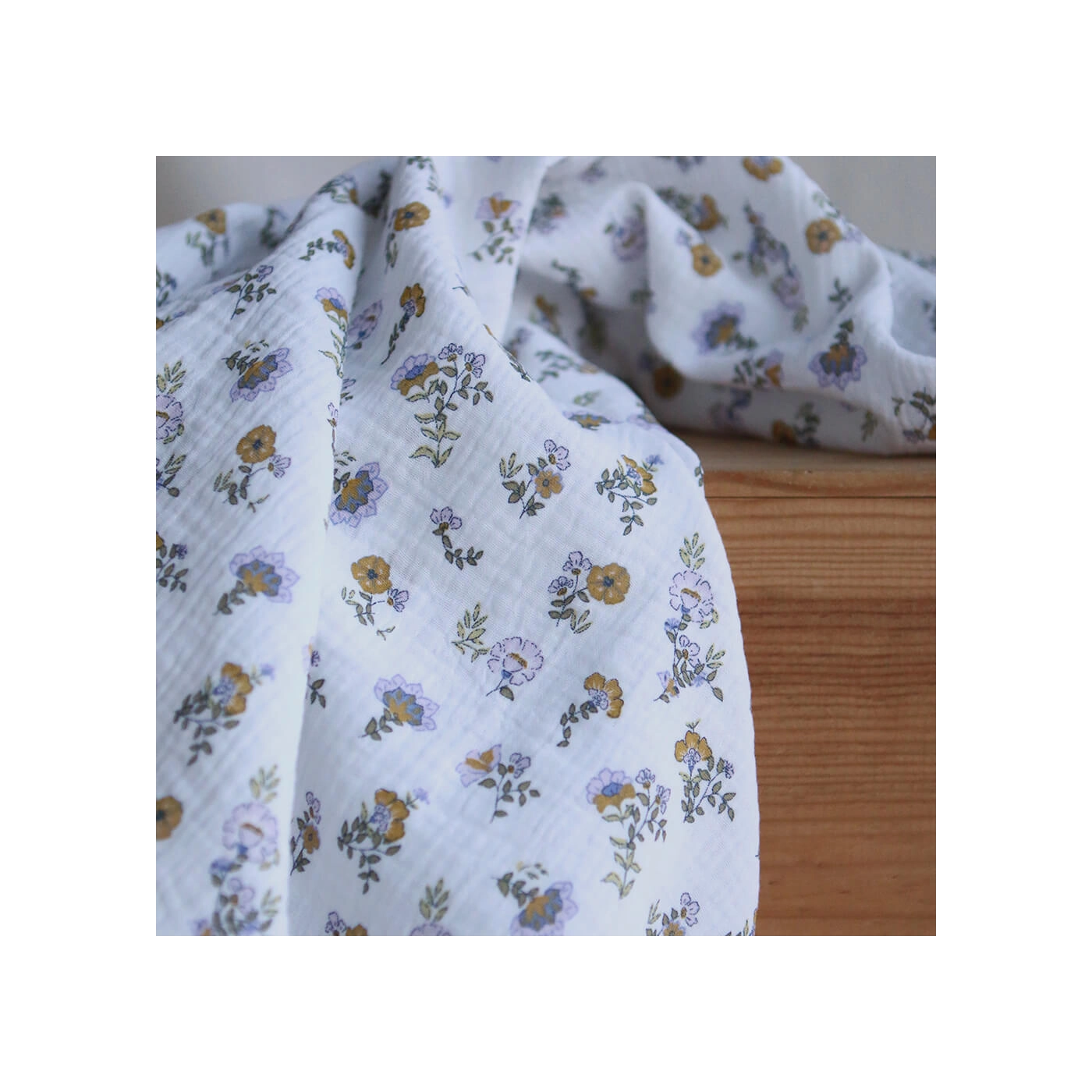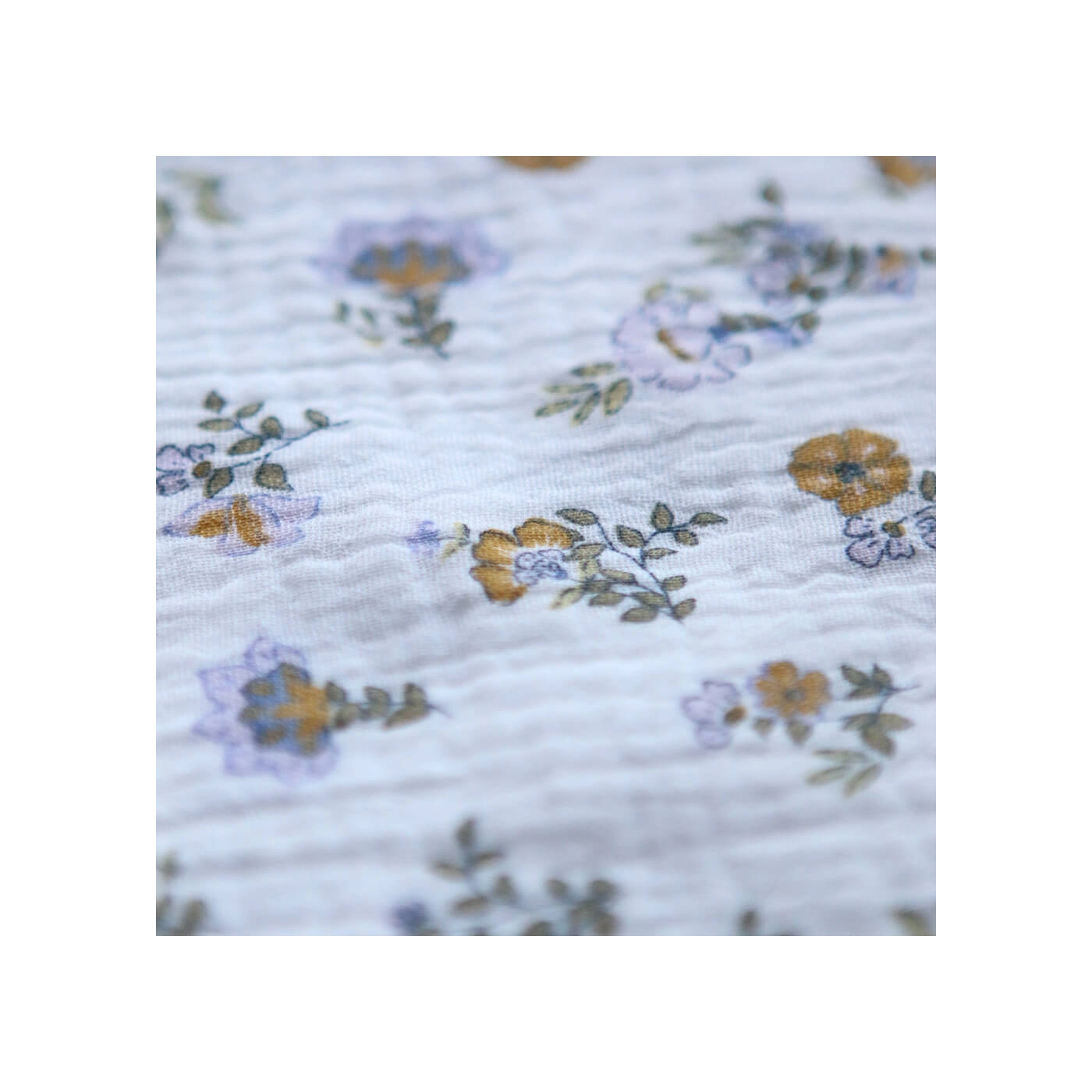 Azélie - Double gaze de coton motif fleuri parme moutarde et vert