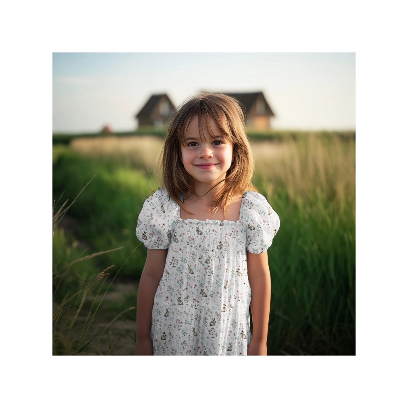 Coloris: fond blanc, imprimé délicates petites fleurs et lapins
