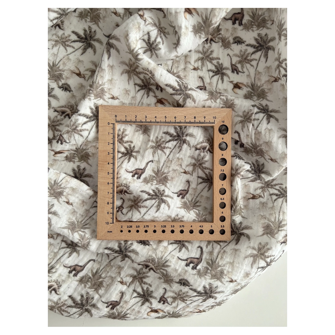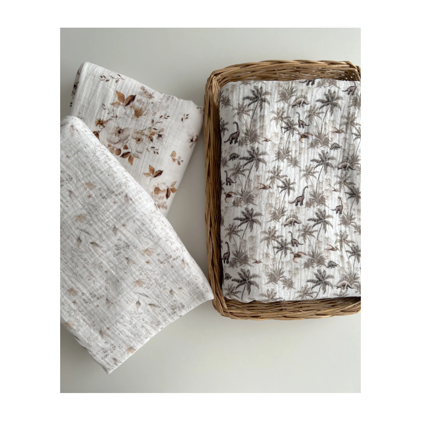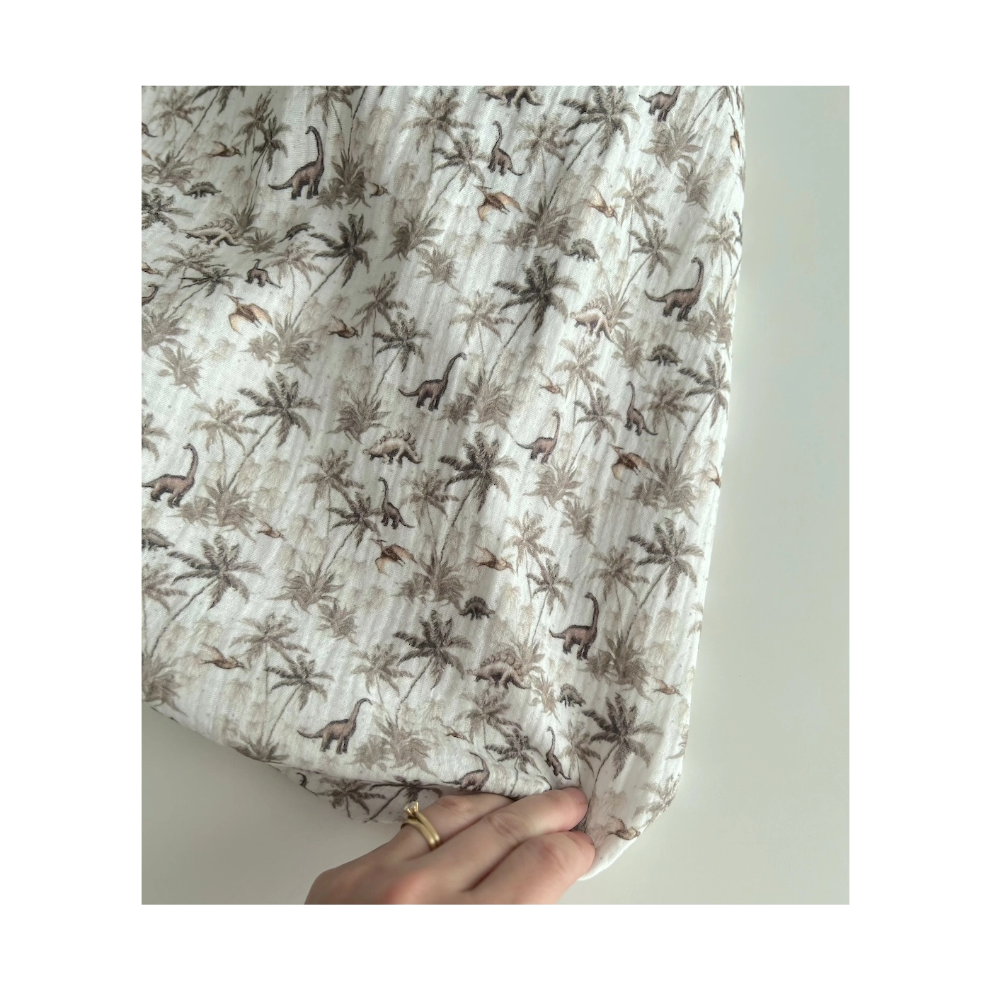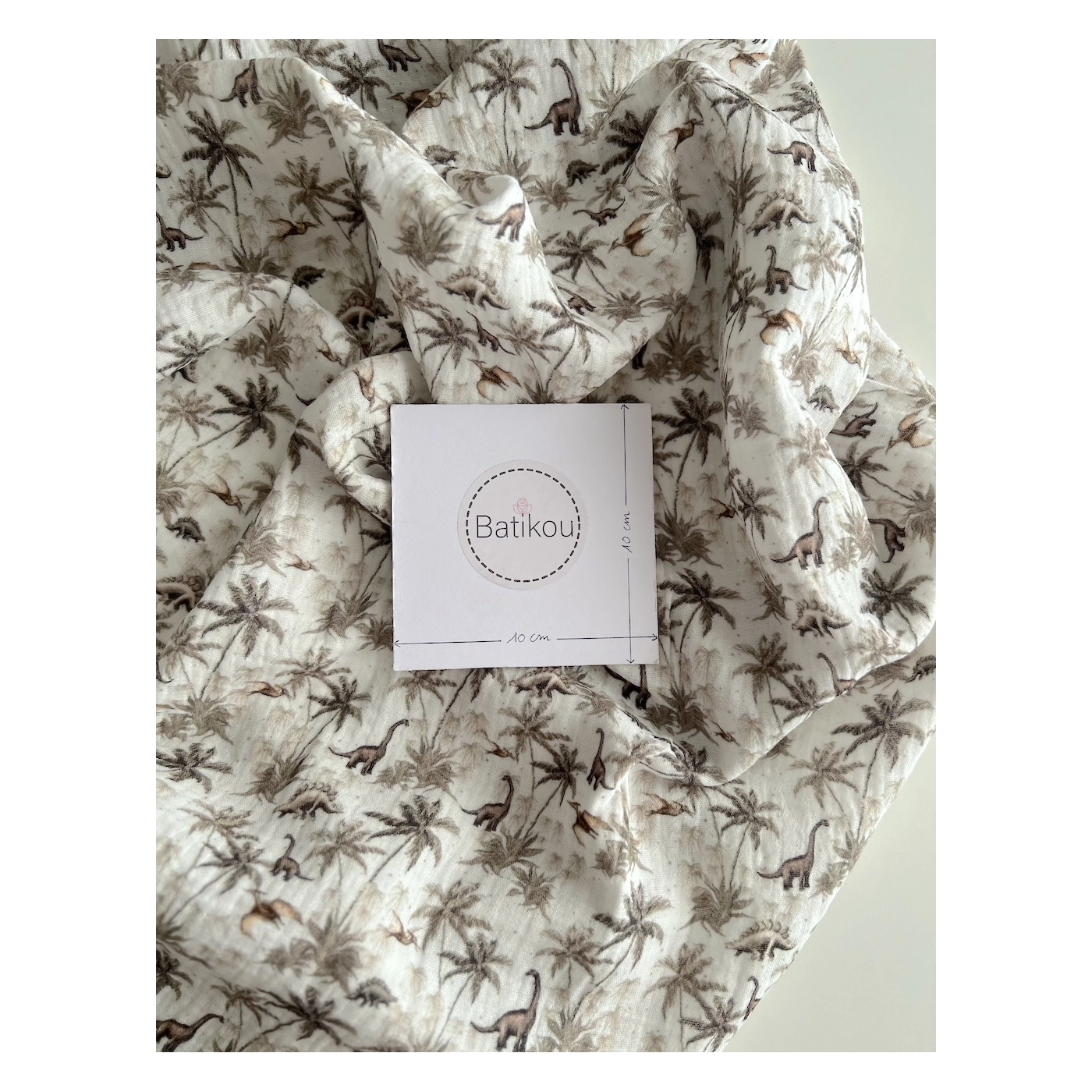 Dino - Double gaze de coton imprimé dinosaures taupe / kaki