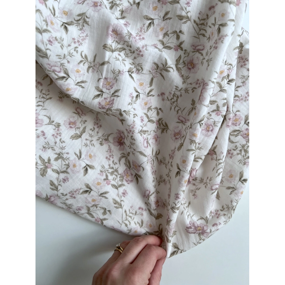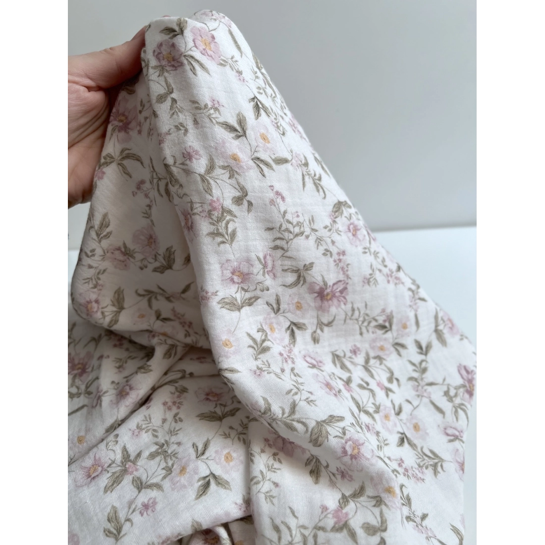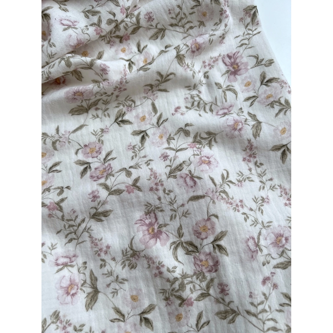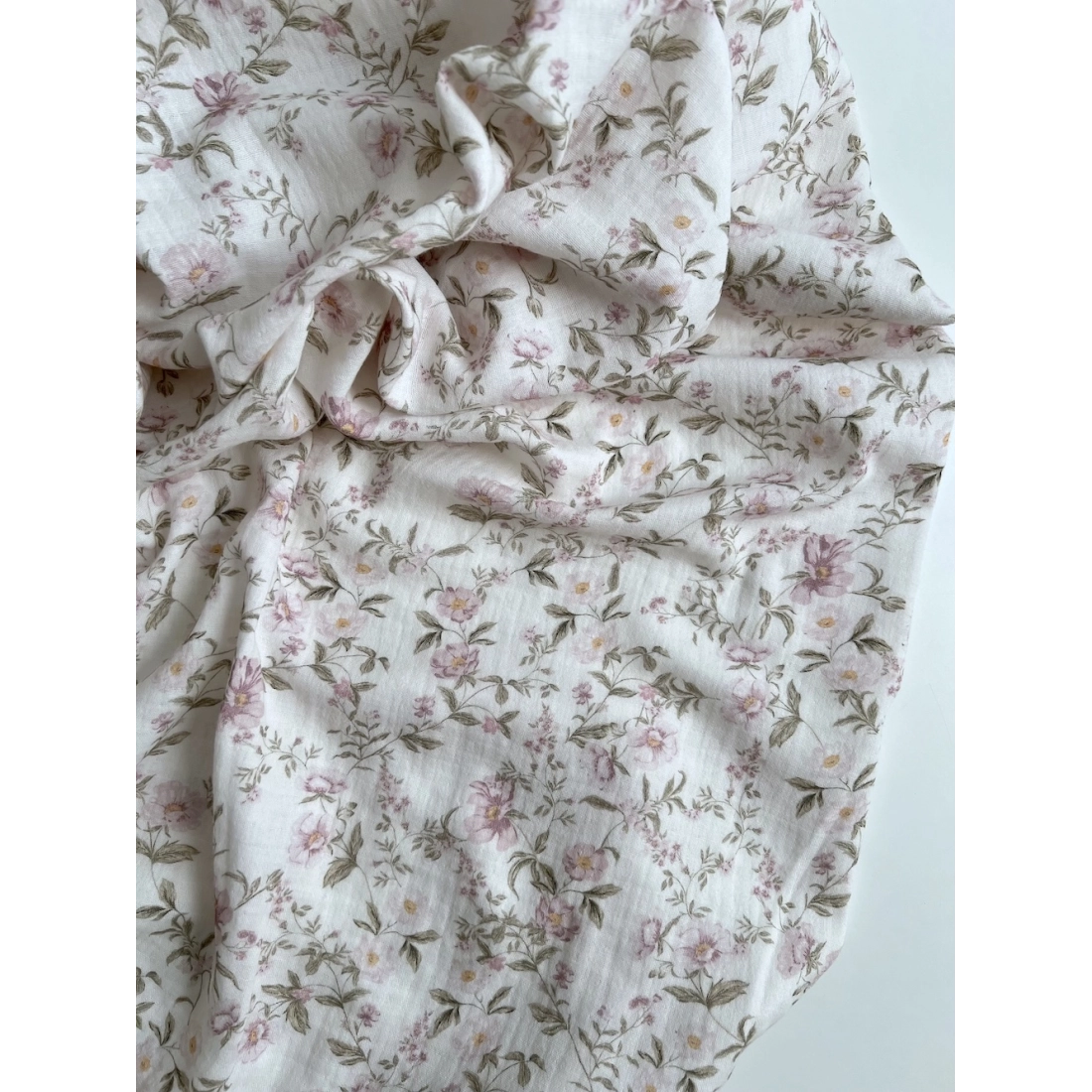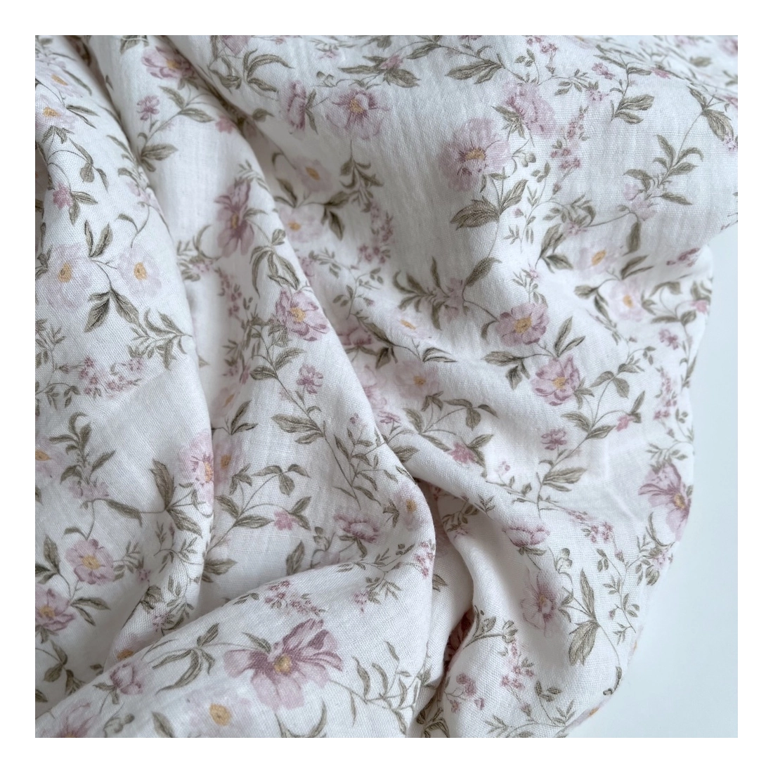 Romy - Double gaze de coton BIO blanc motif rose poudré et vert