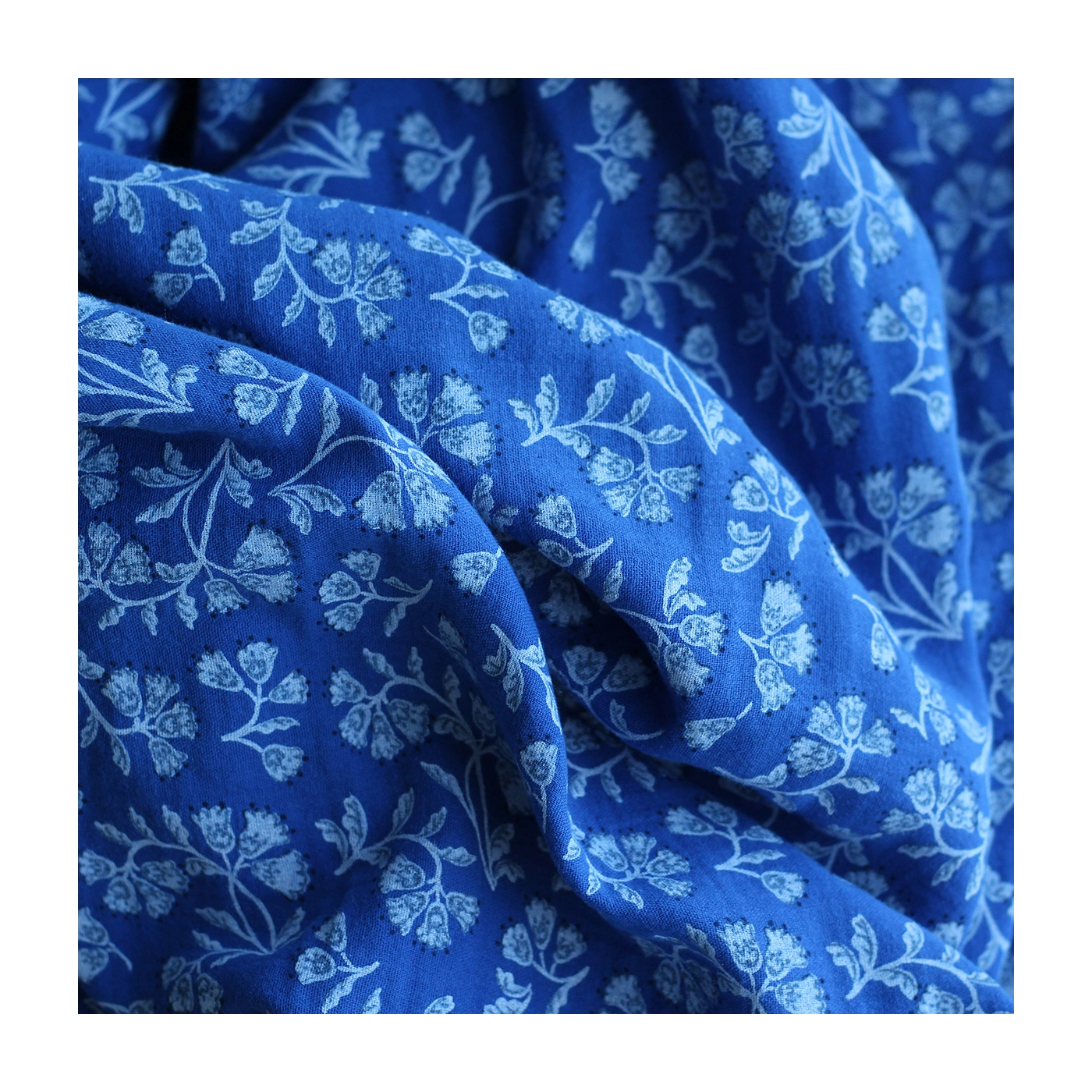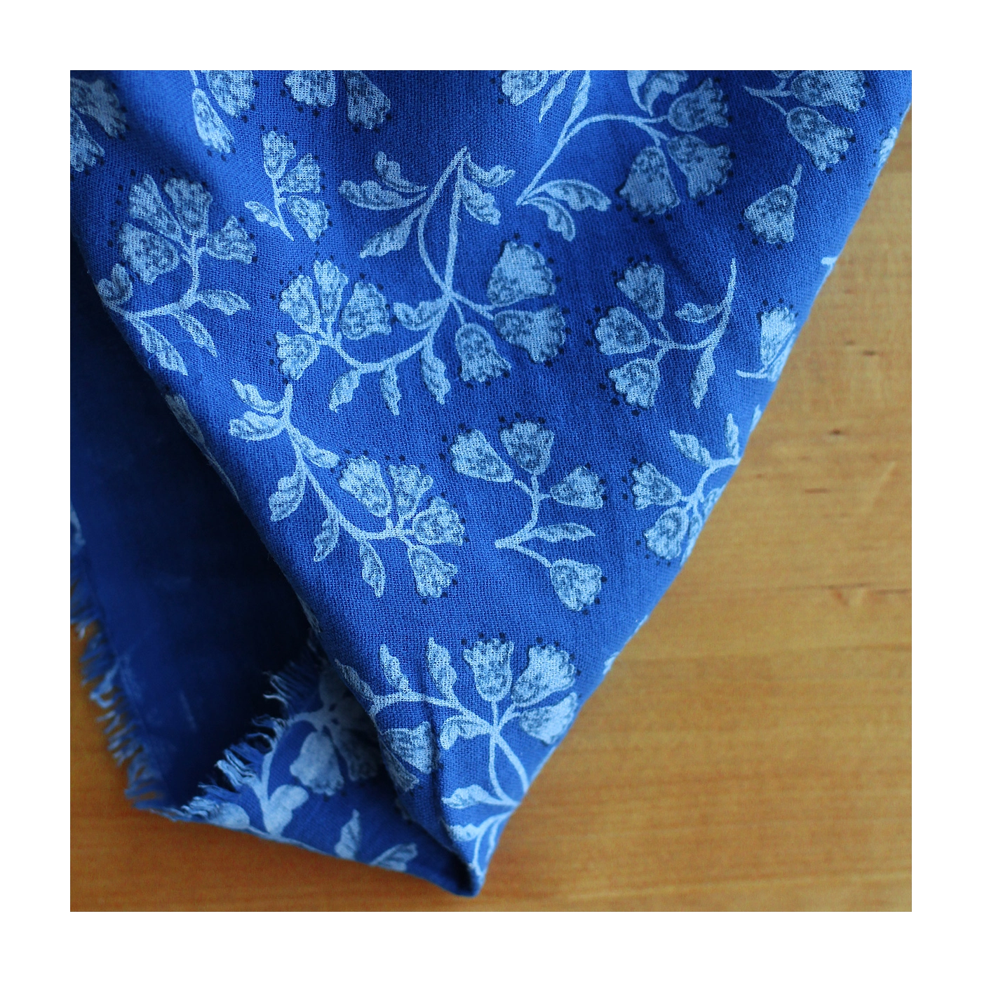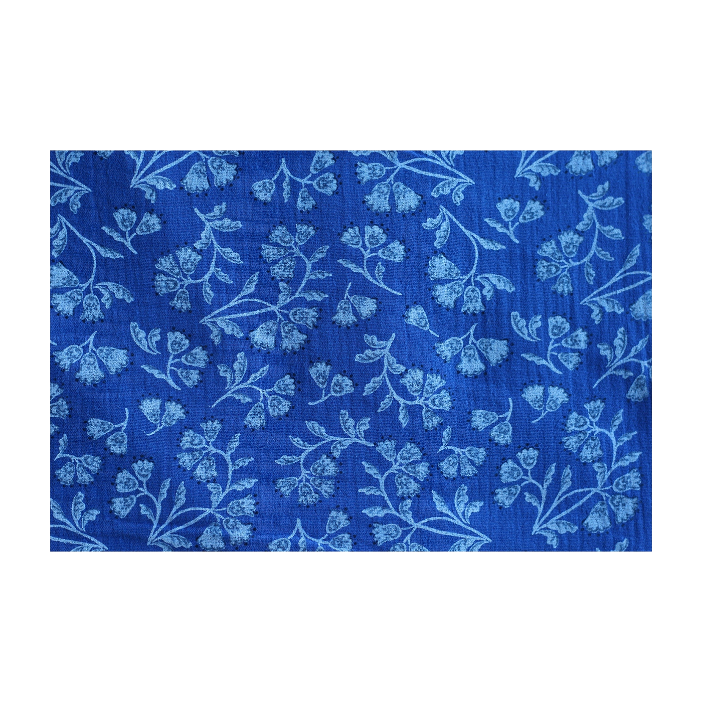 Priya - Double gaze de coton fond bleu cobalt fleuri façon hand block