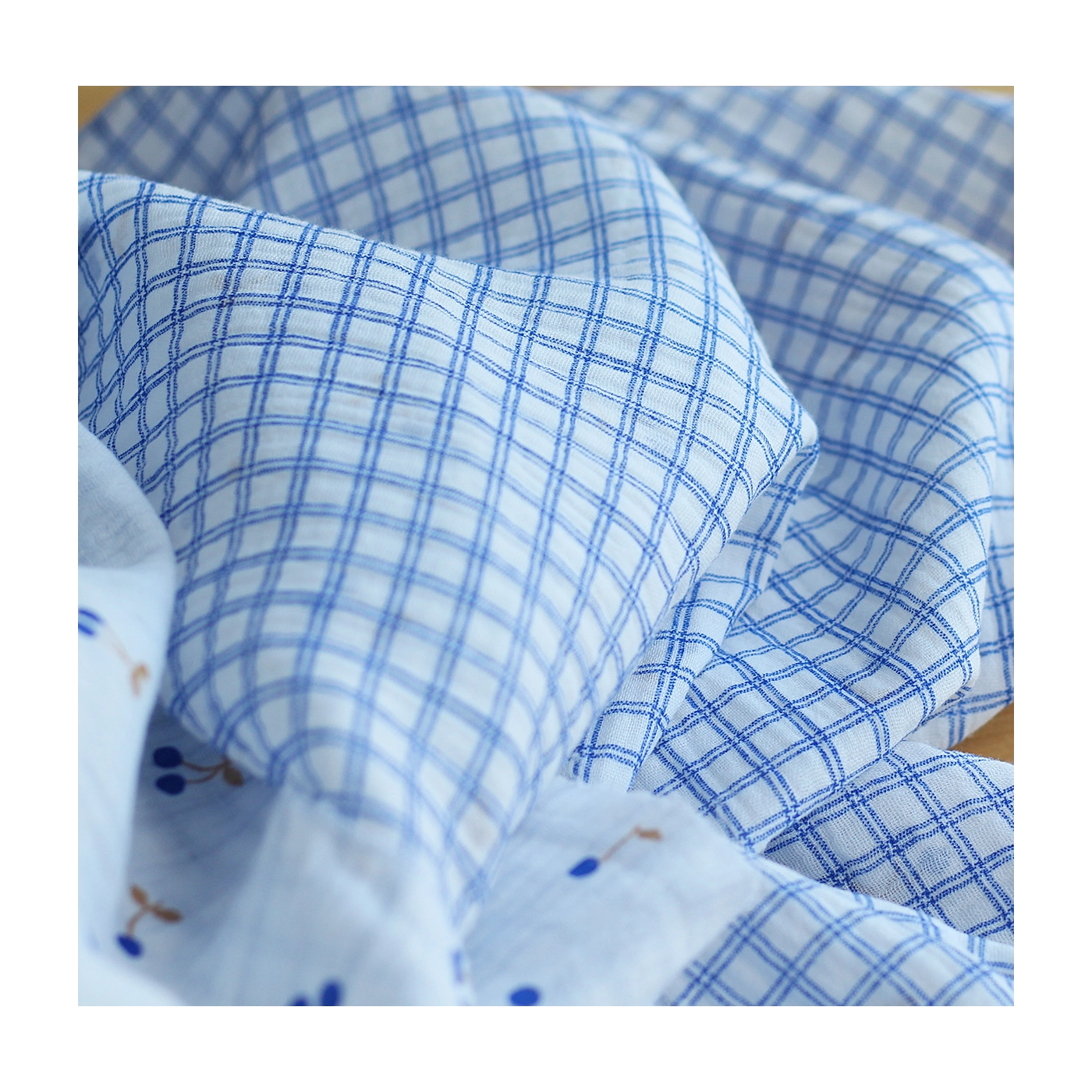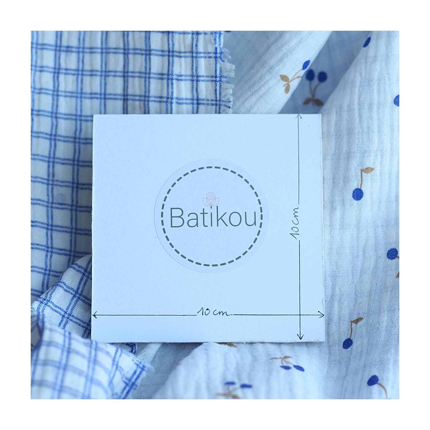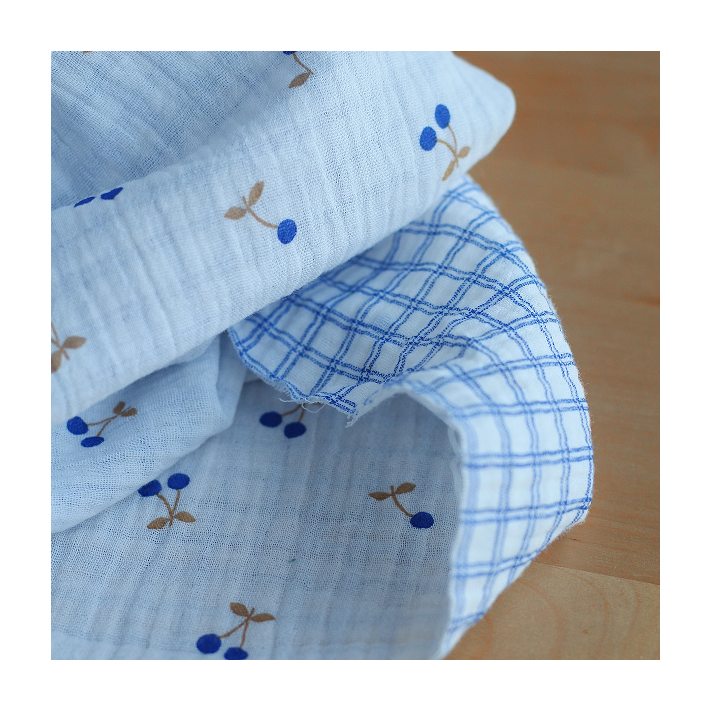 Cherry - Double gaze de coton double face coloris blanc cerises et quadrillage bleu