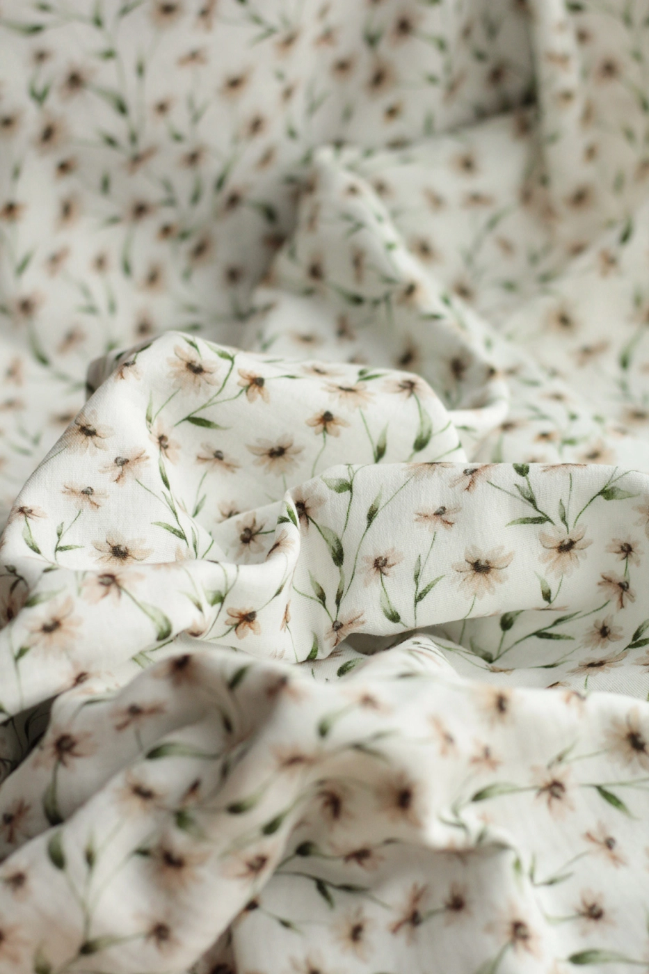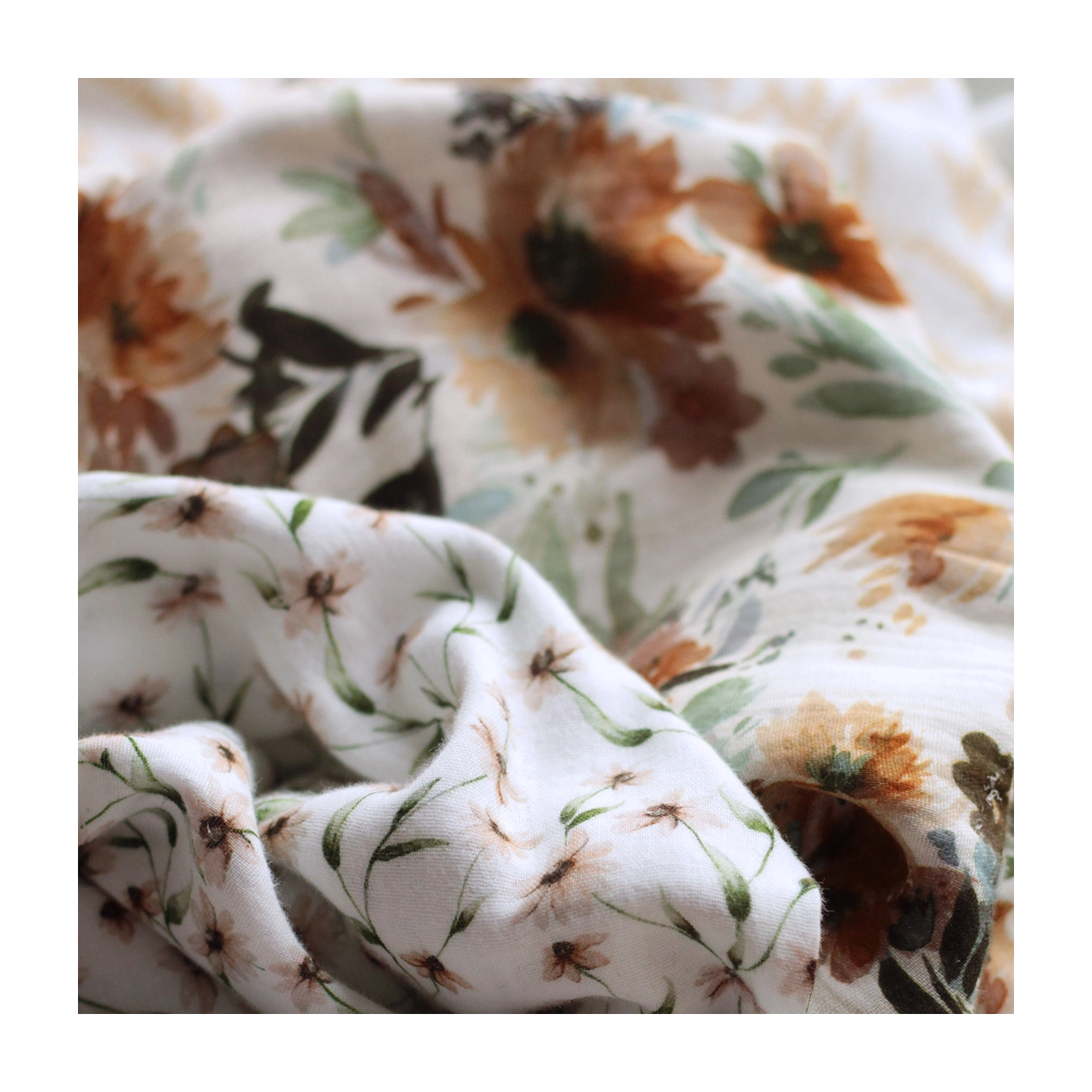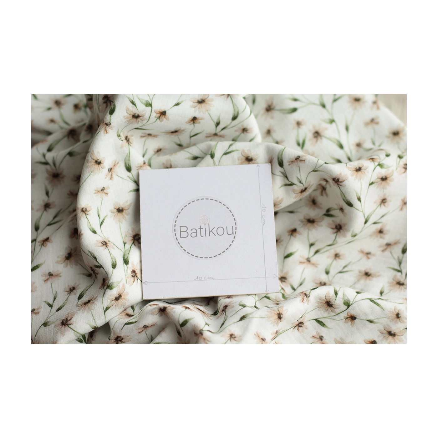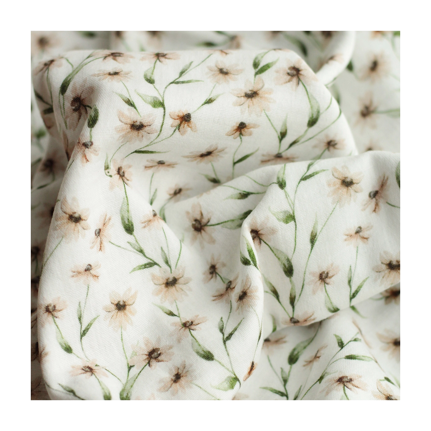 Helene - Double gaze de coton BIO blanc imprimé fleuri ocre