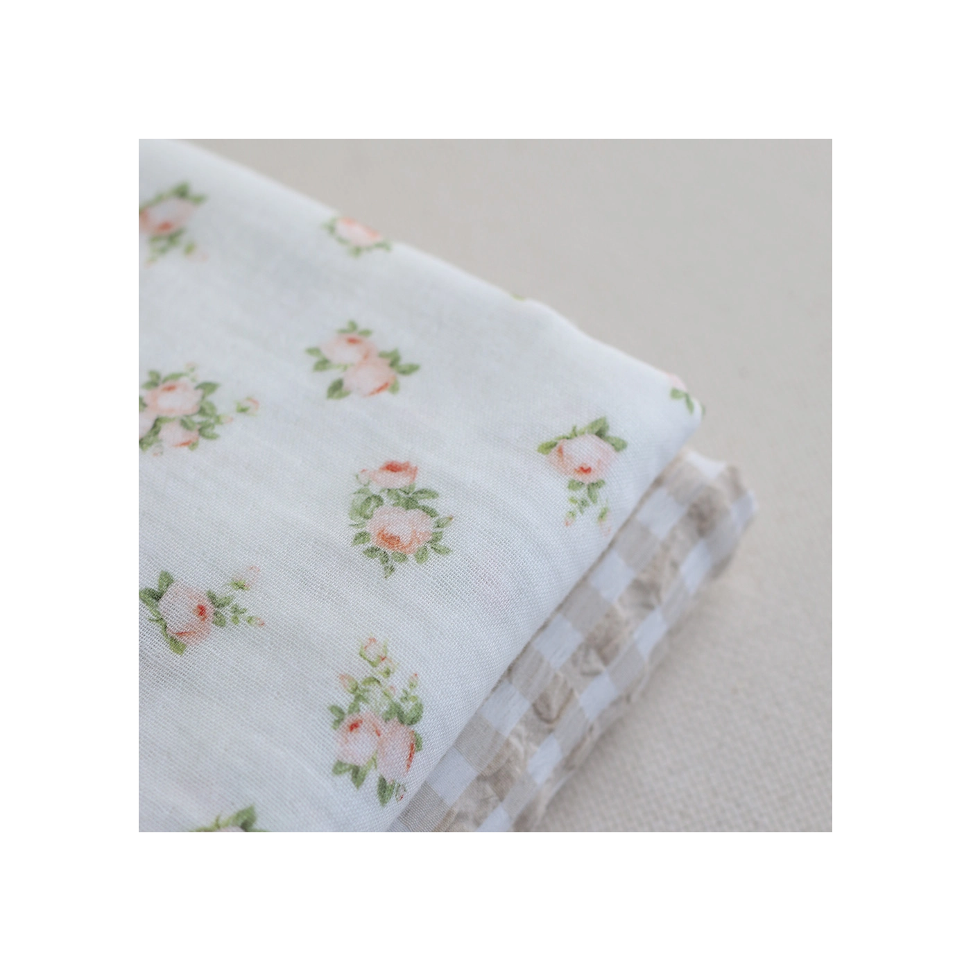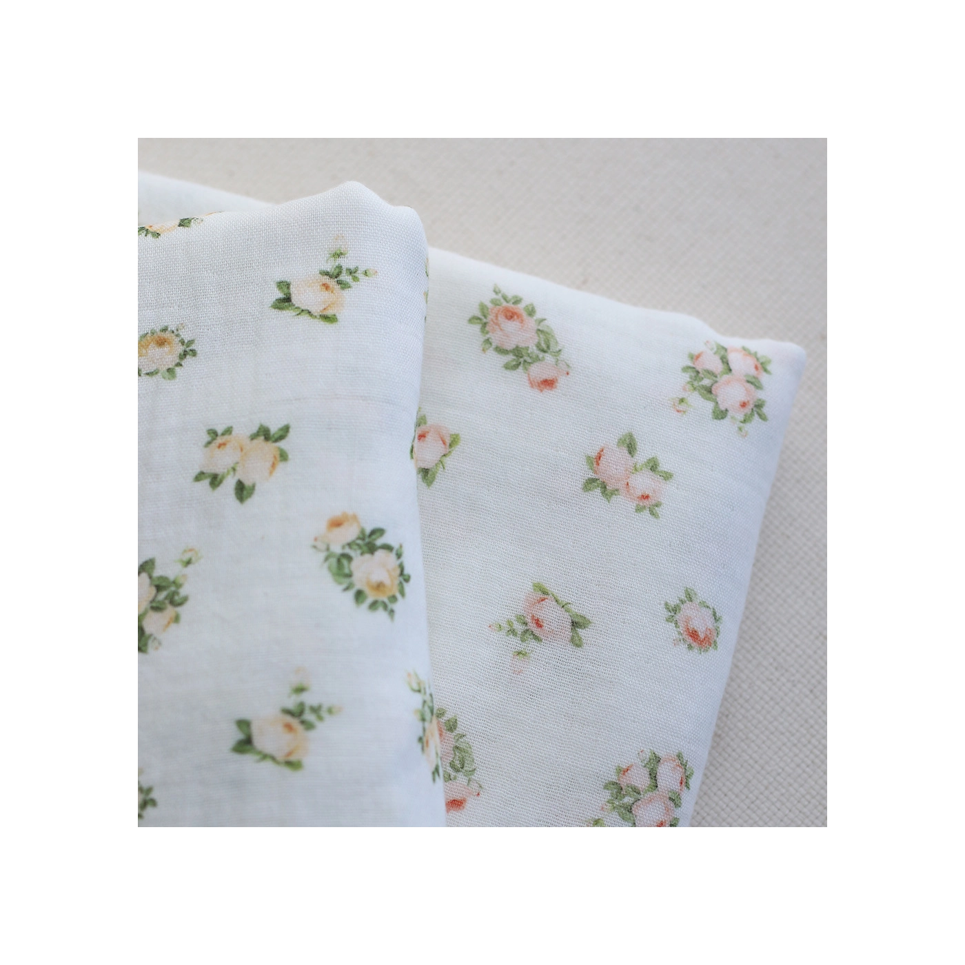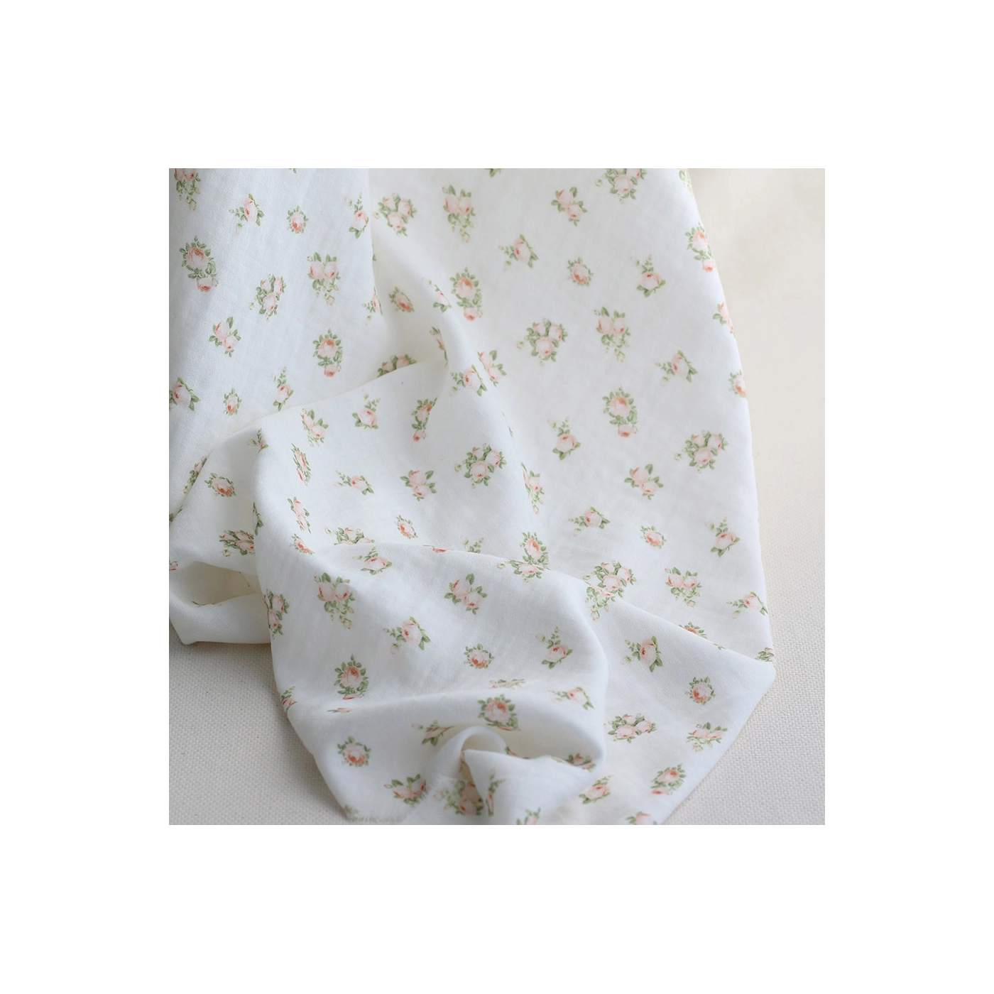 Rosabella - Double gaze de coton BIO blanc motif fleuri pêche
