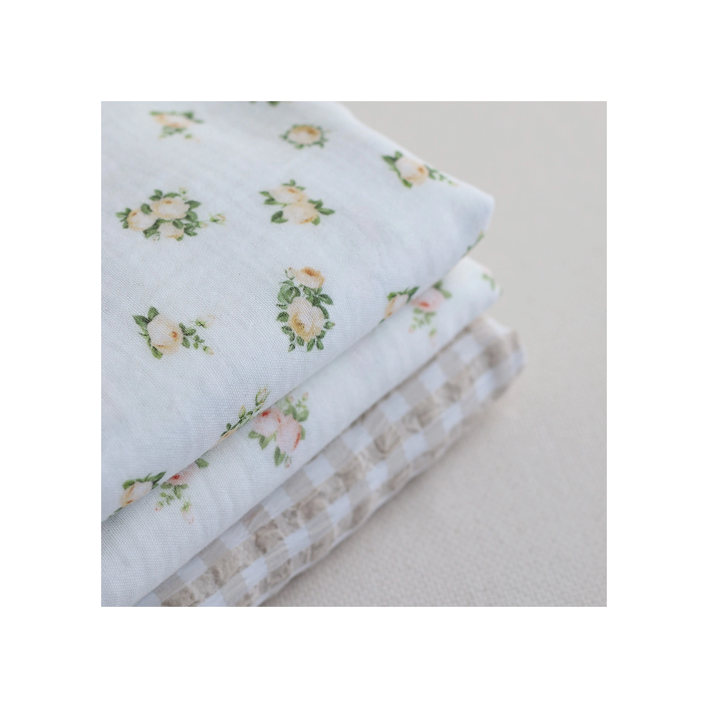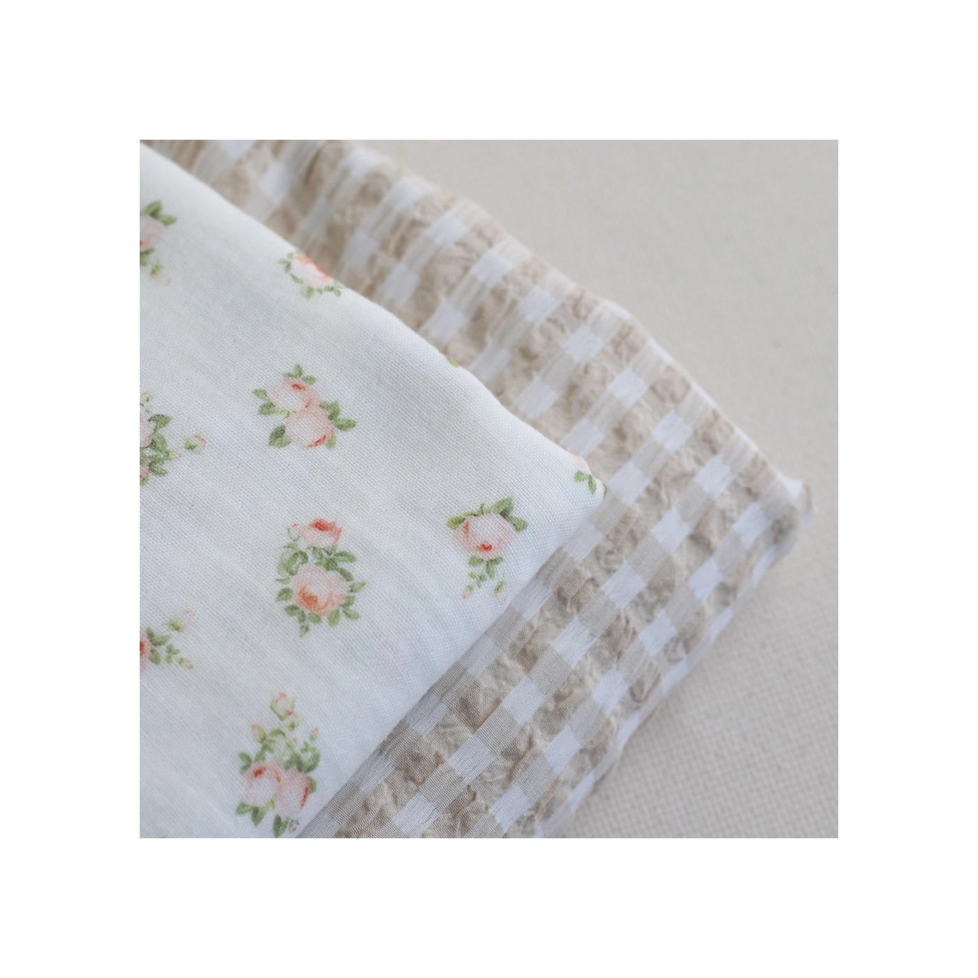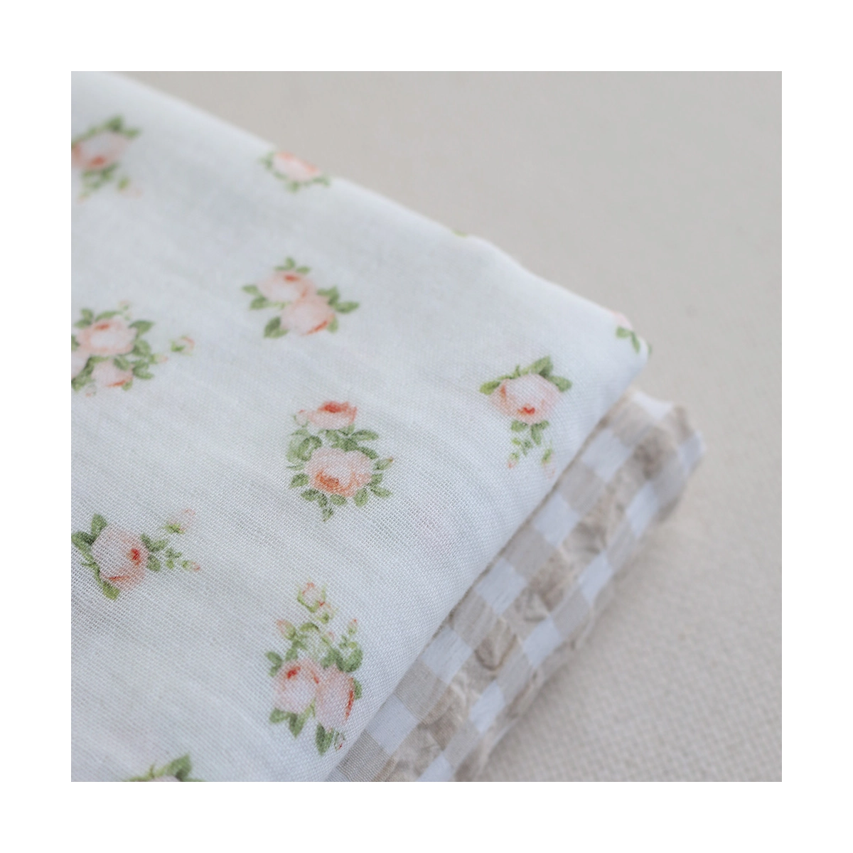 Rosabella - Double gaze de coton BIO blanc motif fleuri pêche