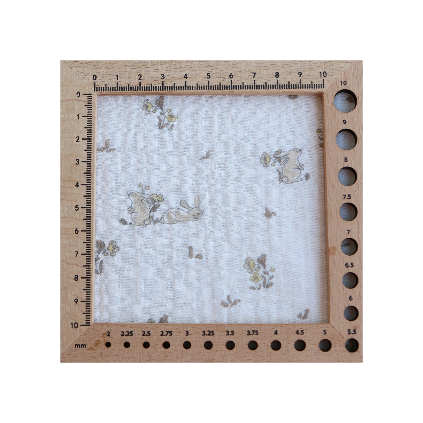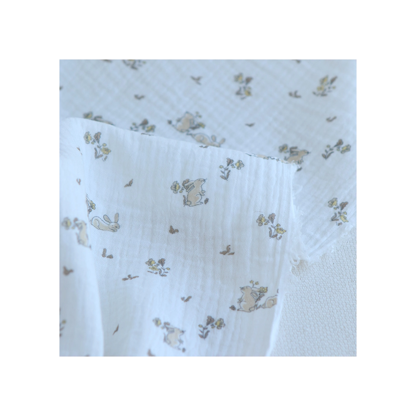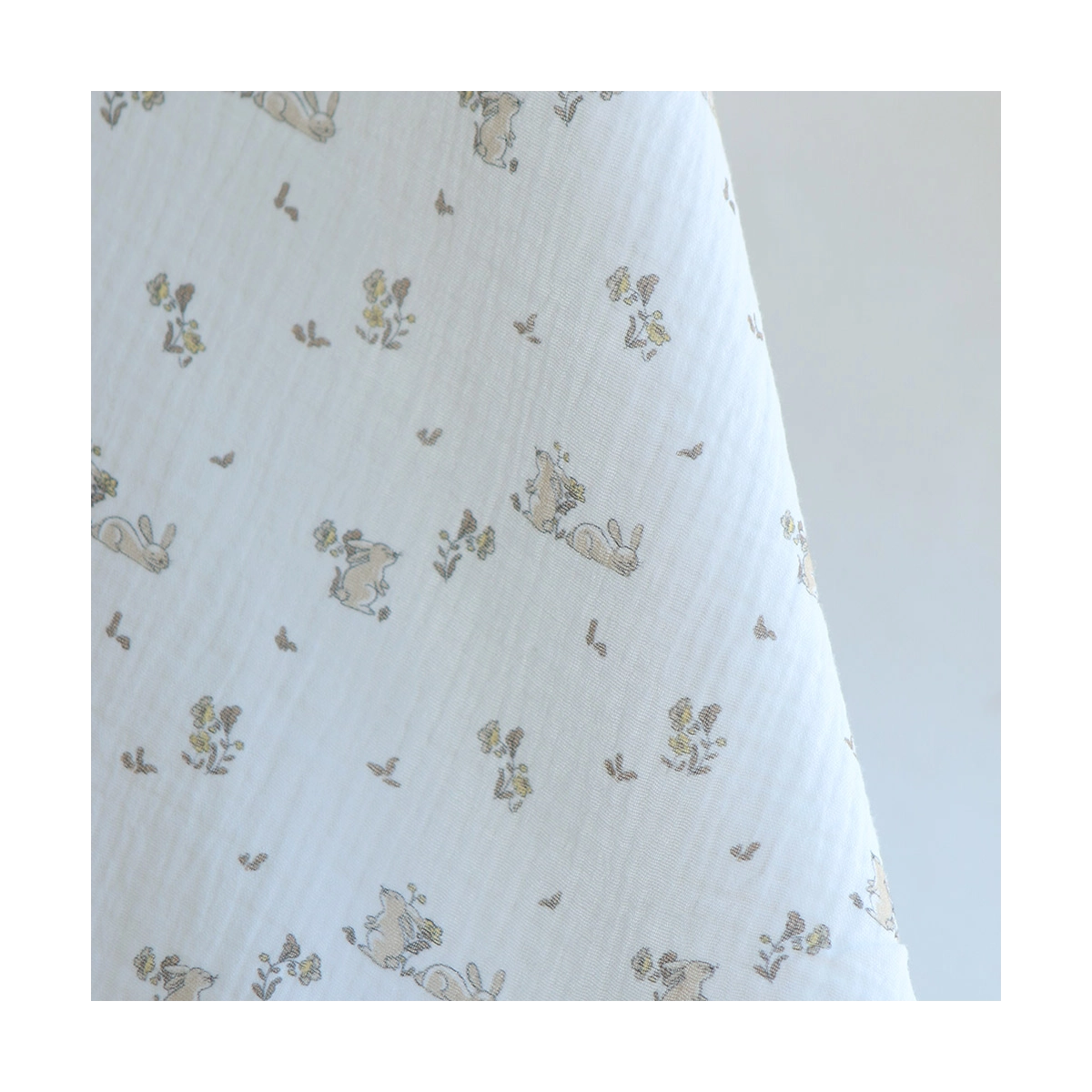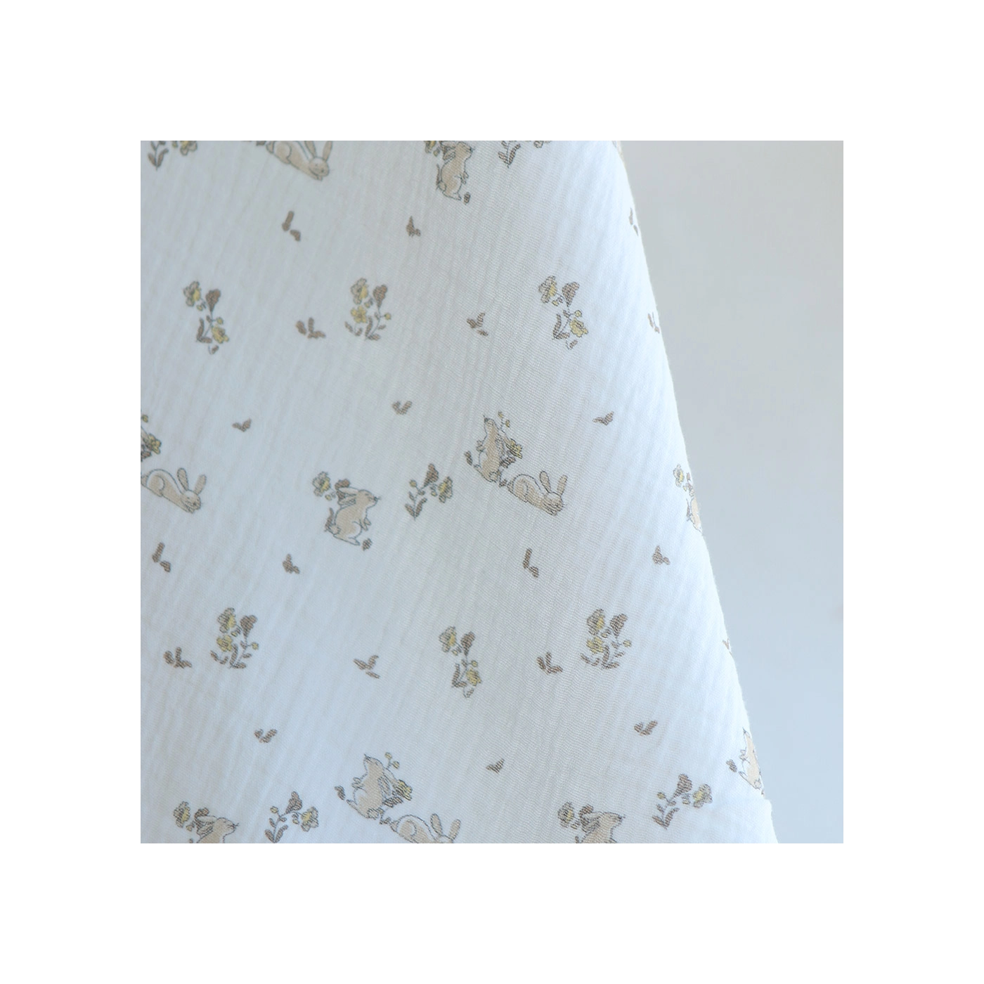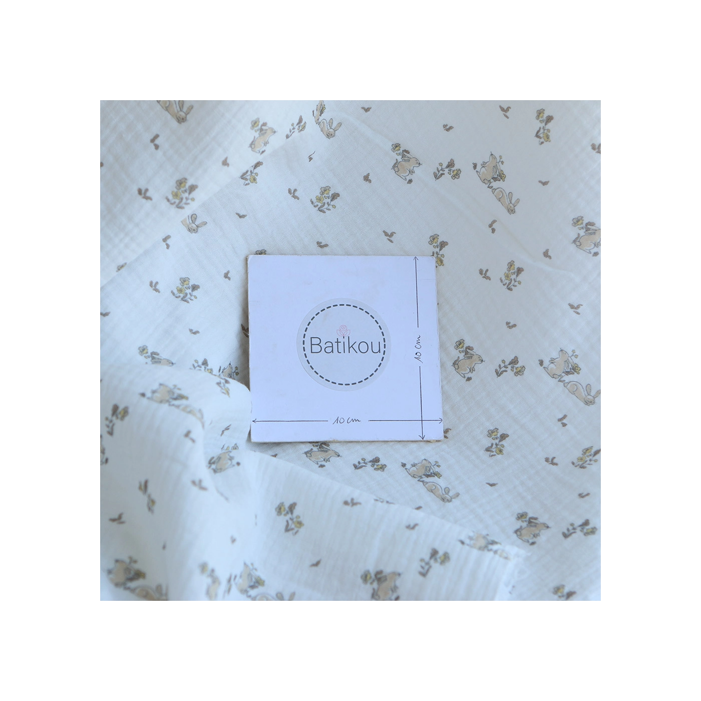 Yuki - Double gaze de coton fond blanc motif petits lapins beige