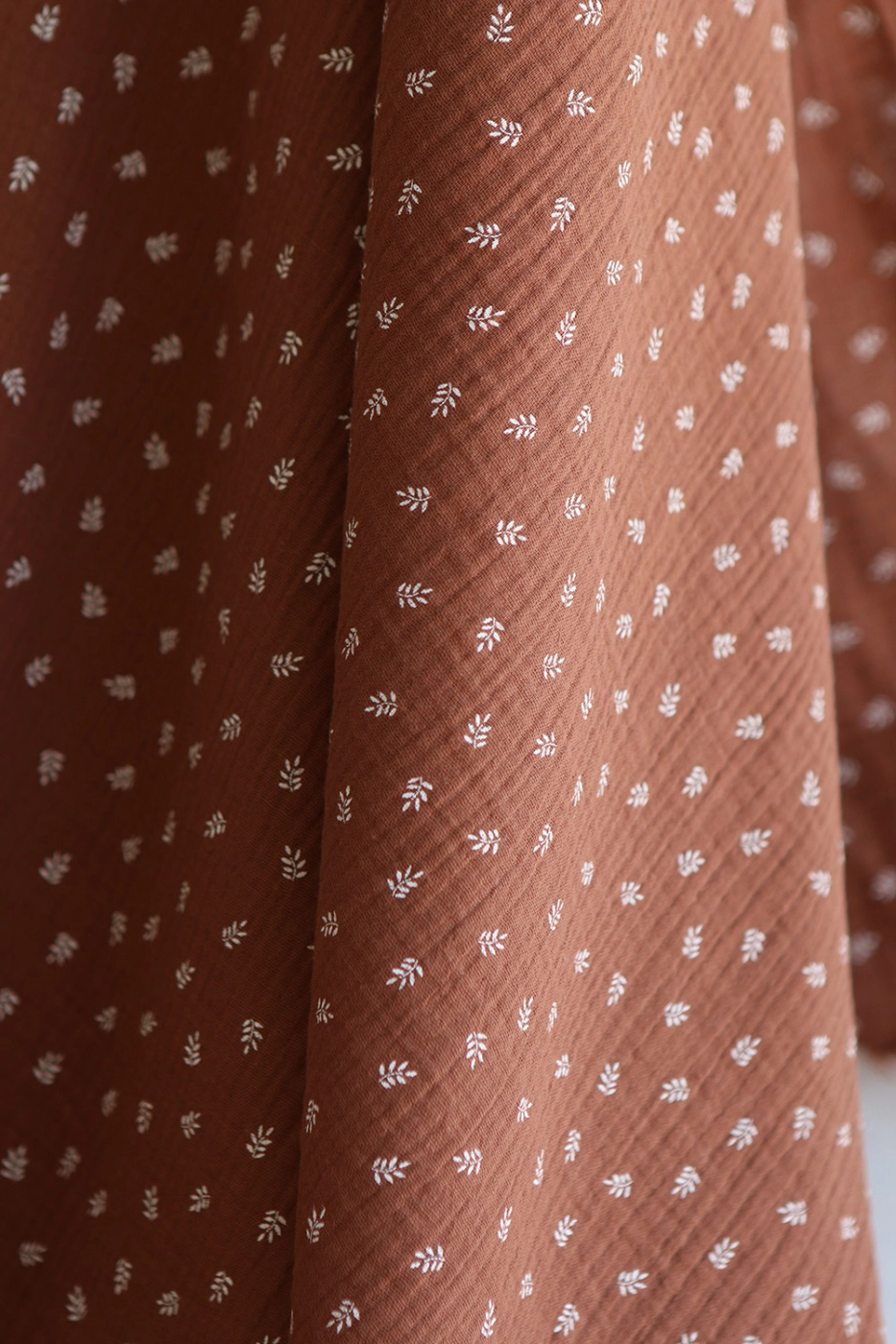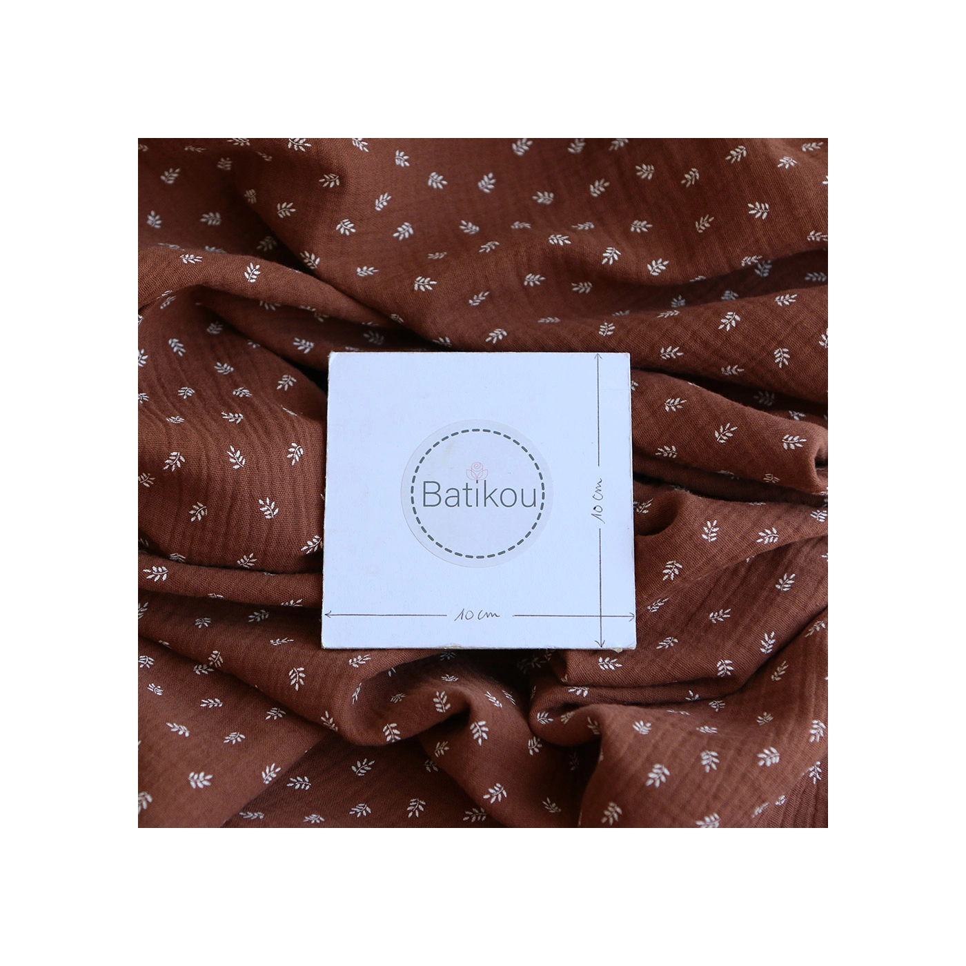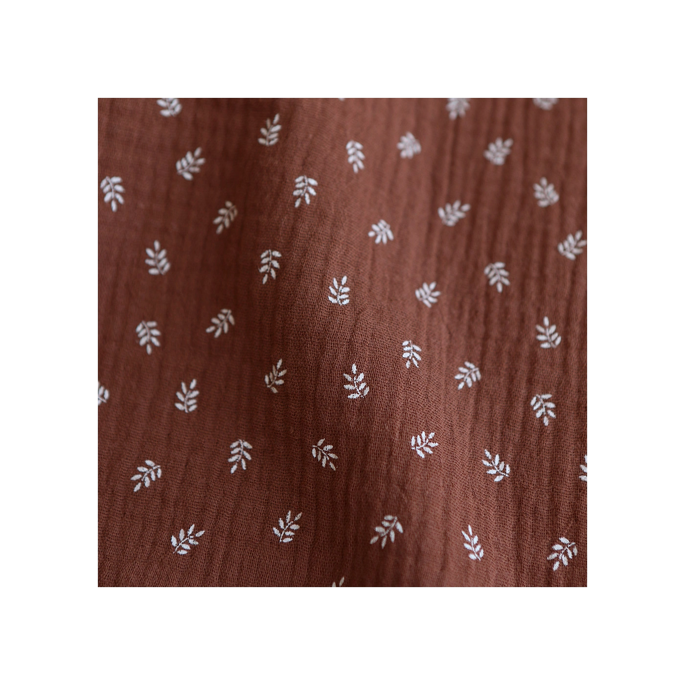 Sacha - Double gaze de coton motif feuilles fond noisette