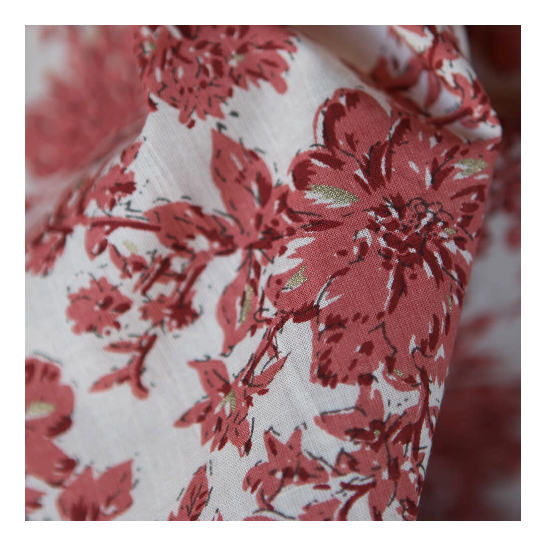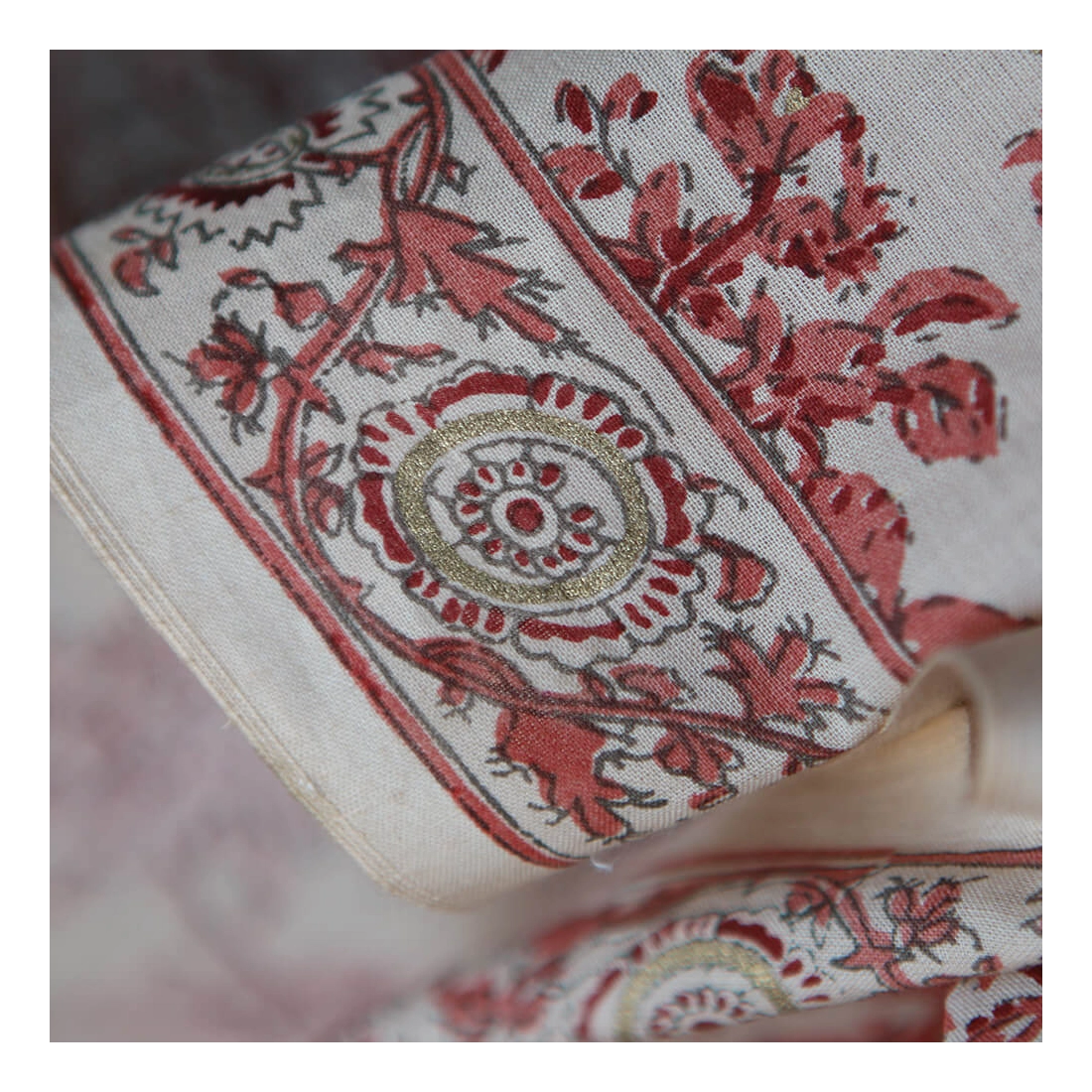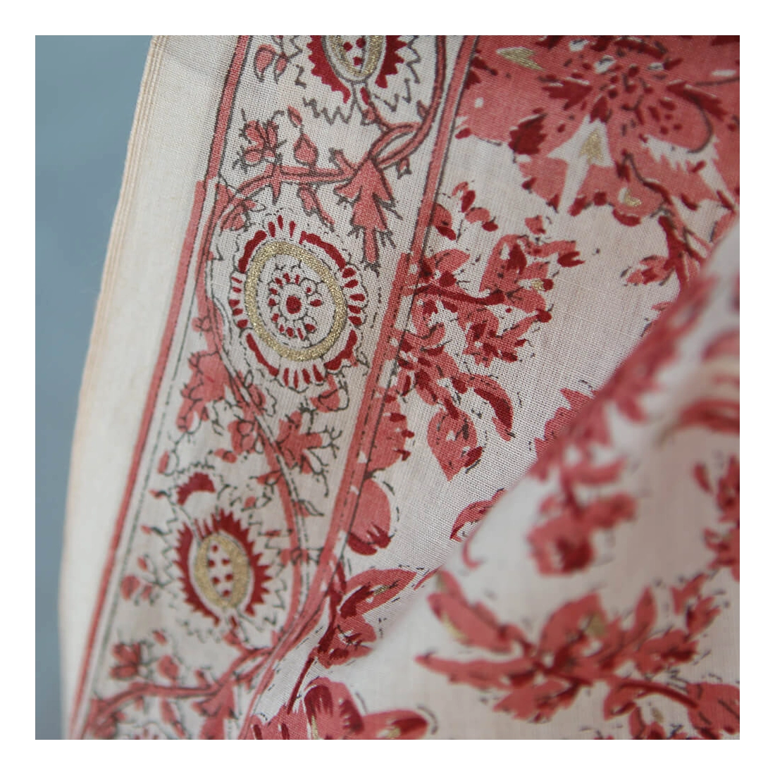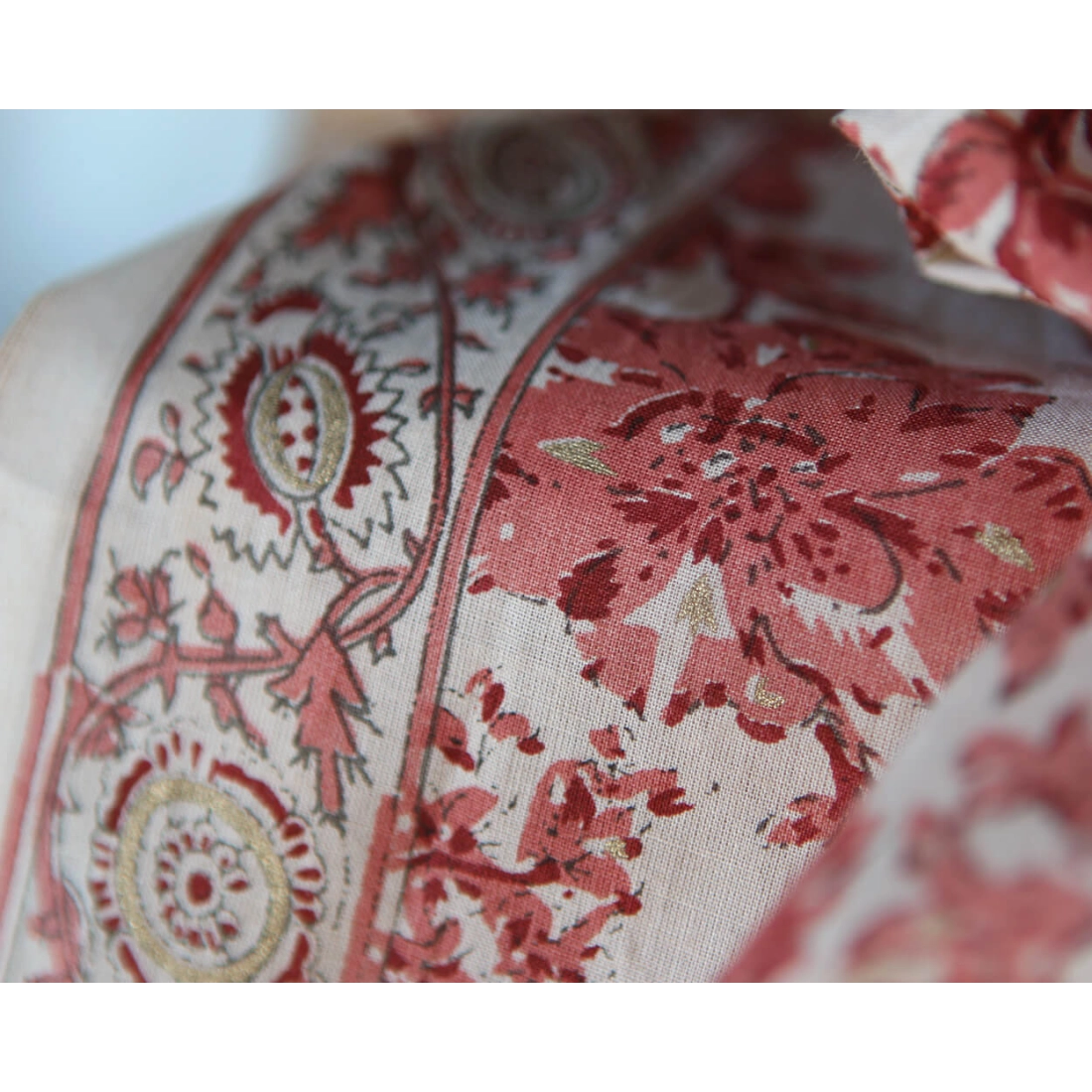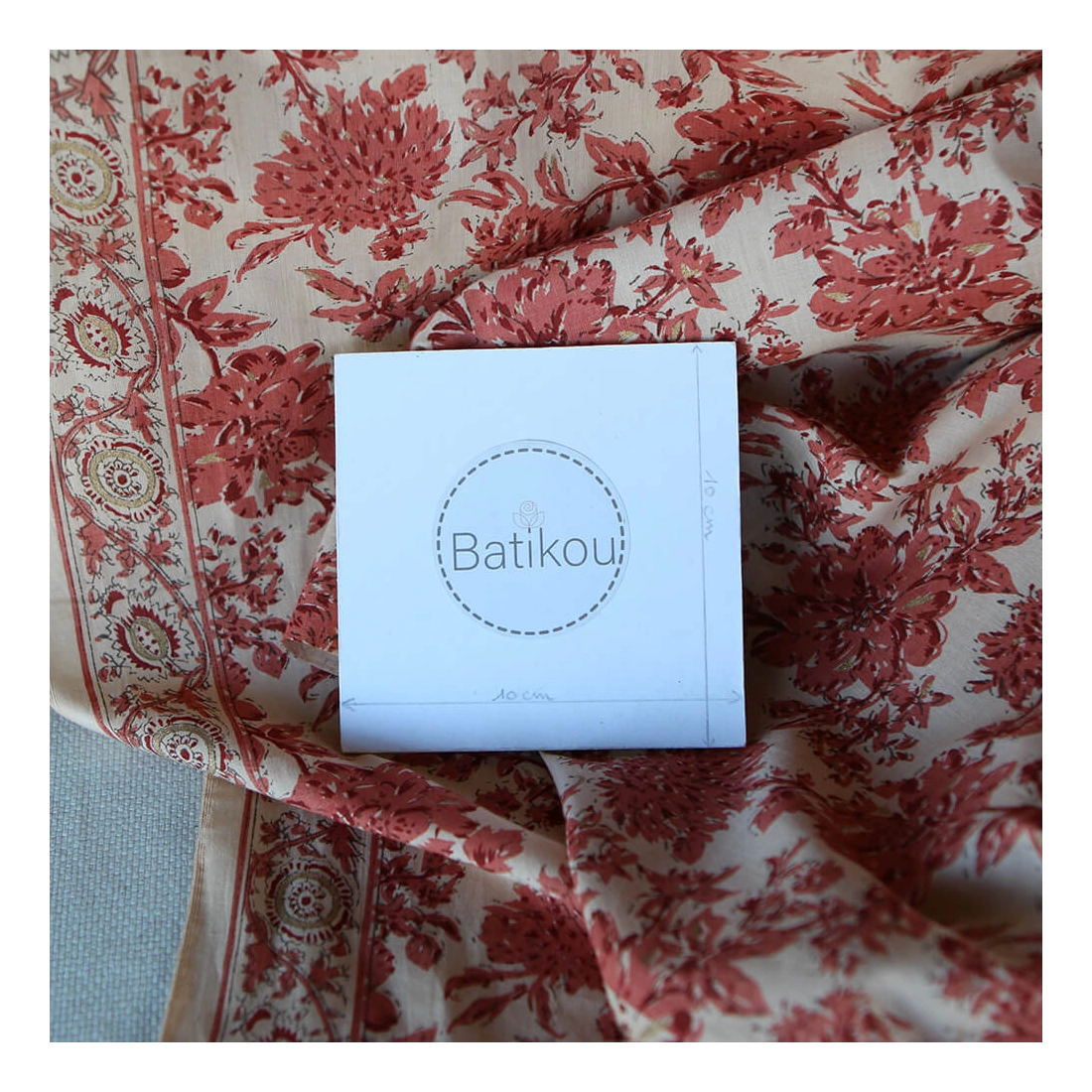 A noter que le processus artisanal (impression à la main, au tampon en bois) de ce tissu fait que chaque pièce est unique et que l'impression n'est pas aussi parfaite qu'un processus industriel.