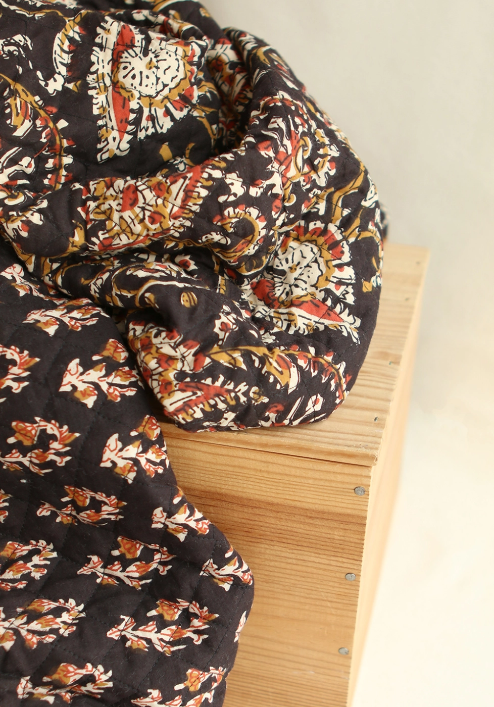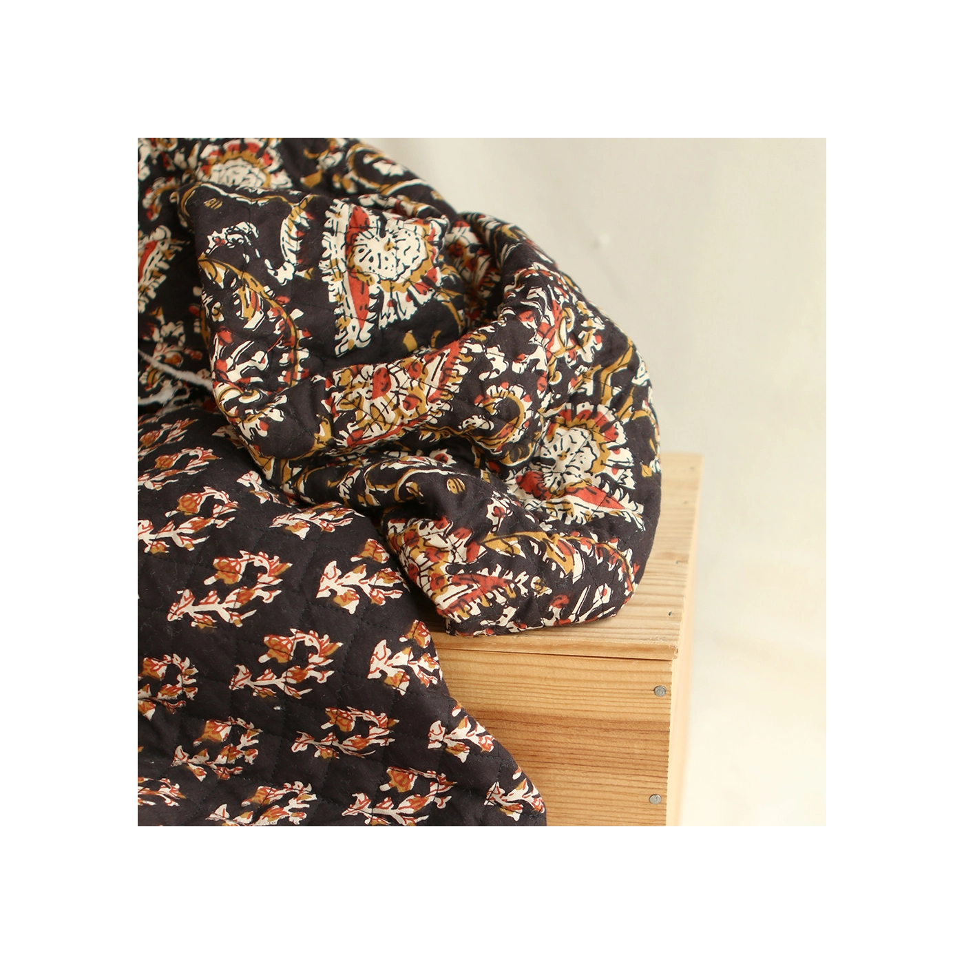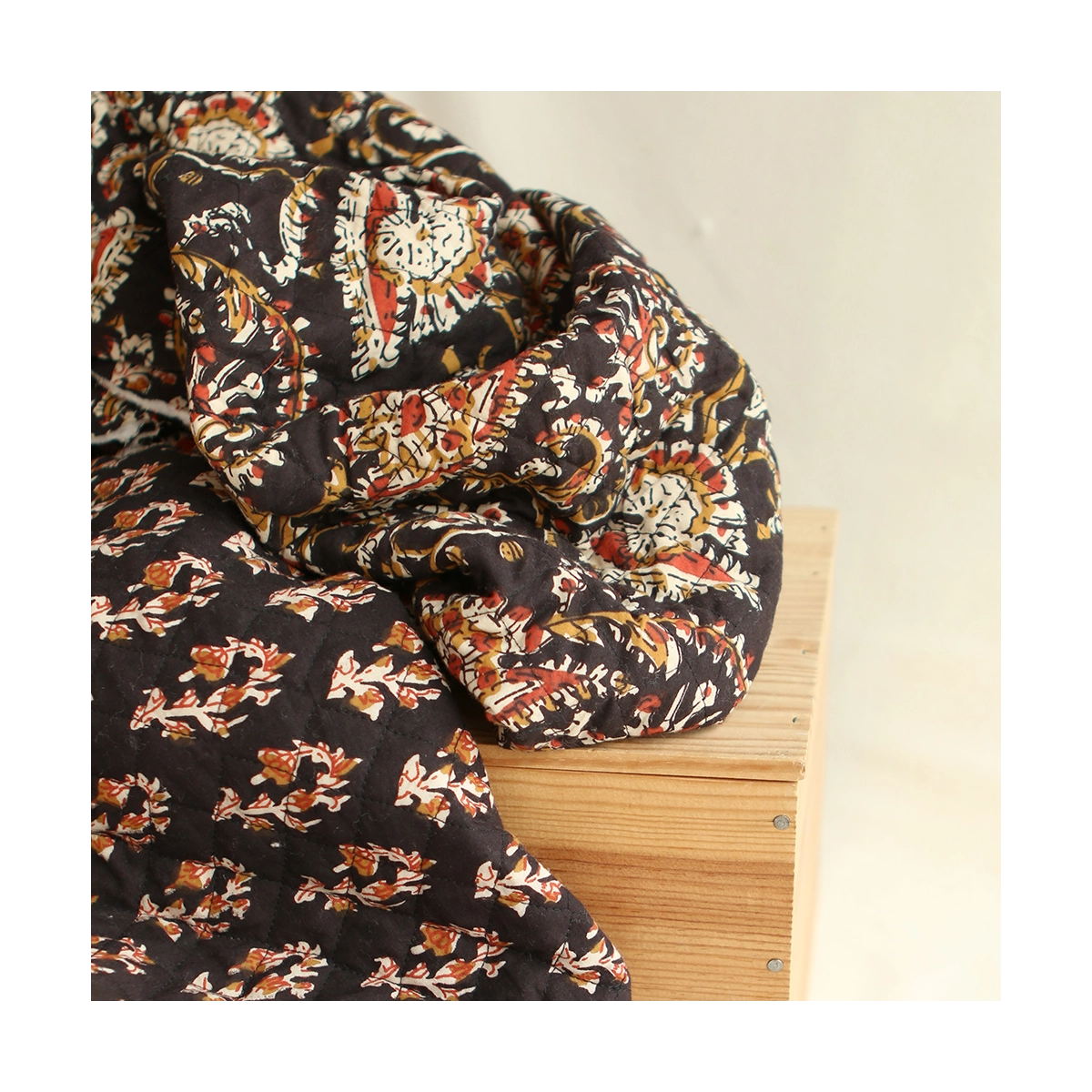 - A noter que le processus artisanal (impression à la main, au tampon en bois) de ce tissu fait que chaque pièce est unique et que l'impression et le matelassage ne sont pas aussi parfaits qu'un processus industriel.
