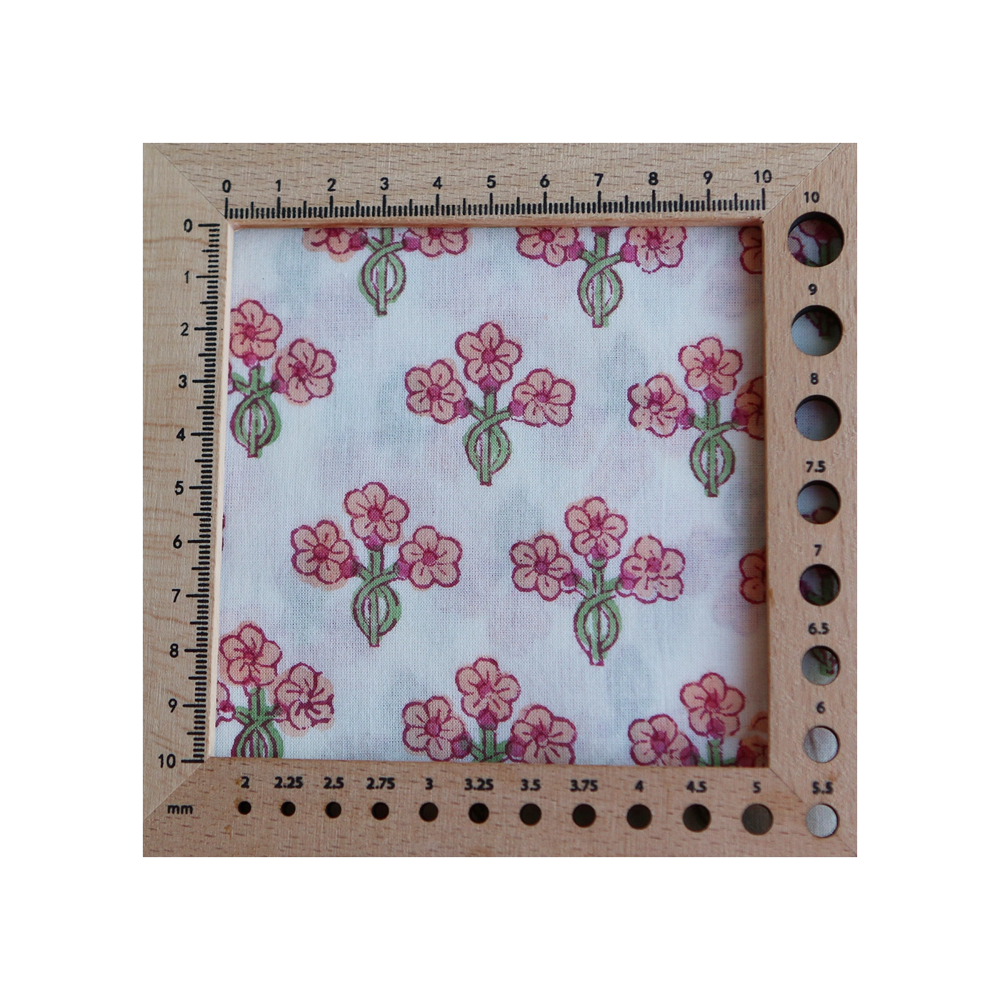 Les couleurs et les motifs apparaissent petit à petit en trempant le tampon en bois dans l'encre textile, puis en le frappant sur le tissu, répétant ce geste autant de fois que nécessaire pour remplir le coupon.
