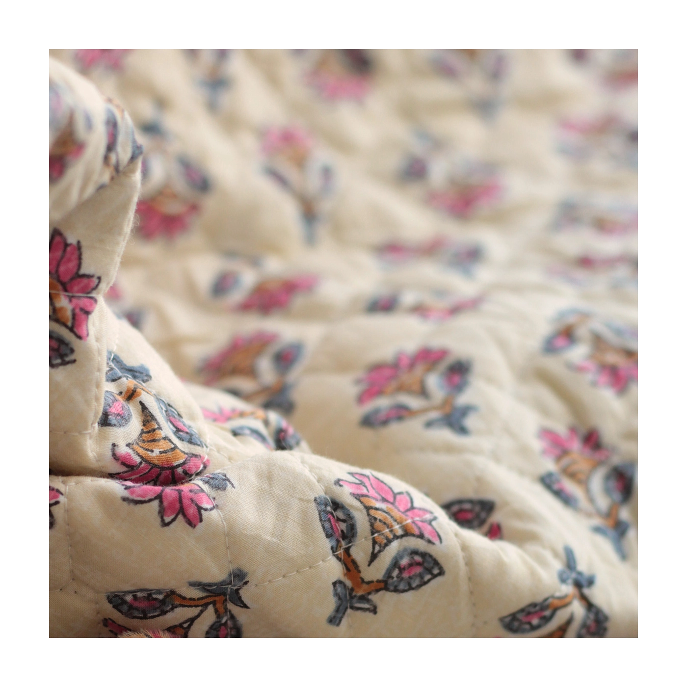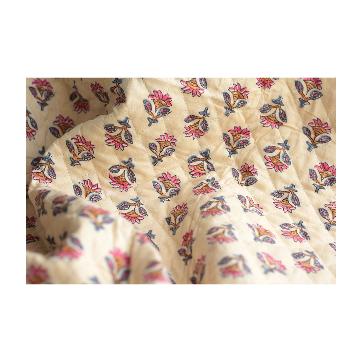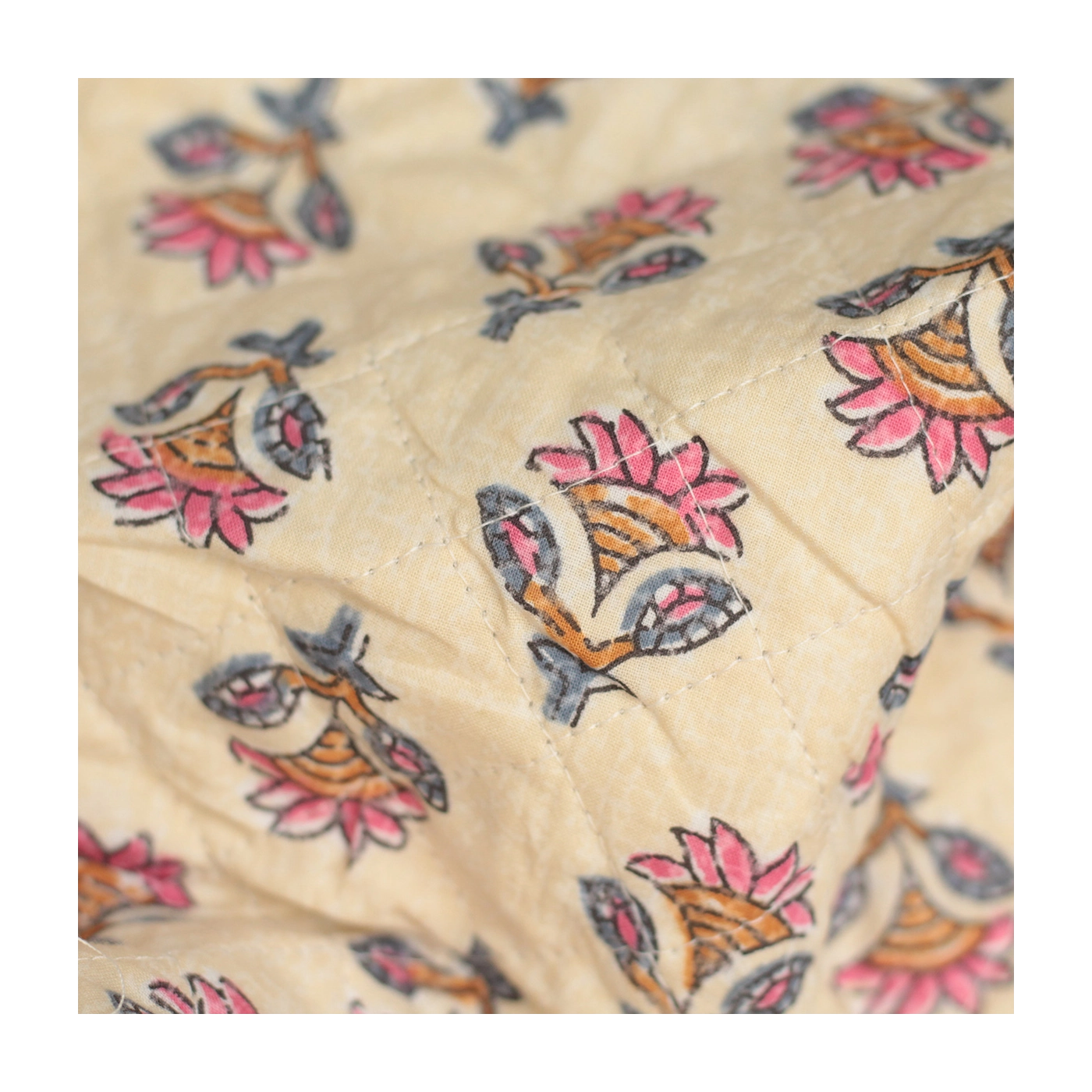 - A noter que le processus artisanal (impression à la main, au tampon en bois) de ce tissu fait que chaque pièce est unique et que l'impression et le matelassage ne sont pas aussi parfaits qu'un processus industriel.
