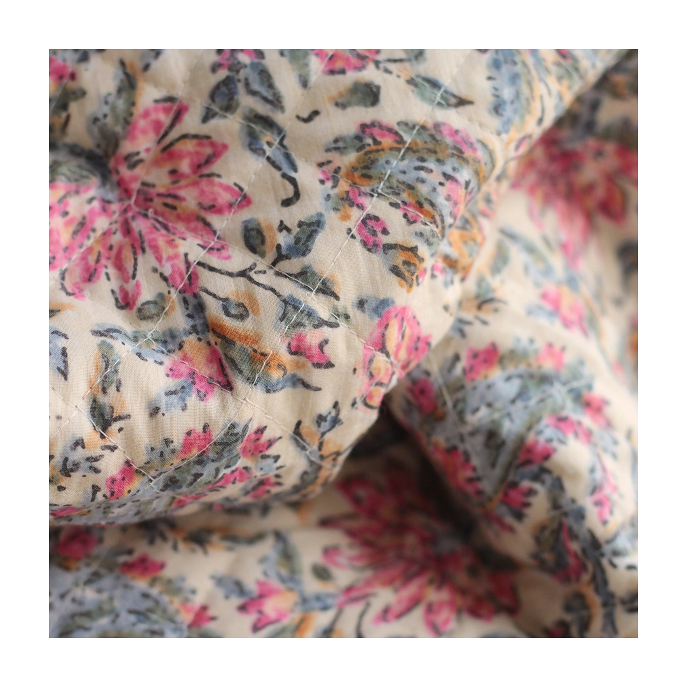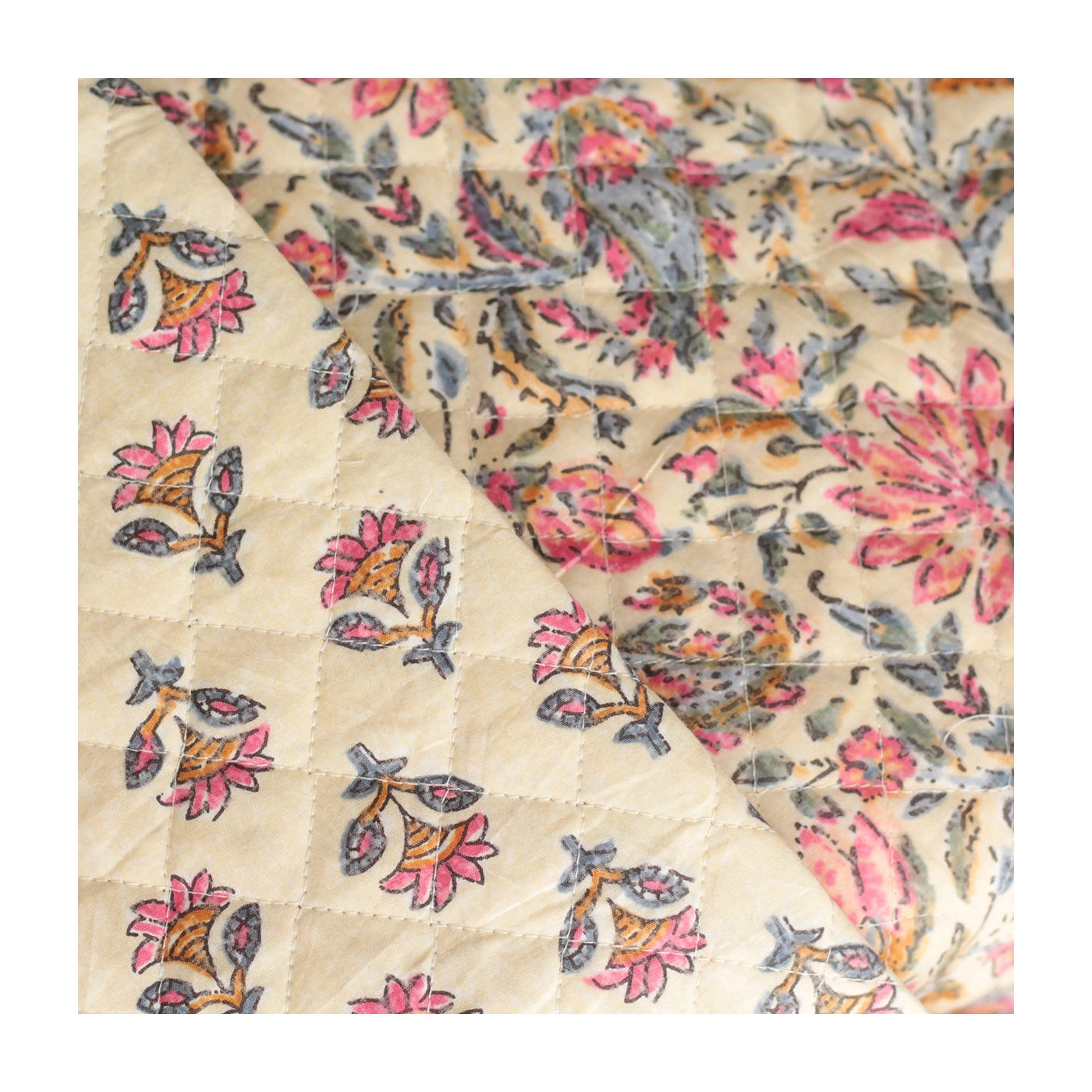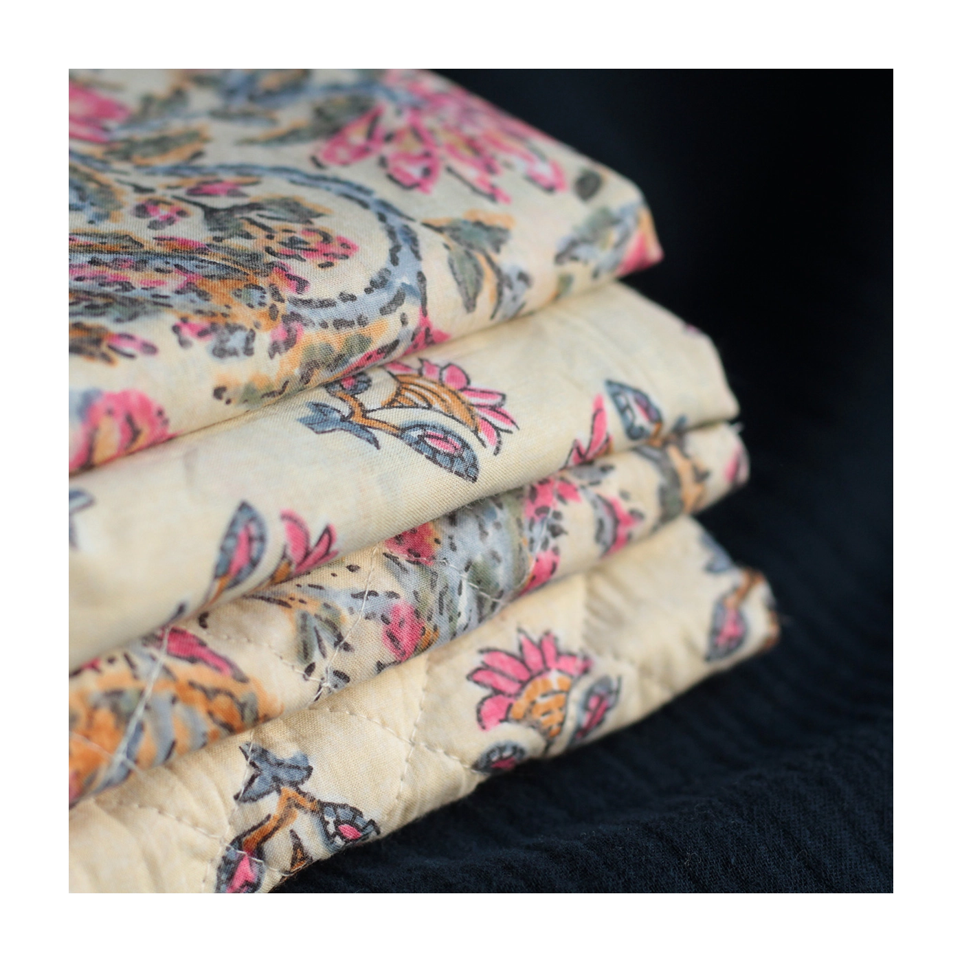 Nous avons décliné cette collection avec nos partenaires en Inde, afin de vous proposer pour le même motif le tissu en coton, et la version double face matelassée.