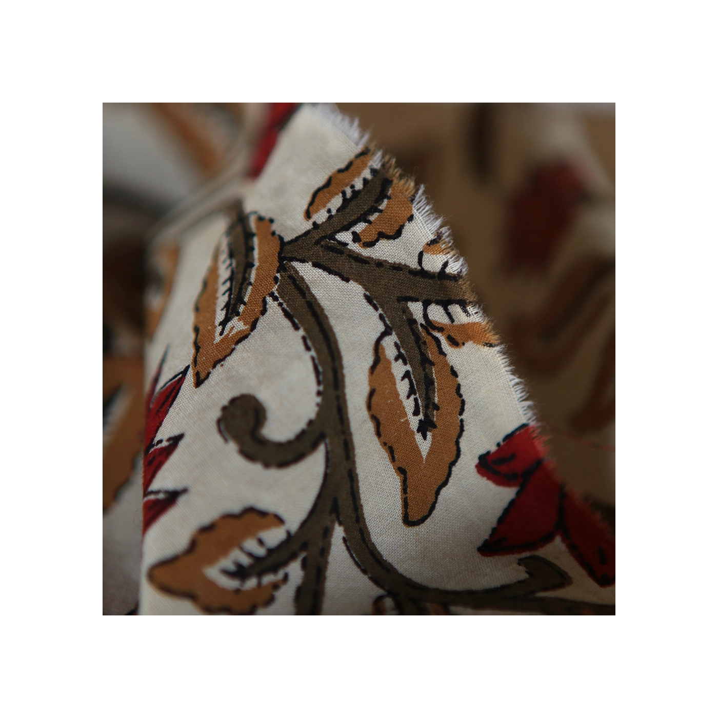 A noter que le processus artisanal (impression à la main, au tampon en bois) de ce tissu fait que chaque pièce est unique et que l'impression n'est pas aussi parfaite qu'un processus industriel.