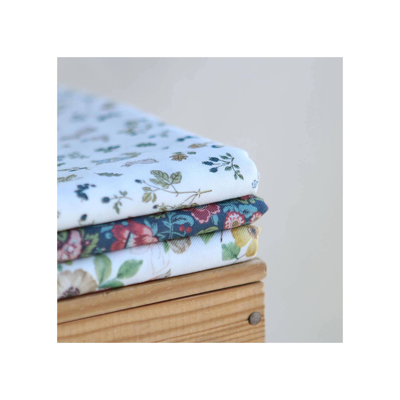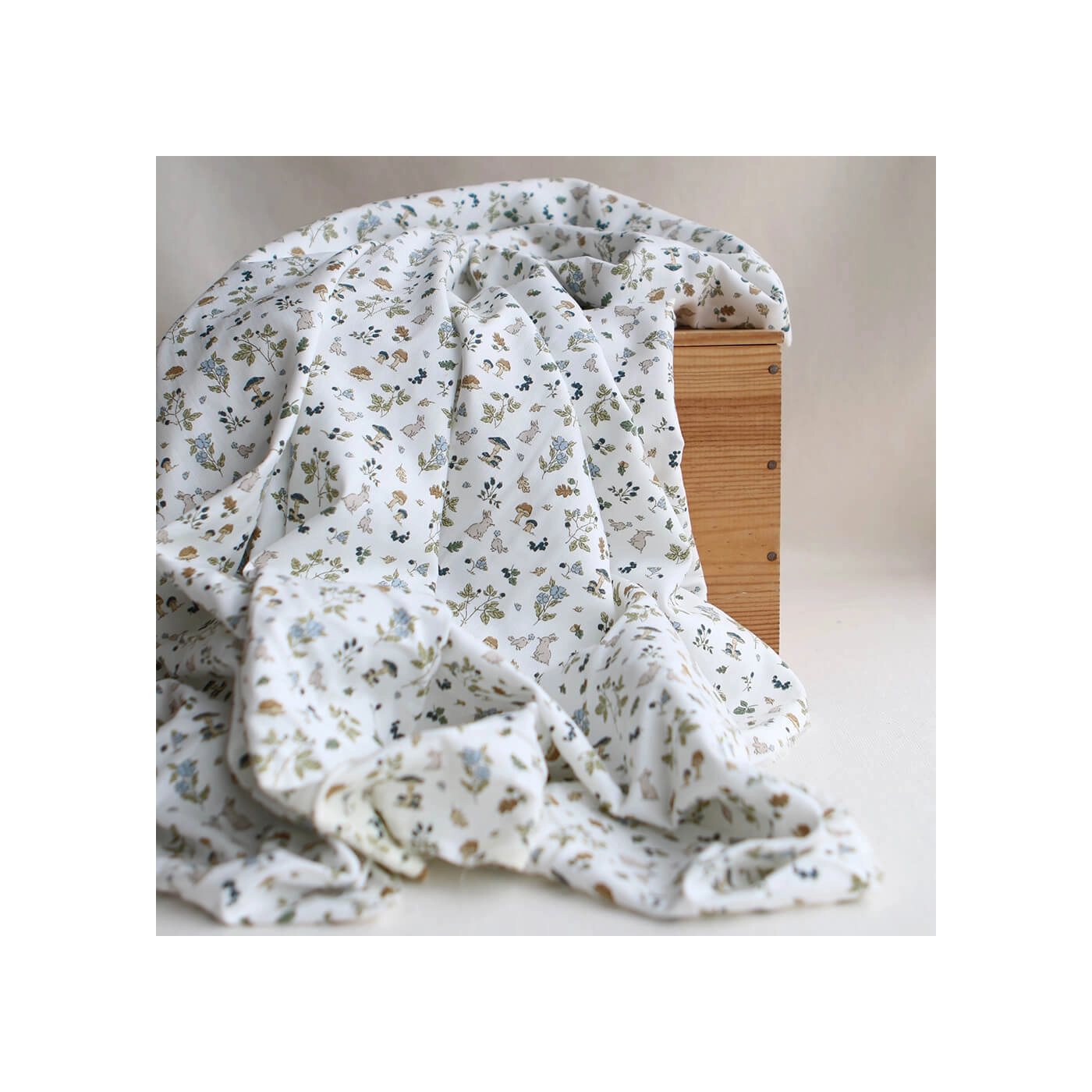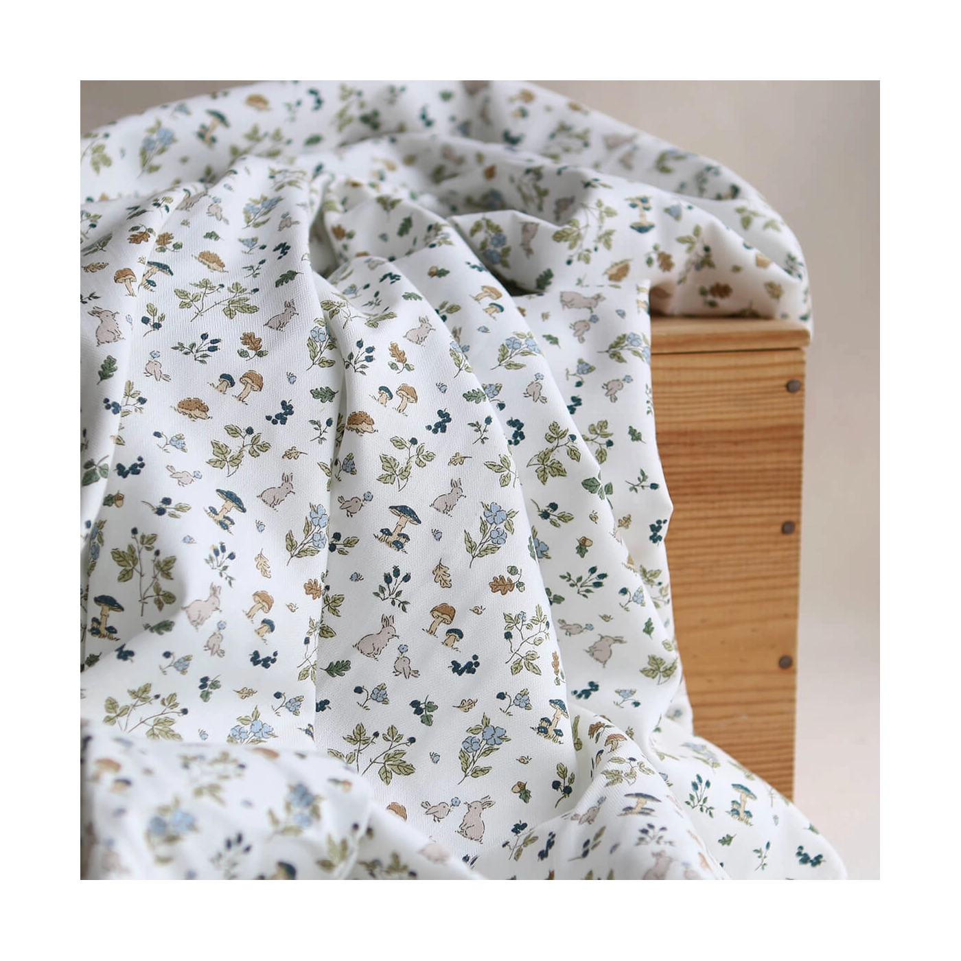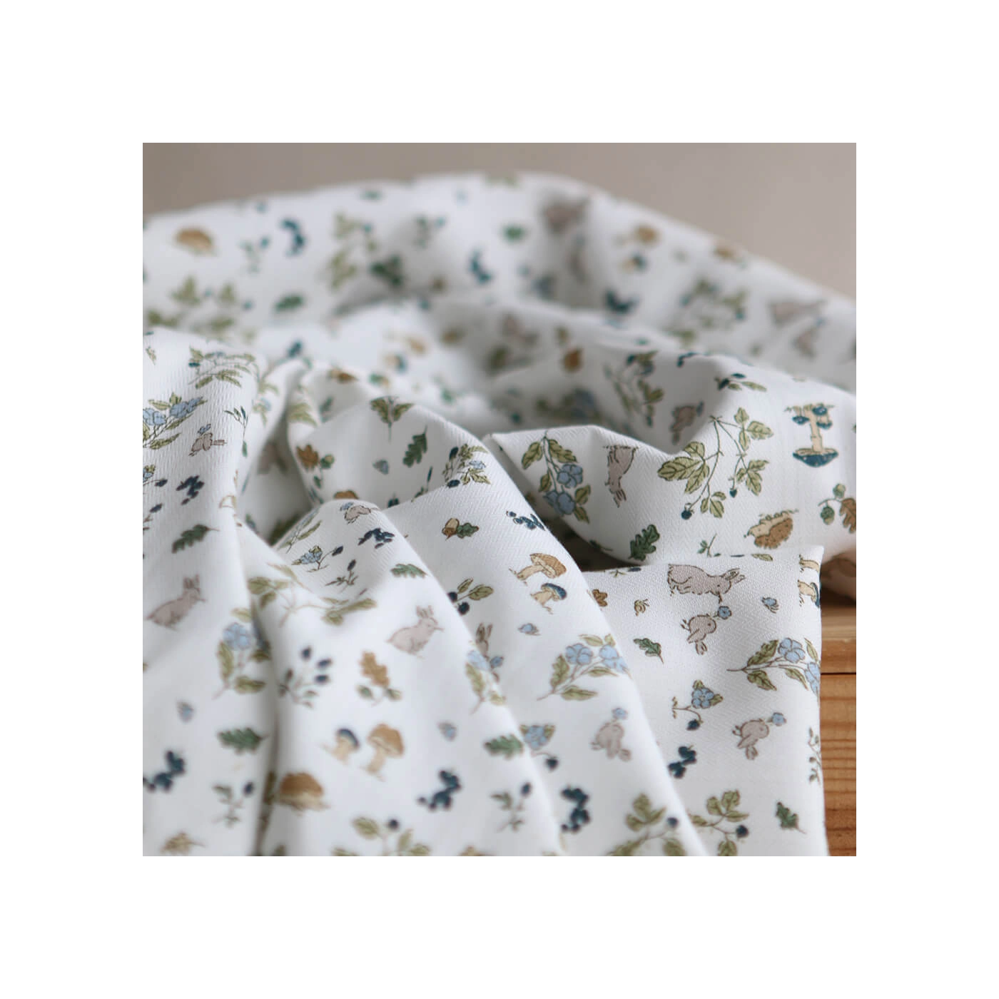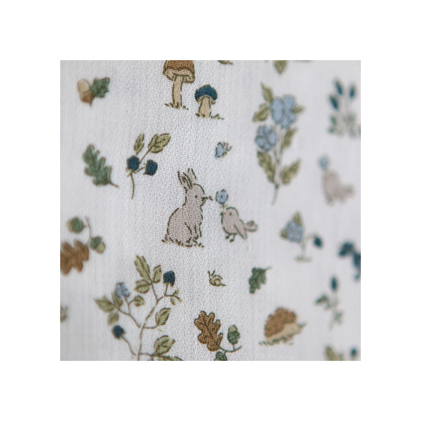 Coloris: fond blanc lait, motif animaux de la forêt teintes bleu marine, bleu, vert et camel