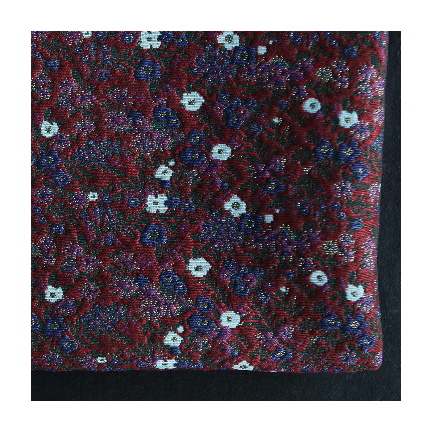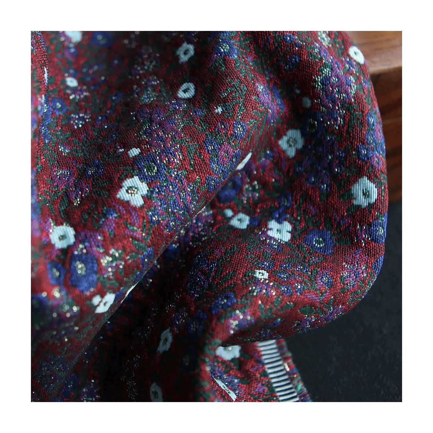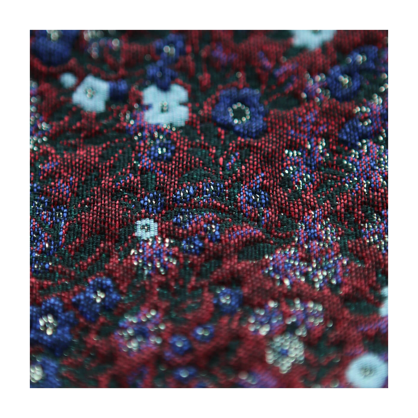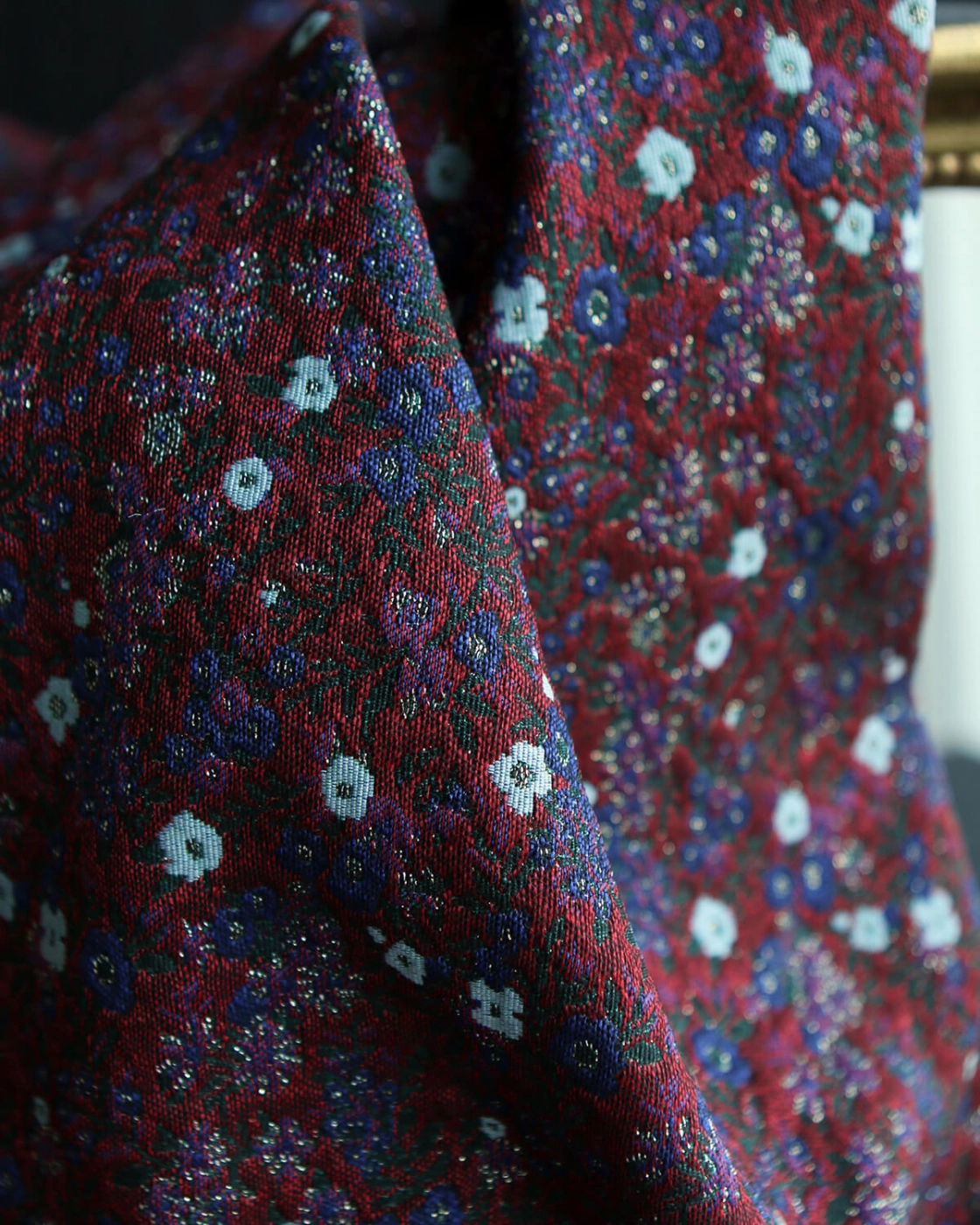 Coupon de 100 cm de Azalée - Tissu jacquard fond rouge / fleuri bleu et doré made in France