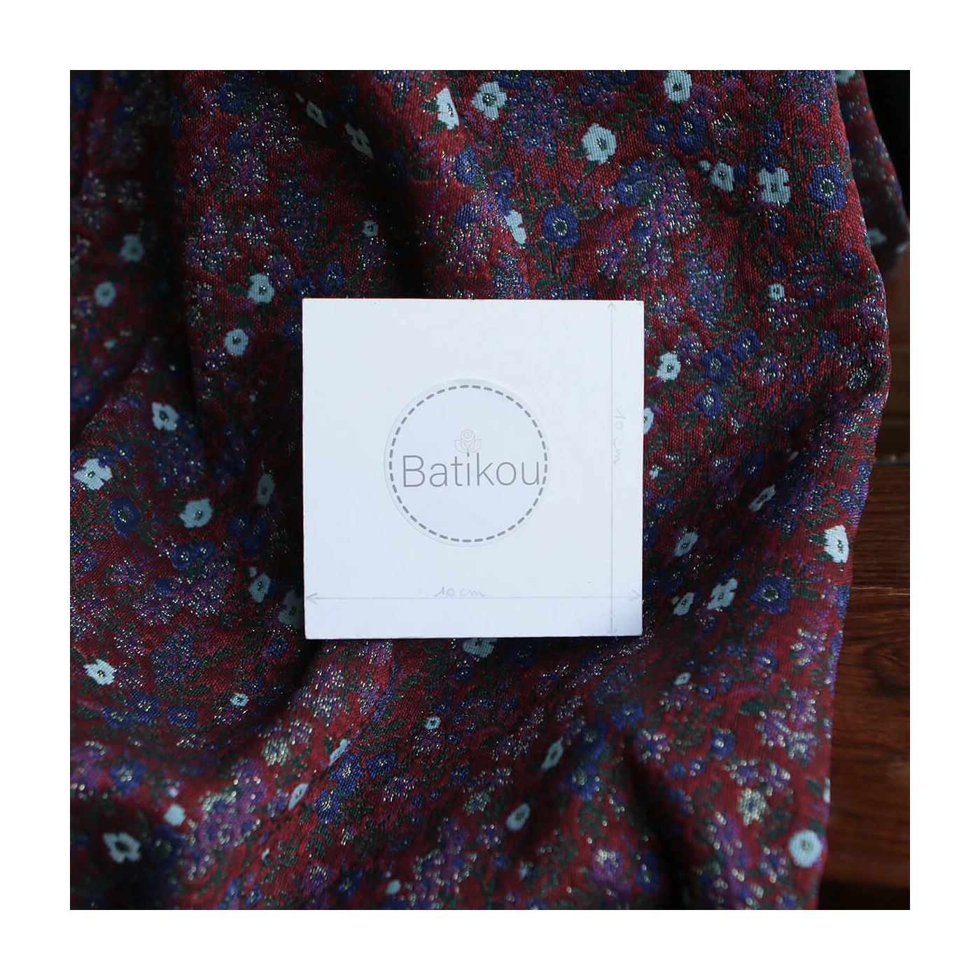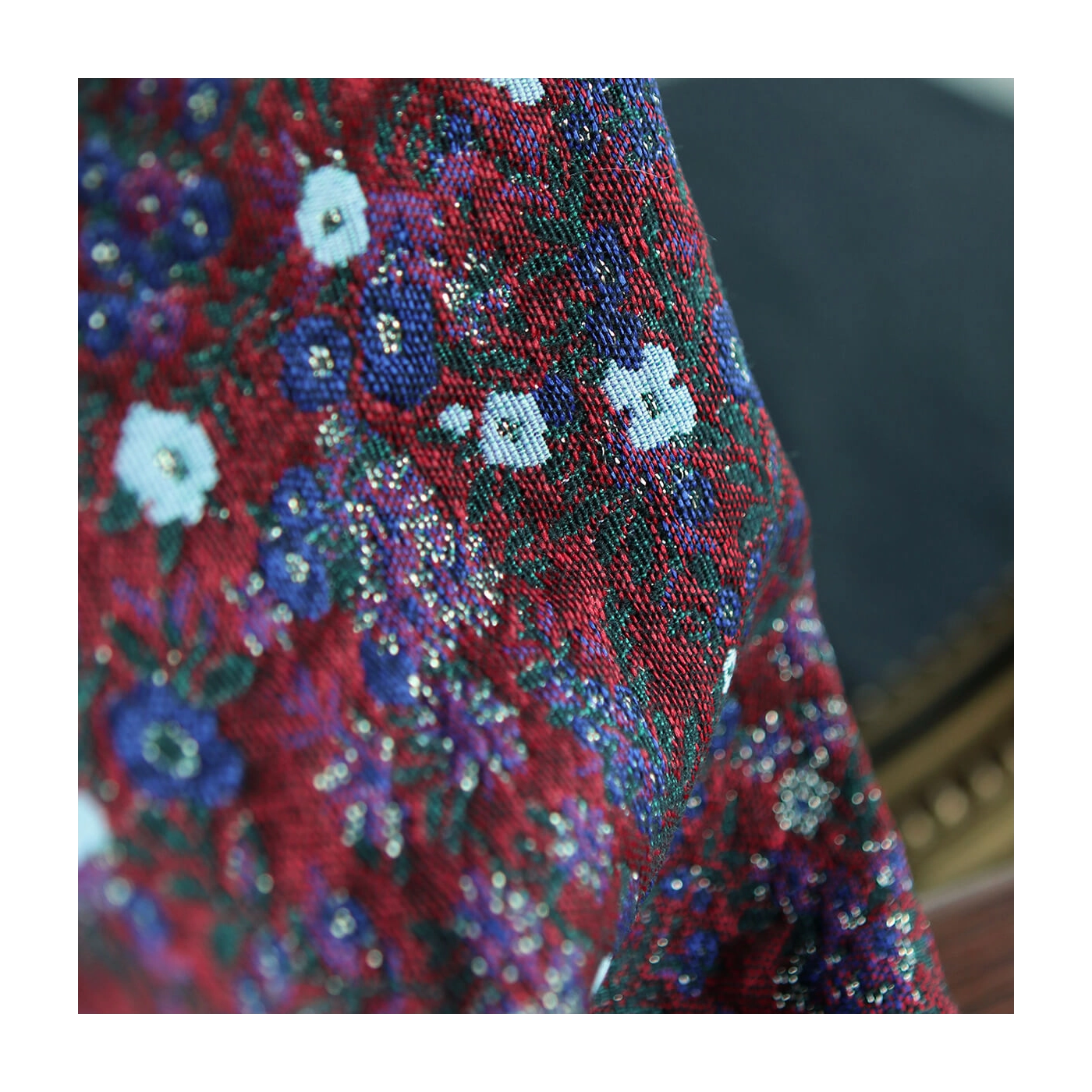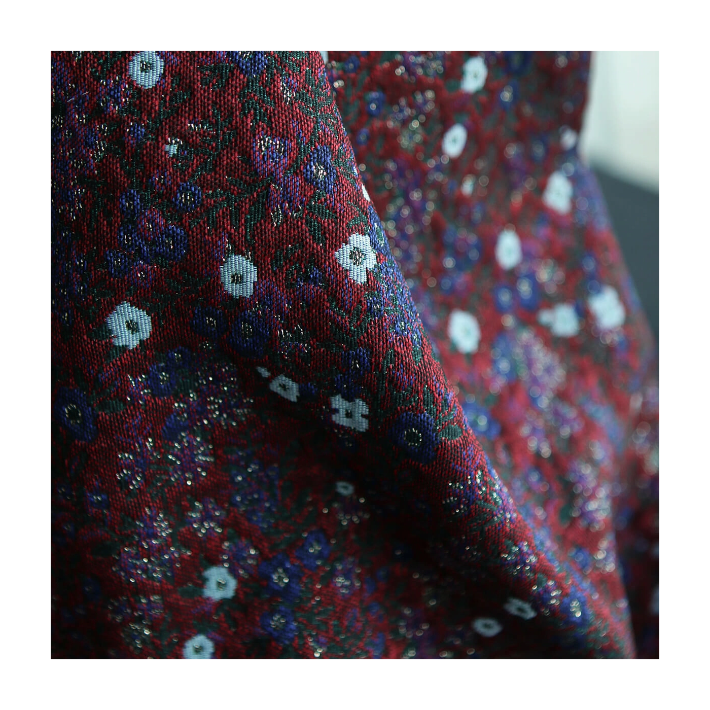 Coupon de 100 cm de Azalée - Tissu jacquard fond rouge / fleuri bleu et doré made in France