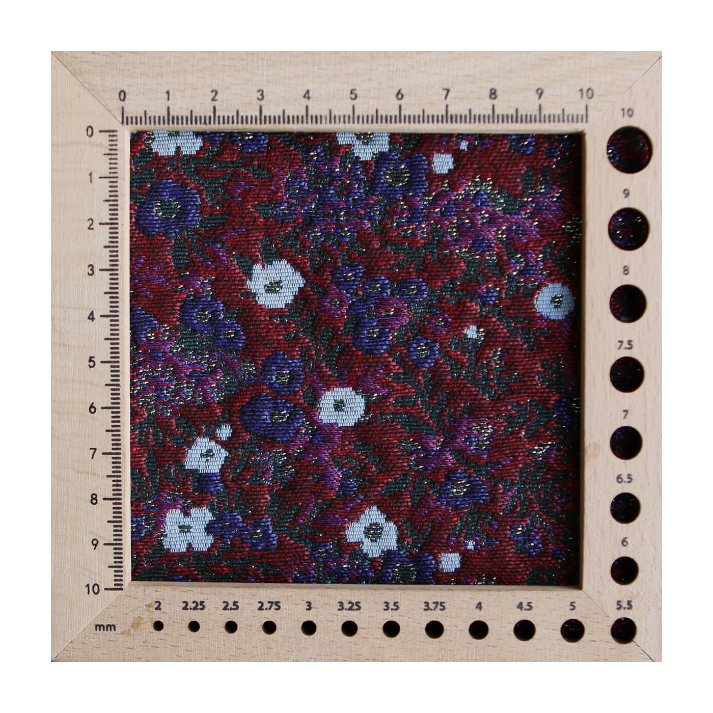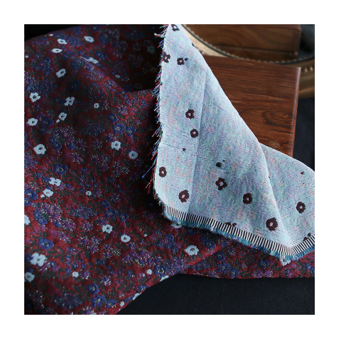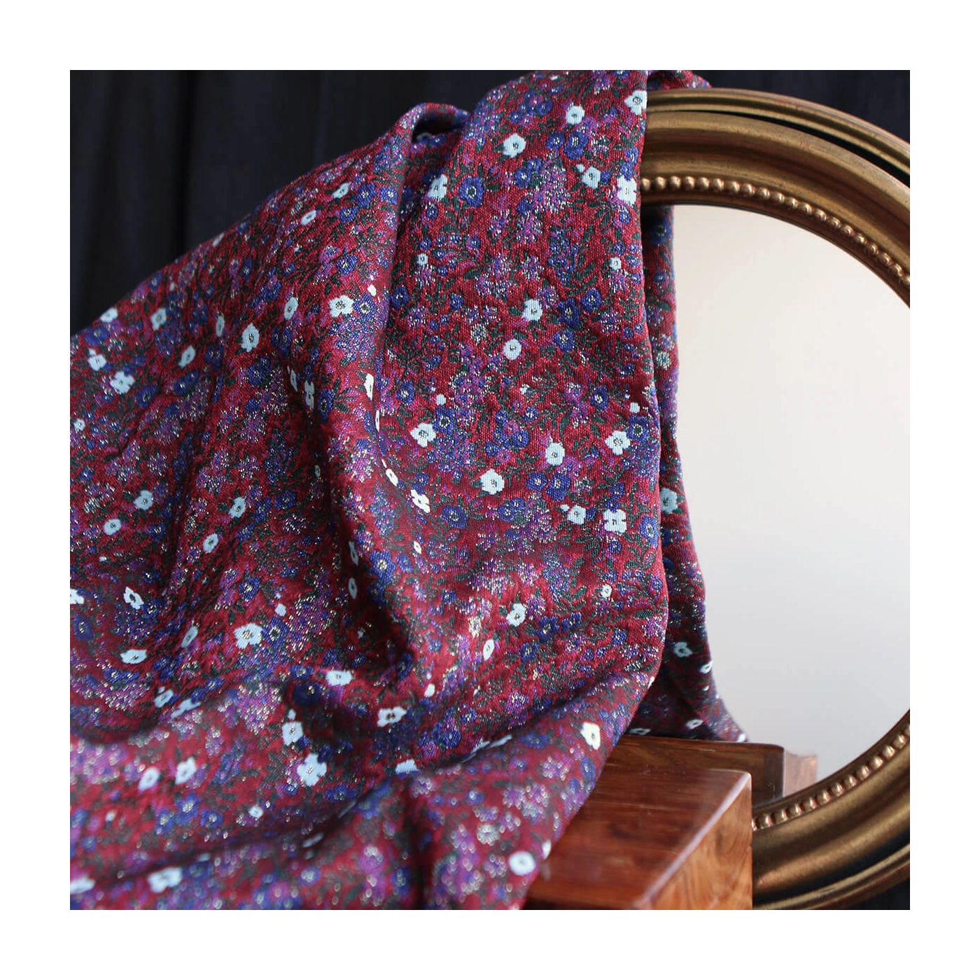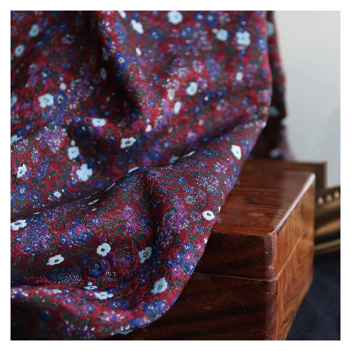 Coupon de 100 cm de Azalée - Tissu jacquard fond rouge / fleuri bleu et doré made in France