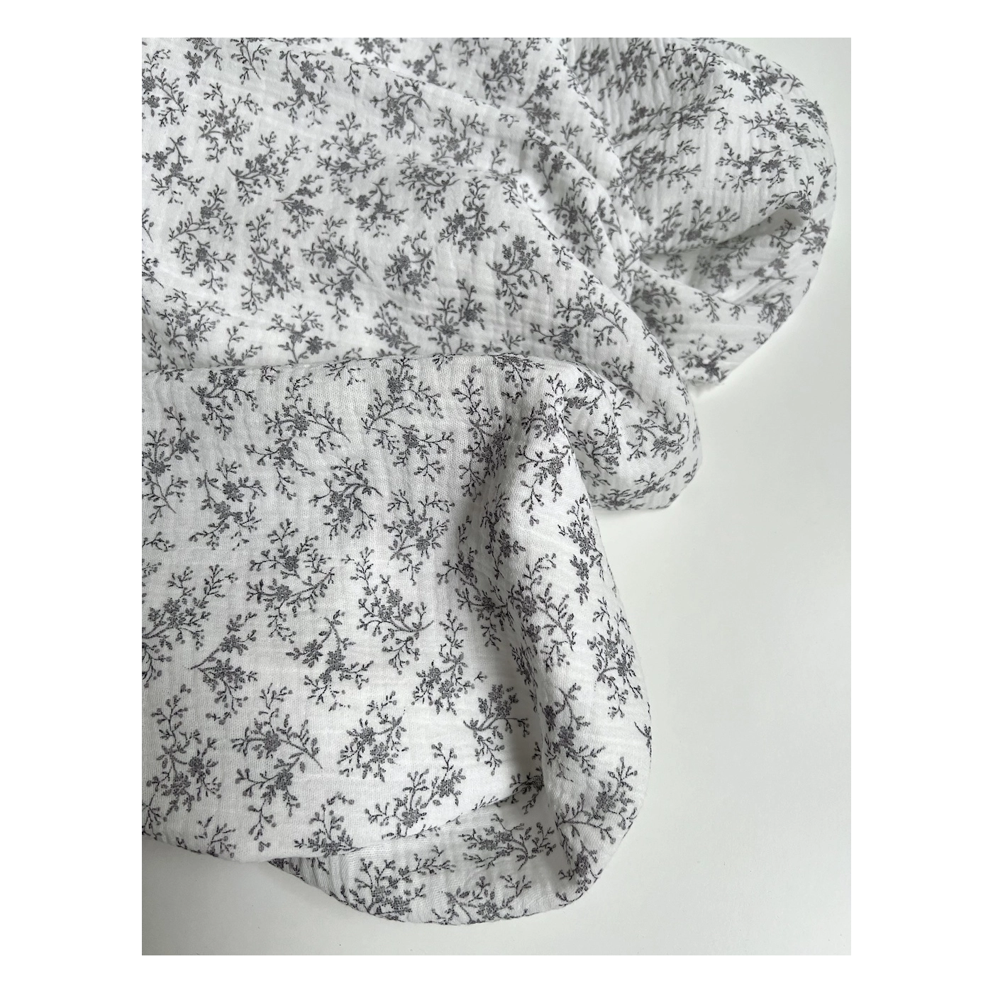 Coupon de 60 cm de Meriem - Double gaze de coton BIO exclusif blanc à motifs fleuris gris