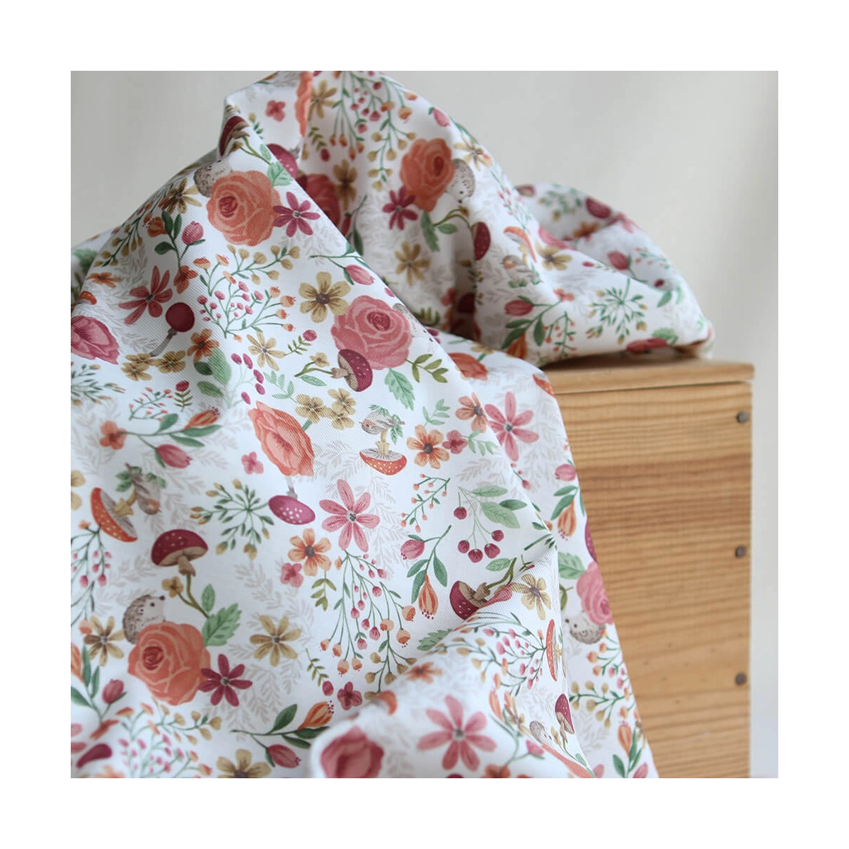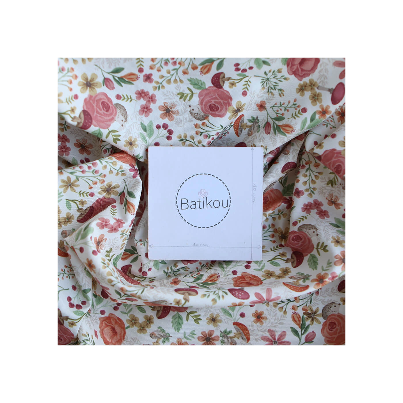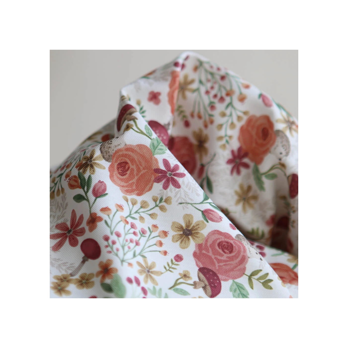 Coloris: fond blanc motif fleuri, champignons et hérissons teintes ocre, vert et bordeaux