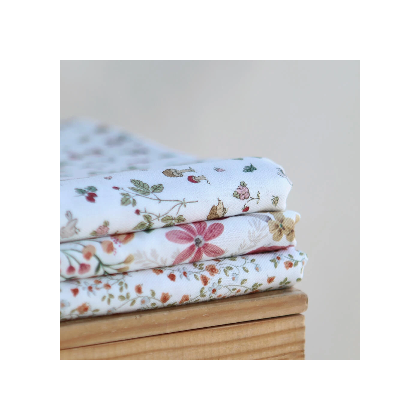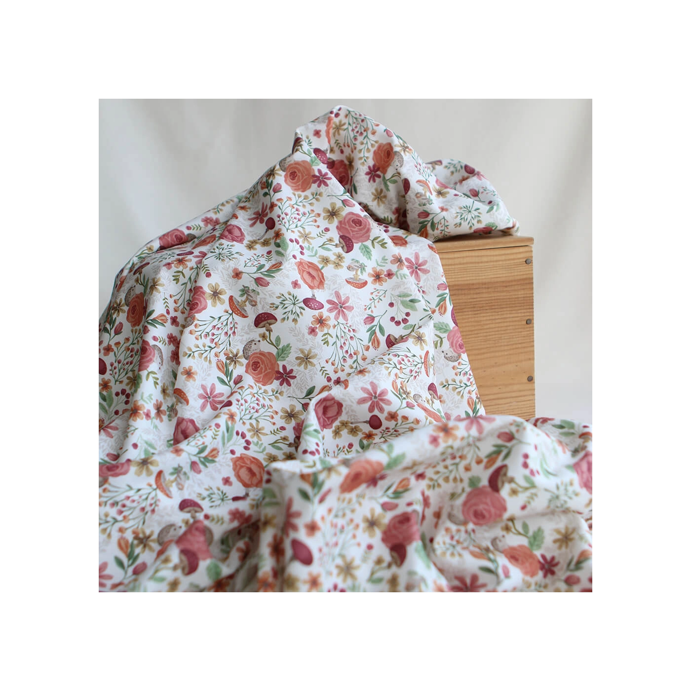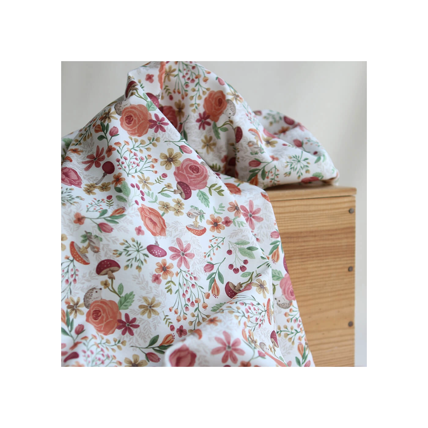 Coloris: fond blanc motif fleuri, champignons et hérissons teintes ocre, vert et bordeaux