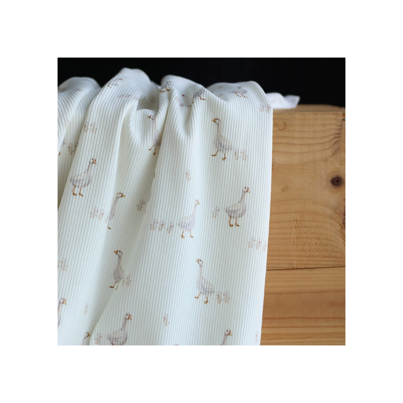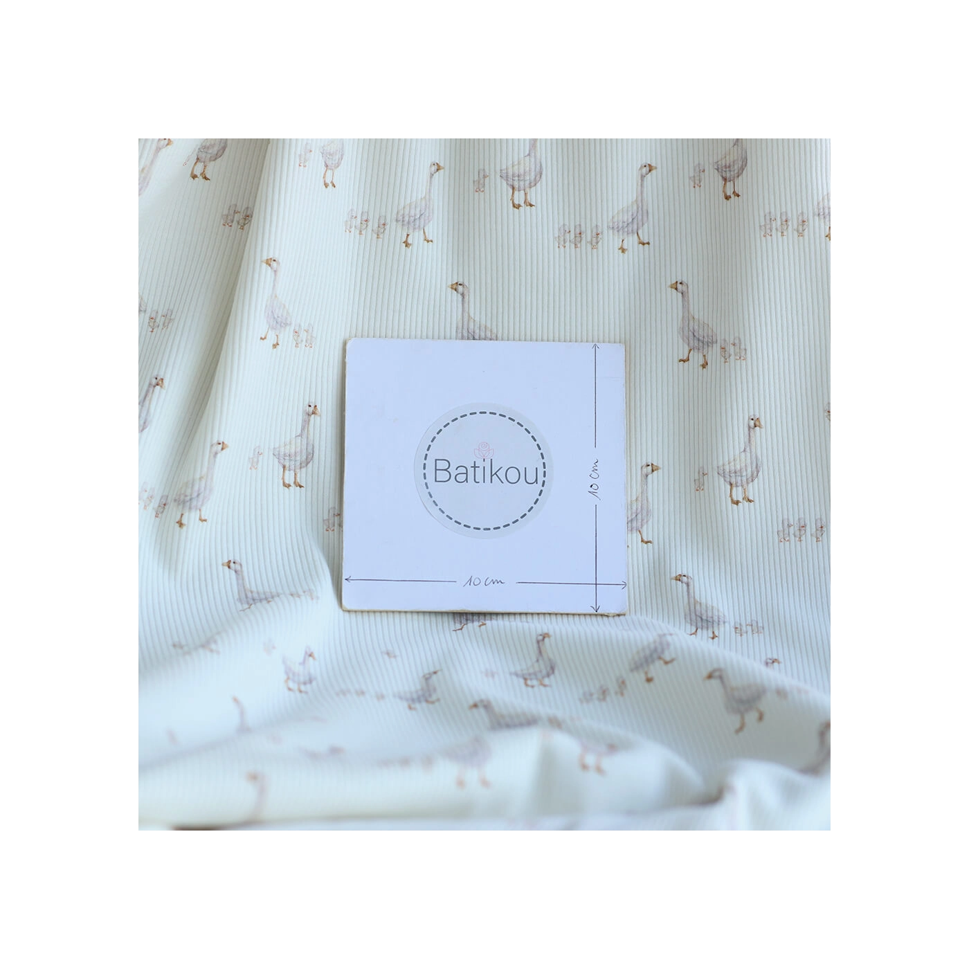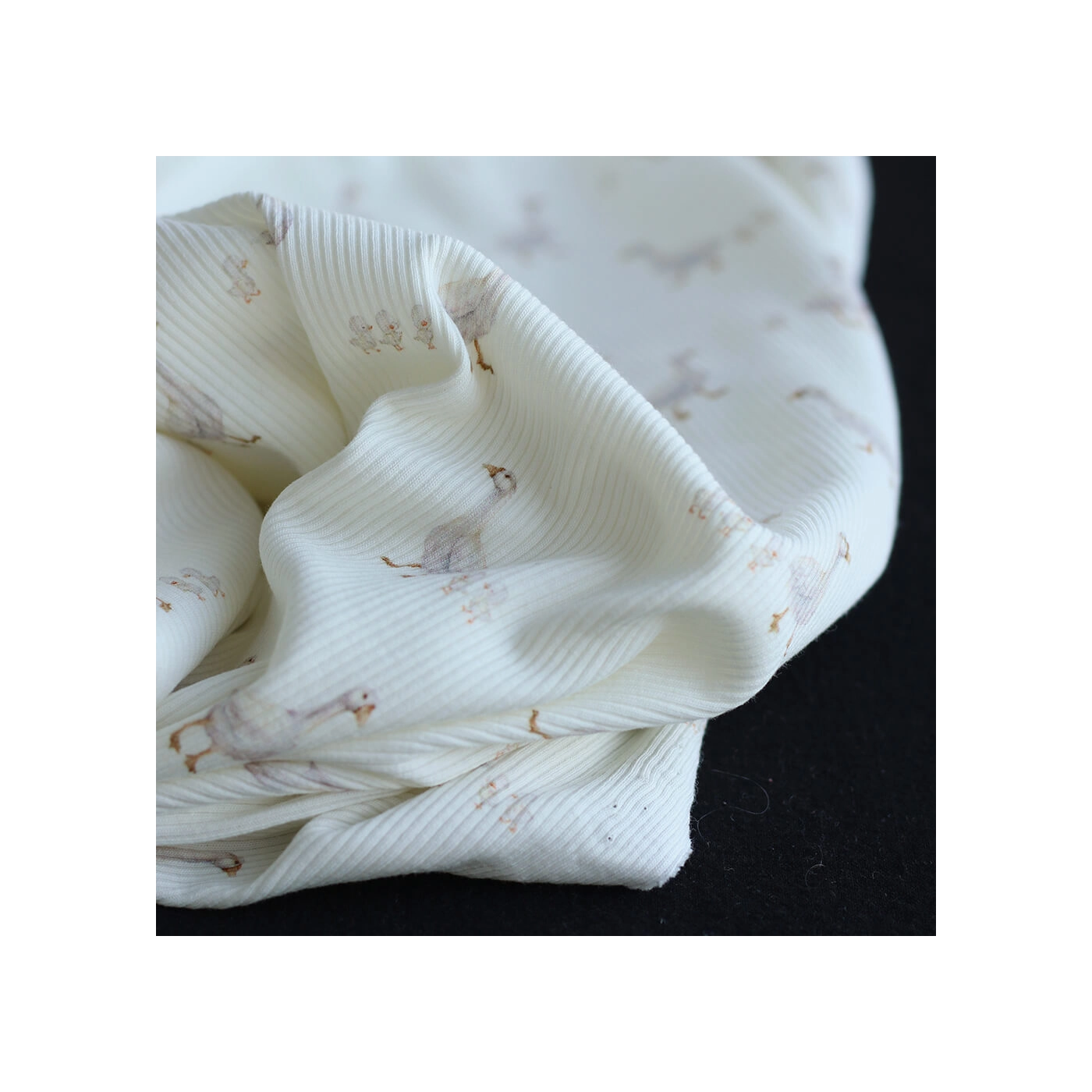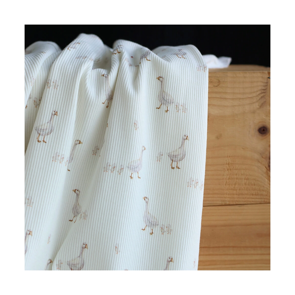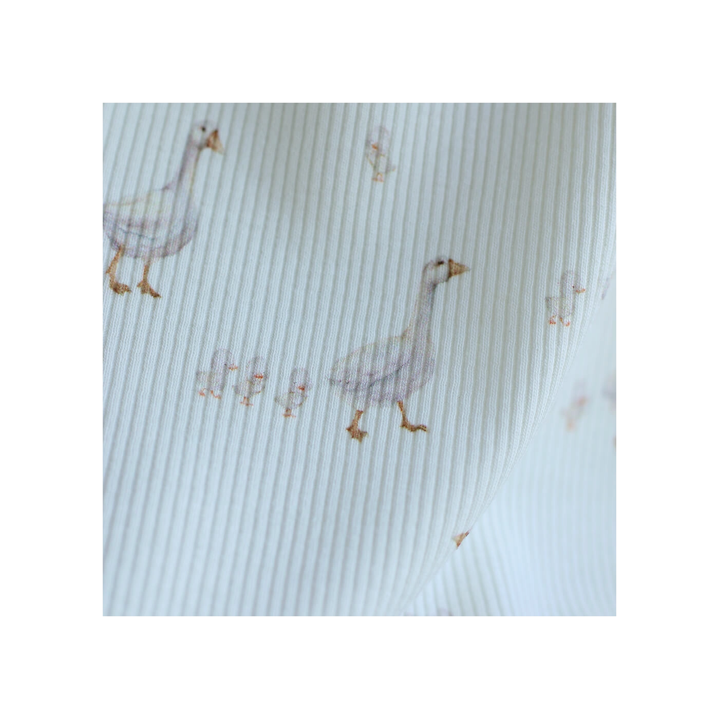 Avec son fond lait lumineux, son motif petites oies plein de douceur et sa structure en fines côtes, ce tissu est un très beau choix pour des créations confortables, délicates et intemporelles.