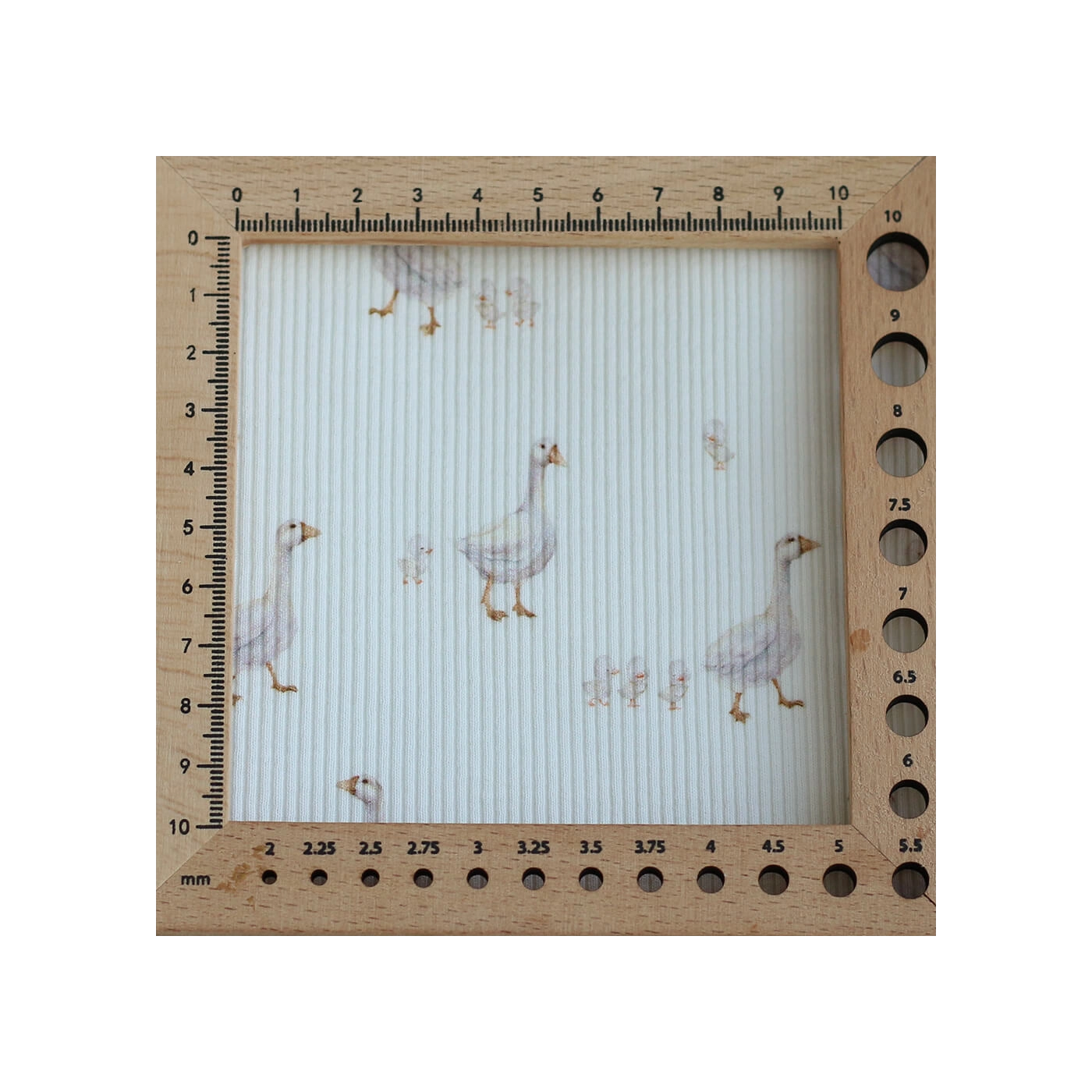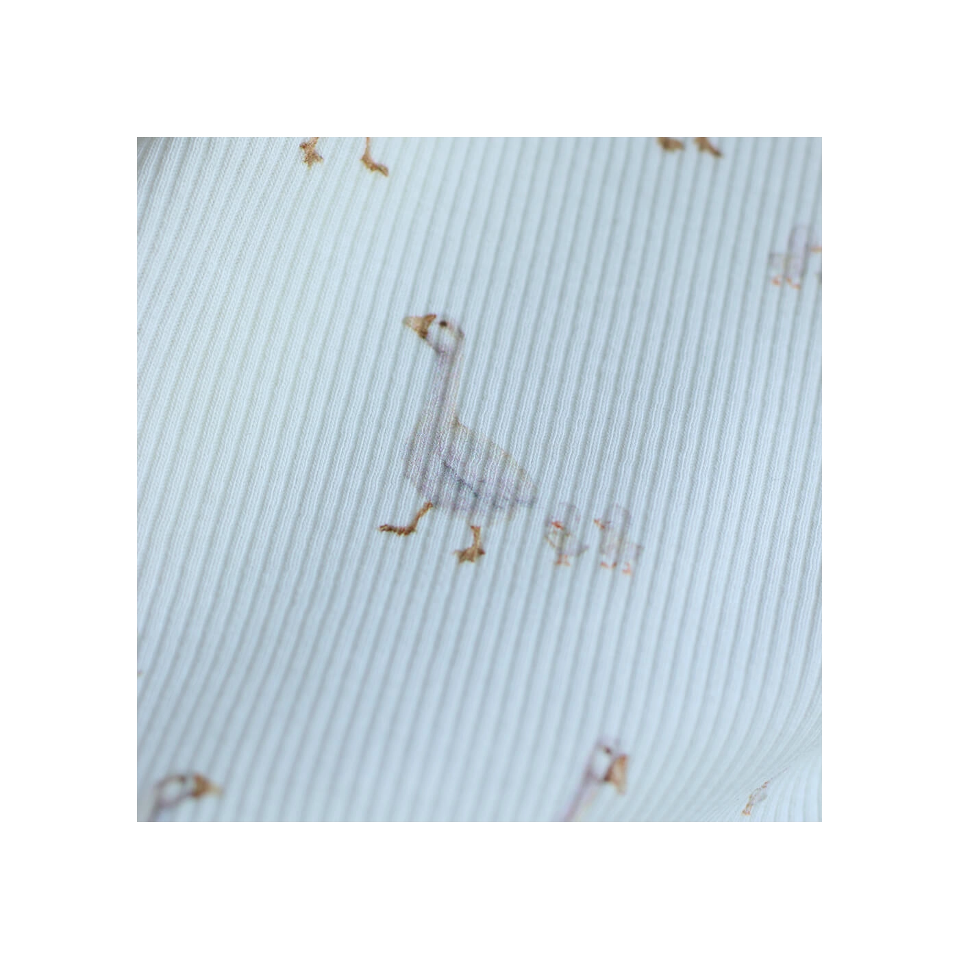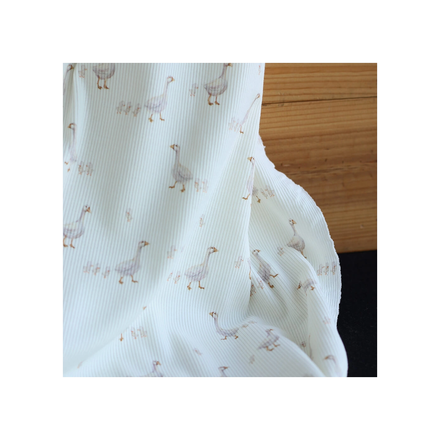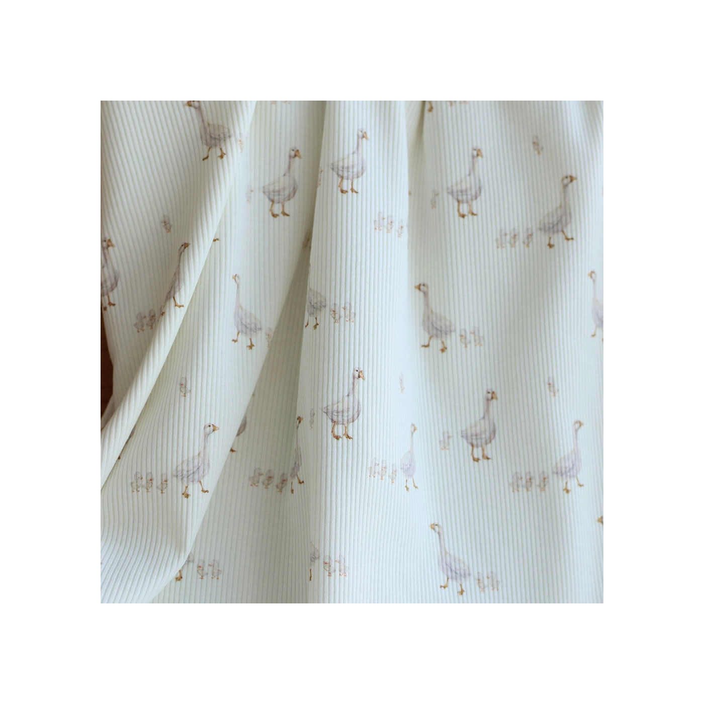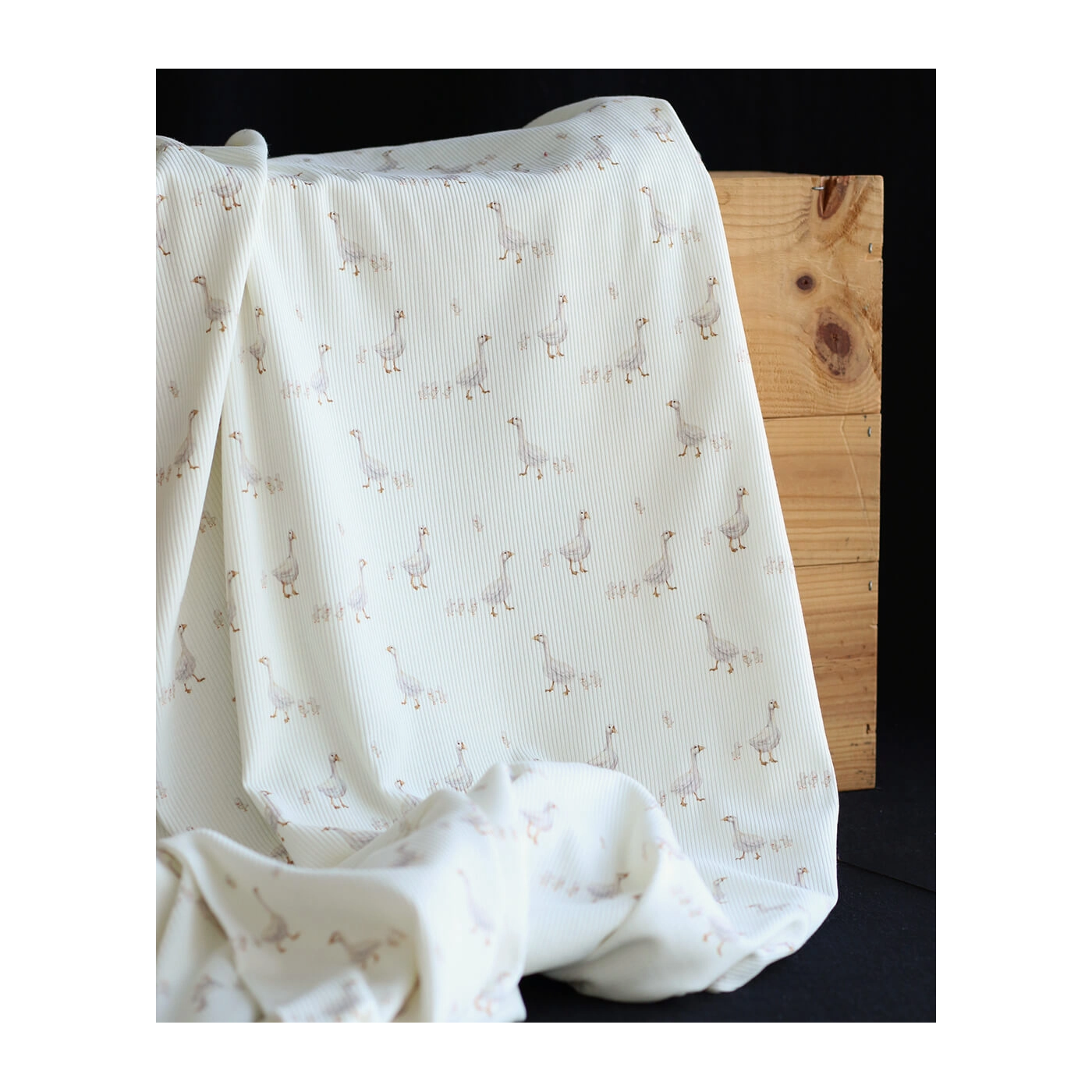 Avec son fond lait lumineux, son motif petites oies plein de douceur et sa structure en fines côtes, ce tissu est un très beau choix pour des créations confortables, délicates et intemporelles.