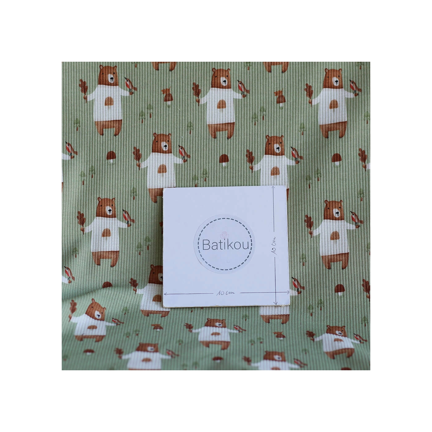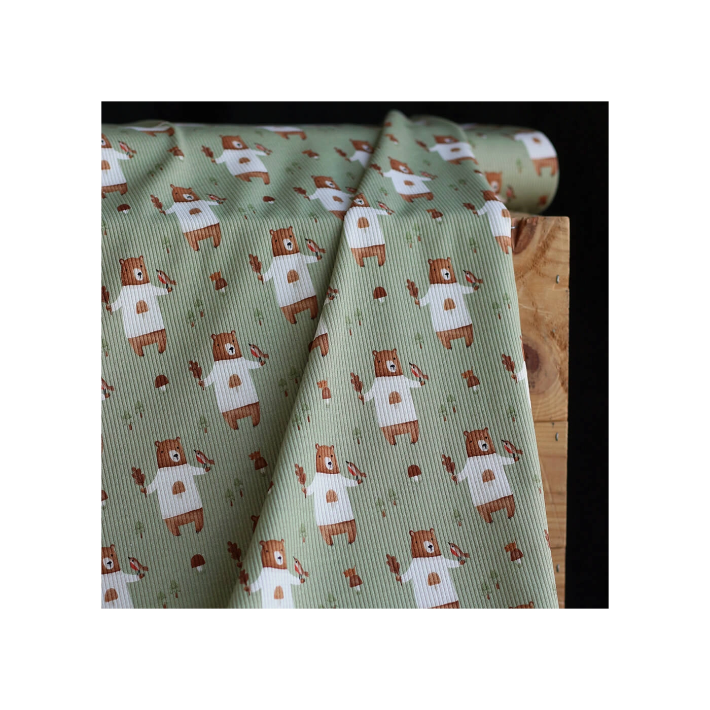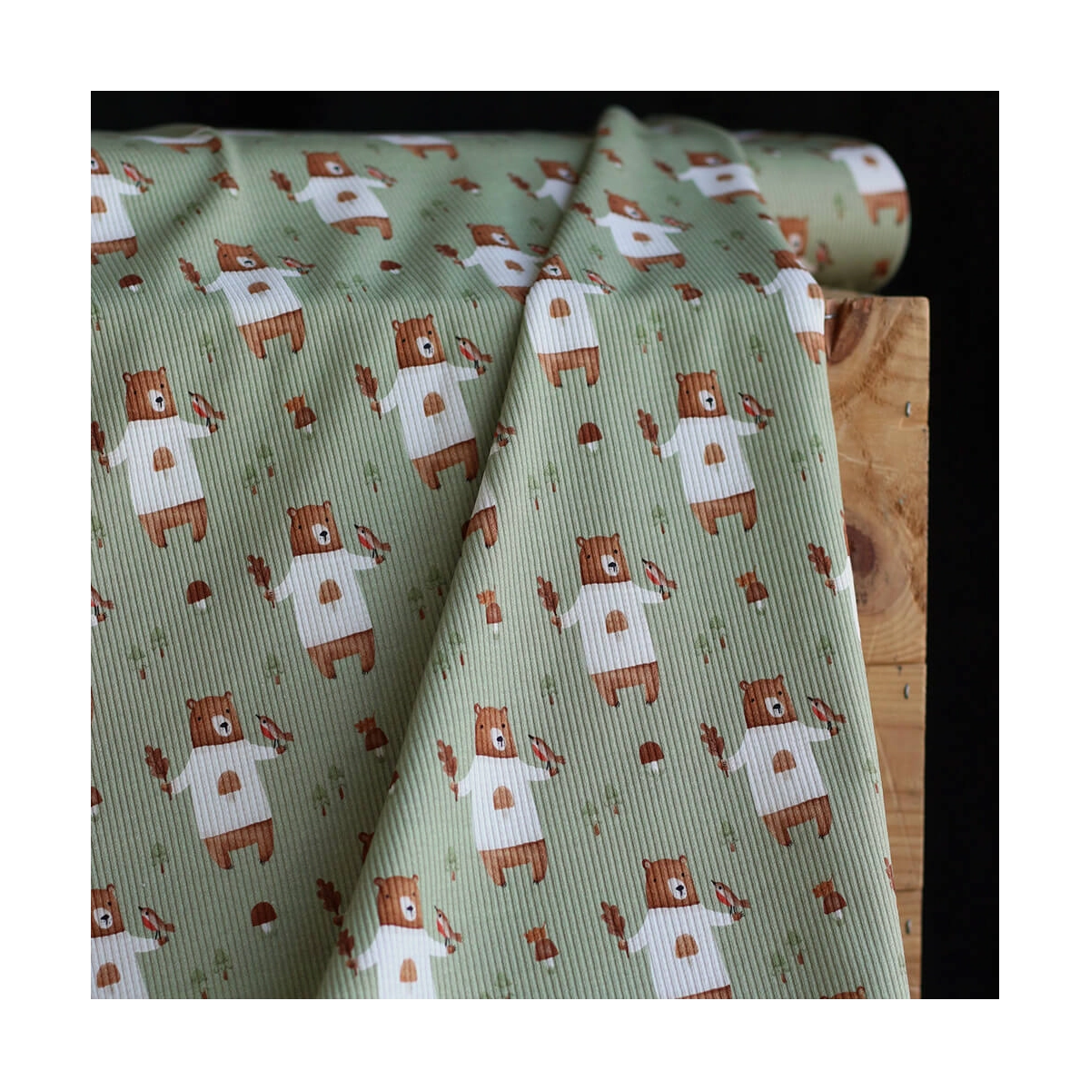 Avec son fond vert sauge, son motif ours plein de tendresse et sa structure en fines côtes, ce tissu est un très beau choix pour des créations confortables, douces et intemporelles.