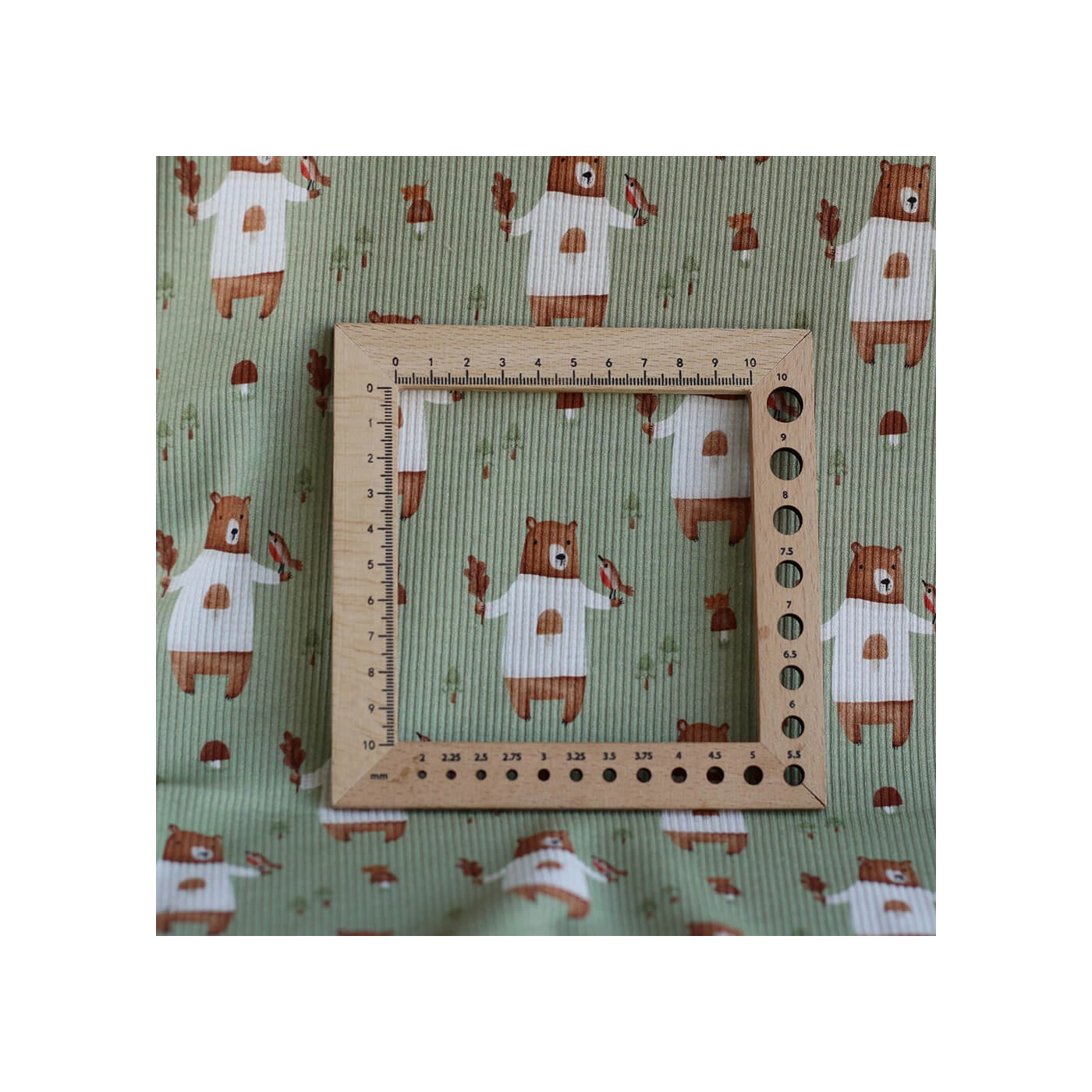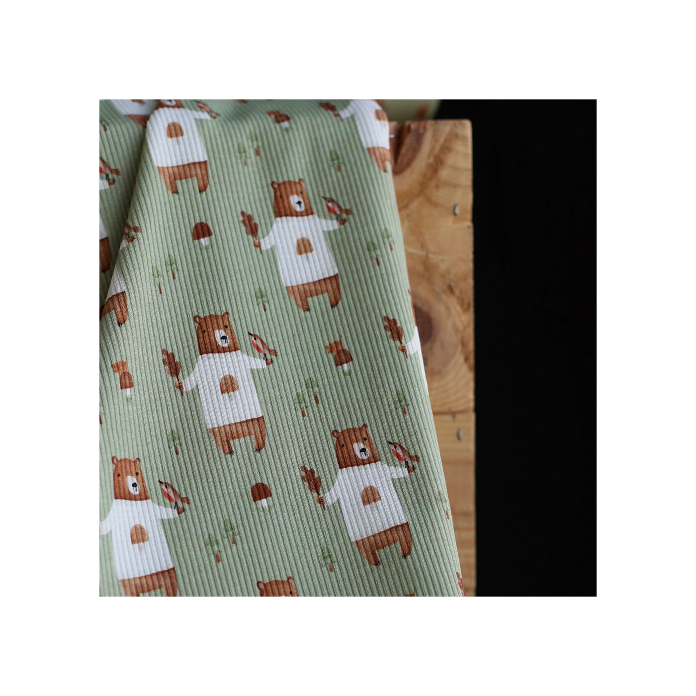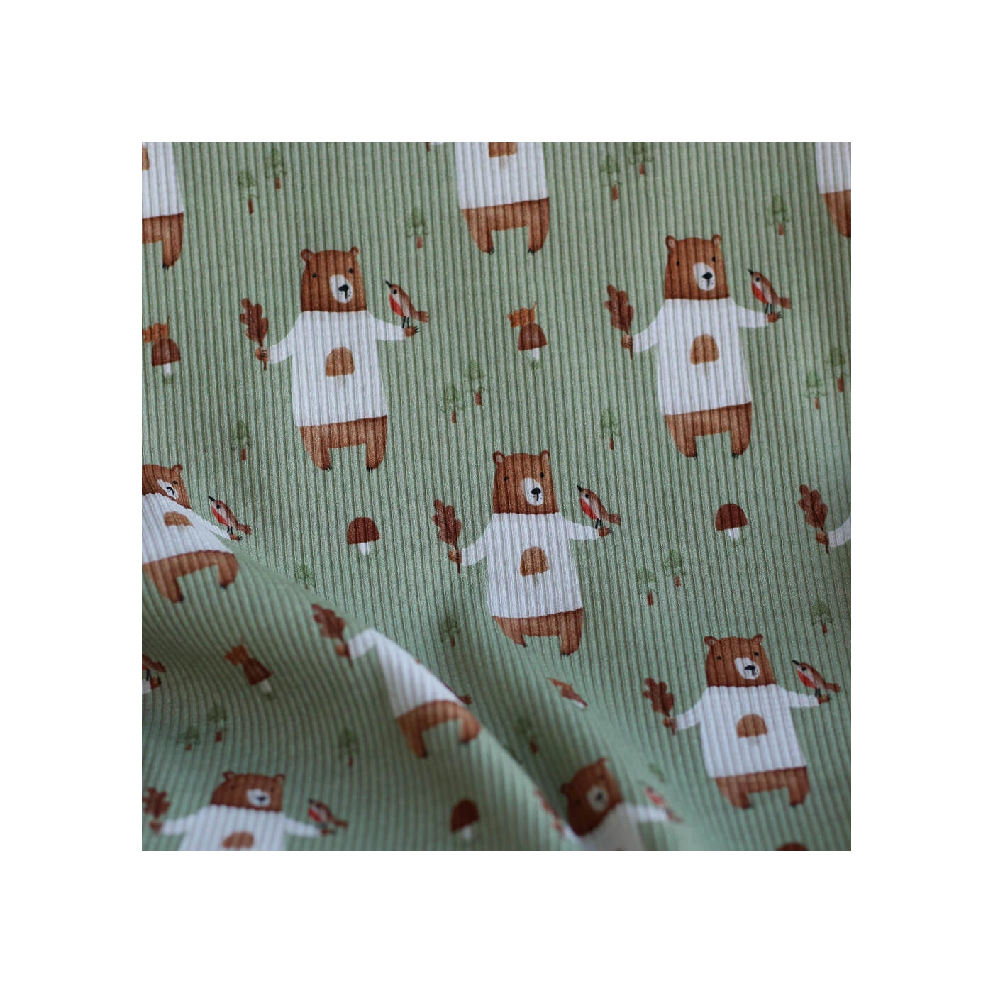 Avec son fond vert sauge, son motif ours plein de tendresse et sa structure en fines côtes, ce tissu est un très beau choix pour des créations confortables, douces et intemporelles.